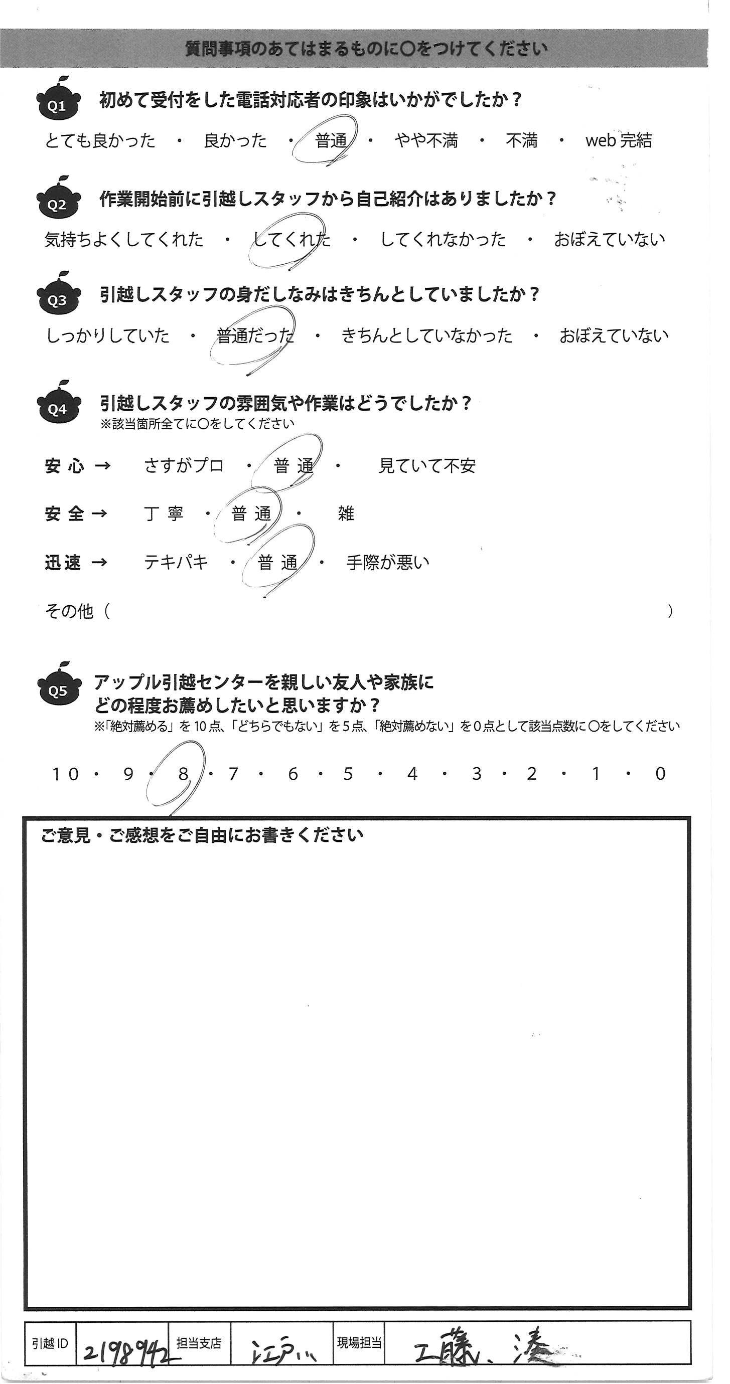 A.引越し先への到着時間が当初の想定より1時間以上遅れてた点が気になりました。 道の混みによる影響かもしれませんが、事前の電話や理由説明が不足していた点が少し残念でした。 また、粗大ゴミに出すためにベッドの解体をお願いしておりましたが、一部解体できておらず結局自身で残りの解体を進めました。 webで質問した際にすぐ返信がきたり、web上で全て完結できる点はとてもよかったです!