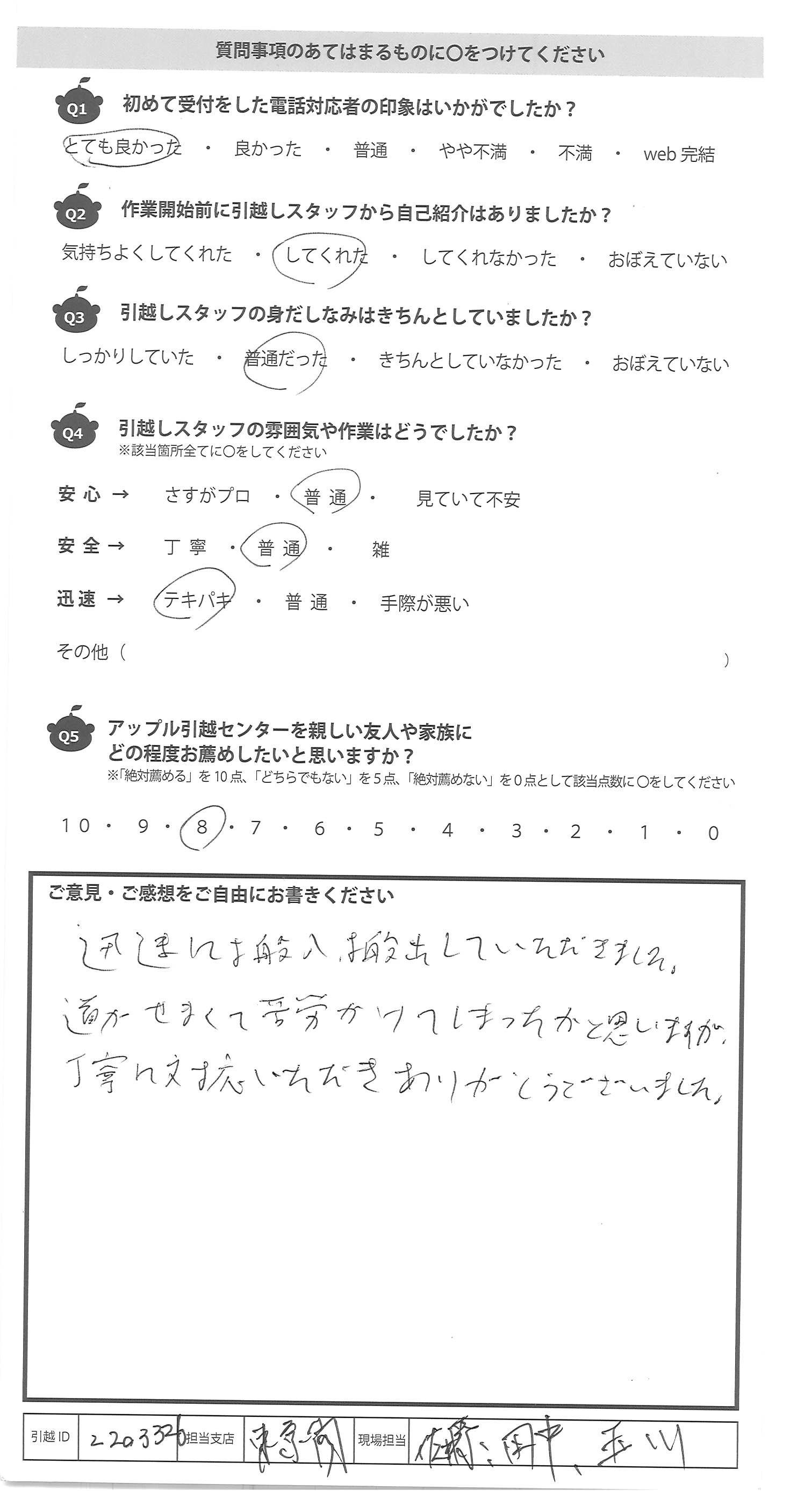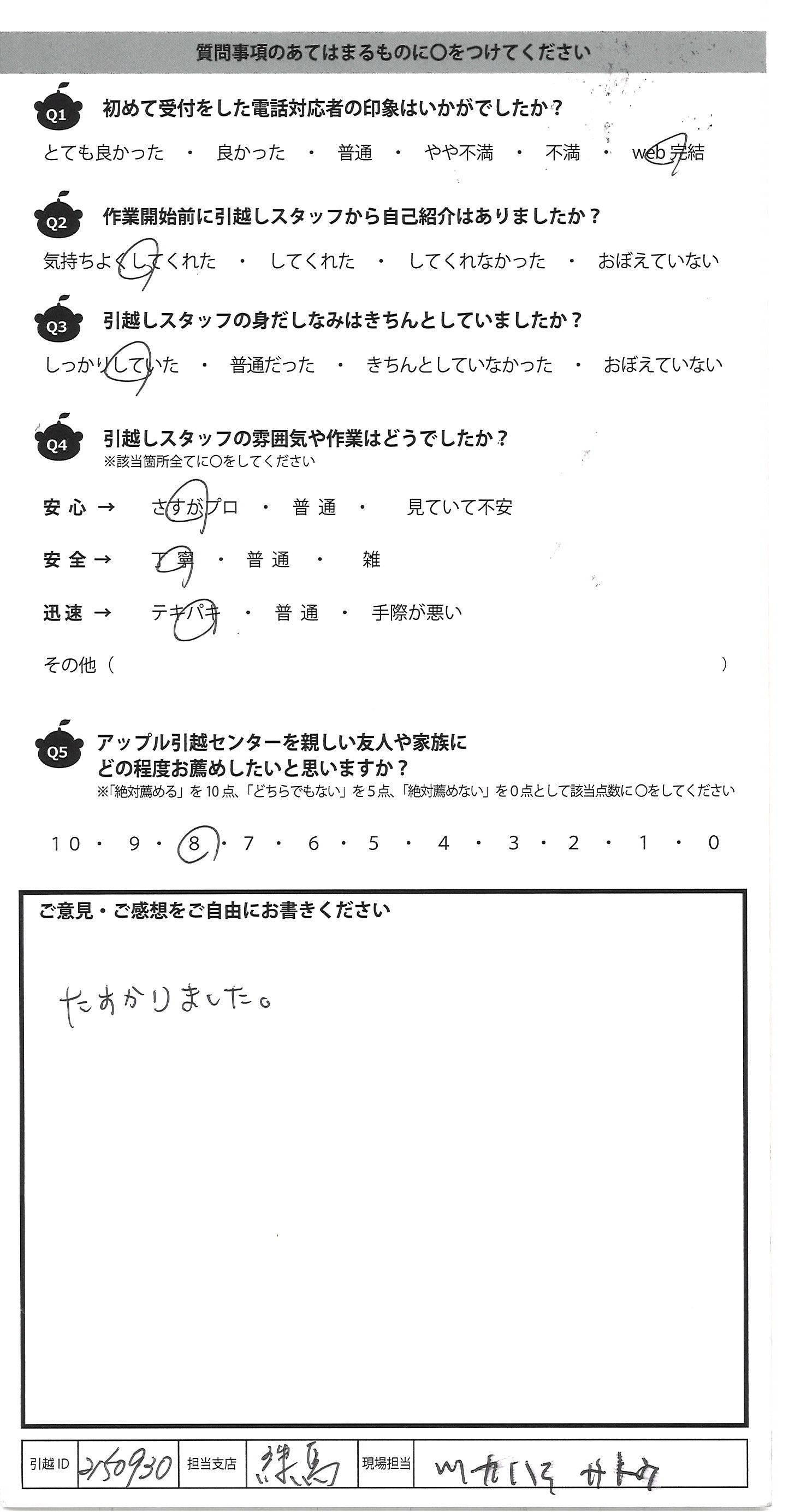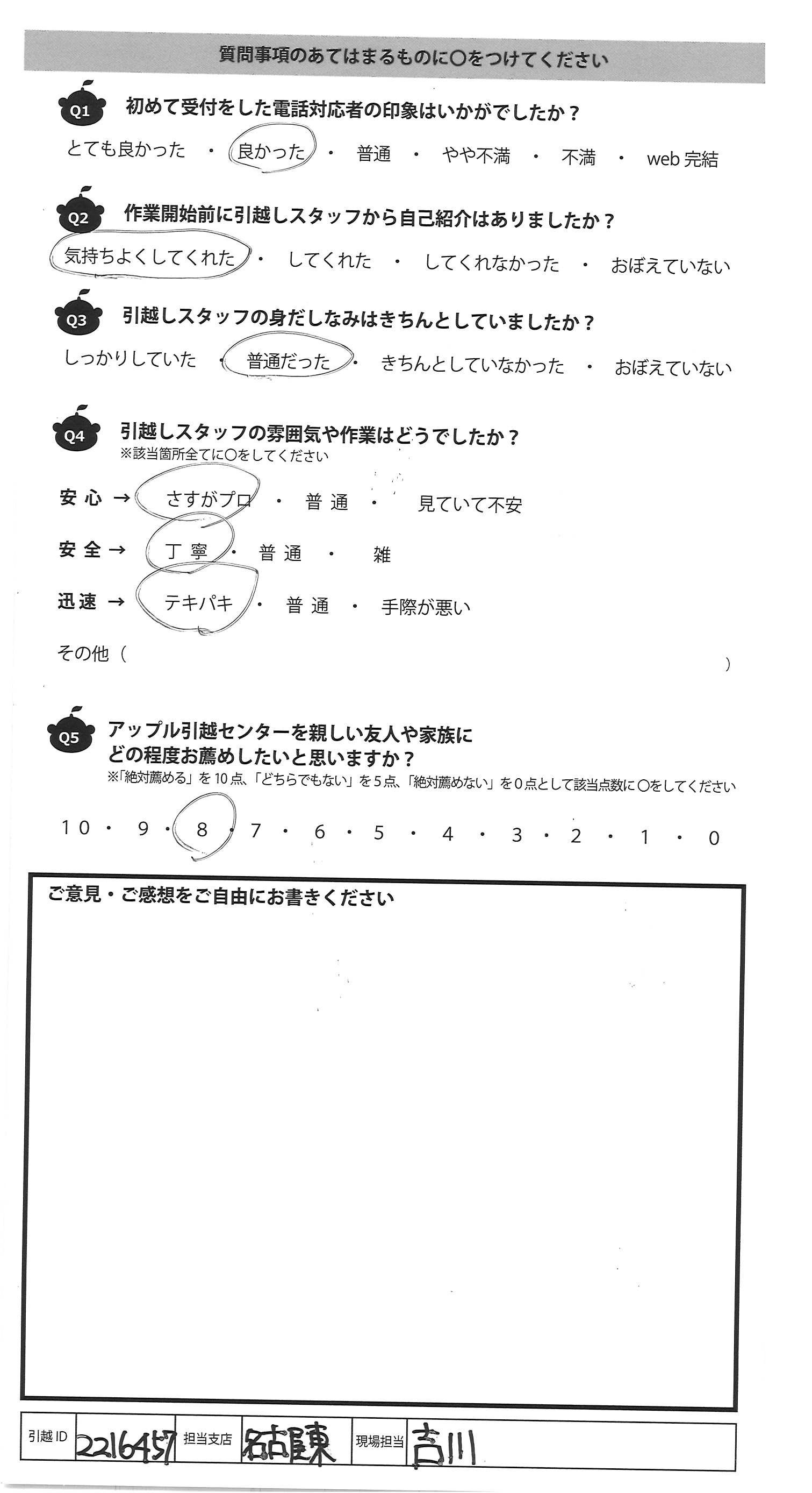 A.子どもが引越しの時、2回程利用していましたの で、安心しておまかせ出来ましたが、 今回の担当の方々も礼儀正しく、荷物も ていねいに運んで下さった上、梱包 の仕方をほめて下さって、とてもうれしく なりました。6月にも、2回目の引越しが ありますので、おまかせ出来ればと思い ます。