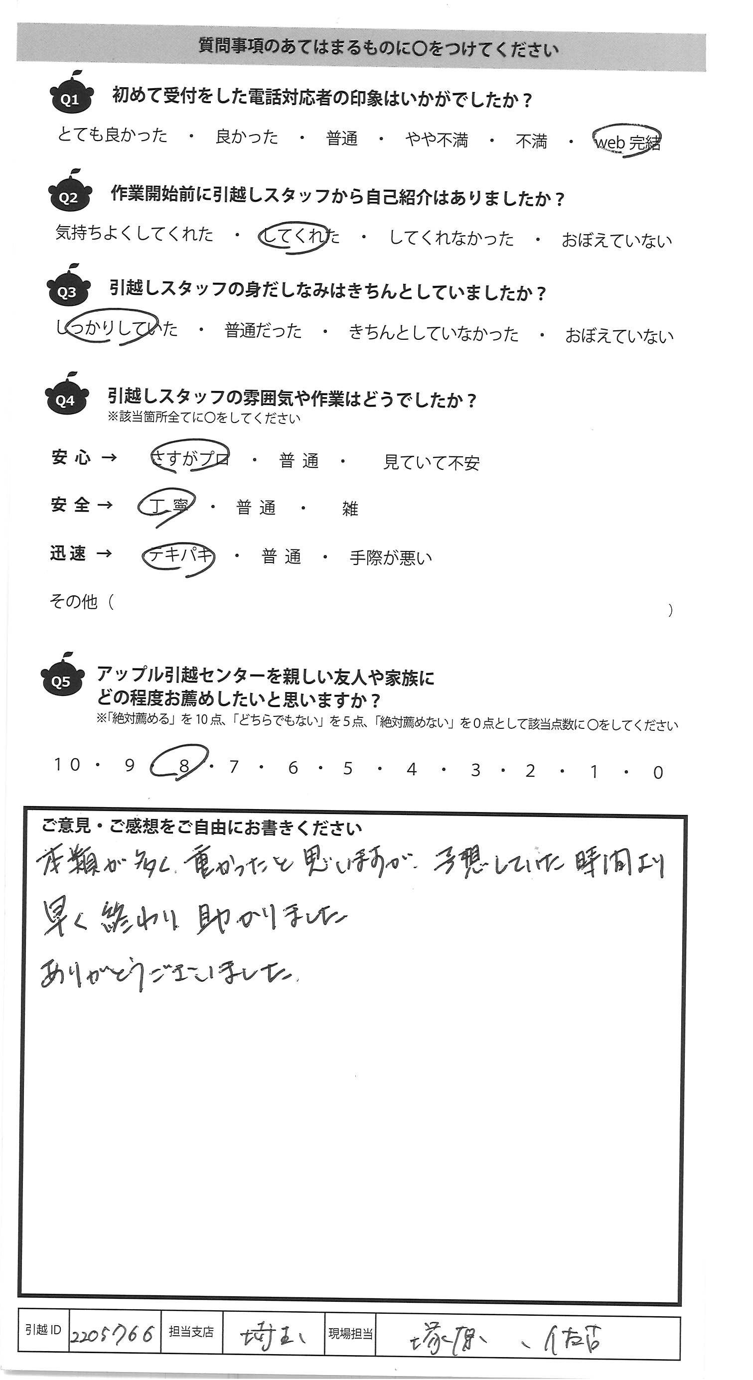 A.名古屋の最高気温予報が5月なのに33℃と なり、相当暑かったと思いますが、イヤな顔 一つせずにテキパキと作業して下さり、 大変ありがとうございました。2かいめの利用に なりますが、今回もアップル引越センターを 利用して良かったと思います。