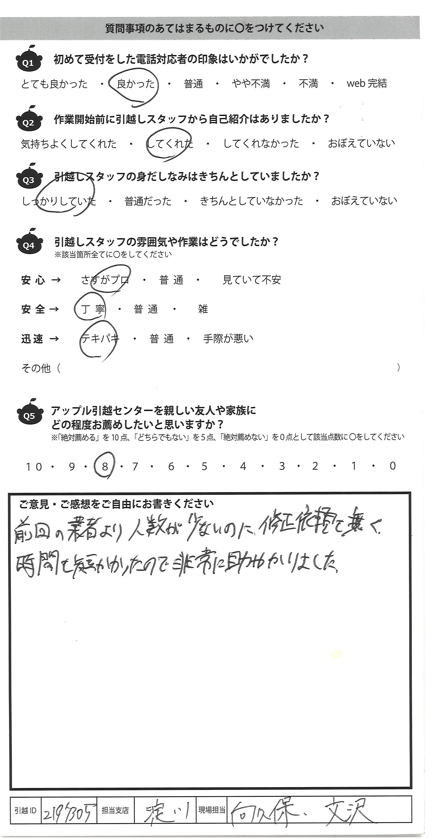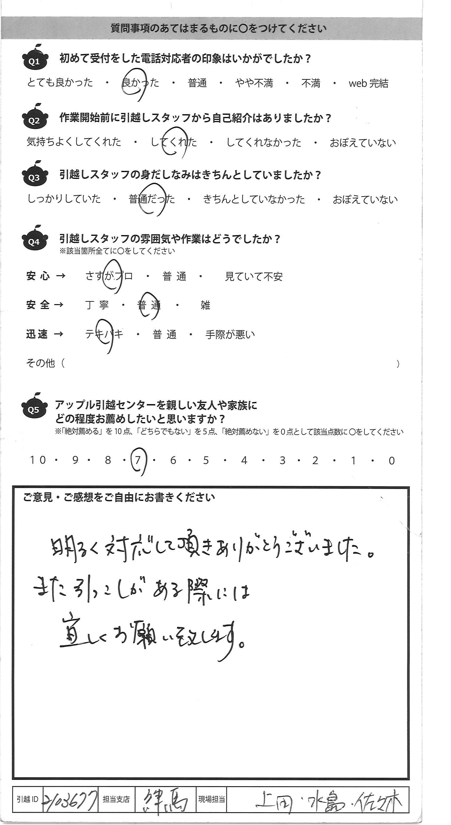 A.明るく対応して頂きありがとうございました。 また引っこしがある際には 宜しくお願い致します。