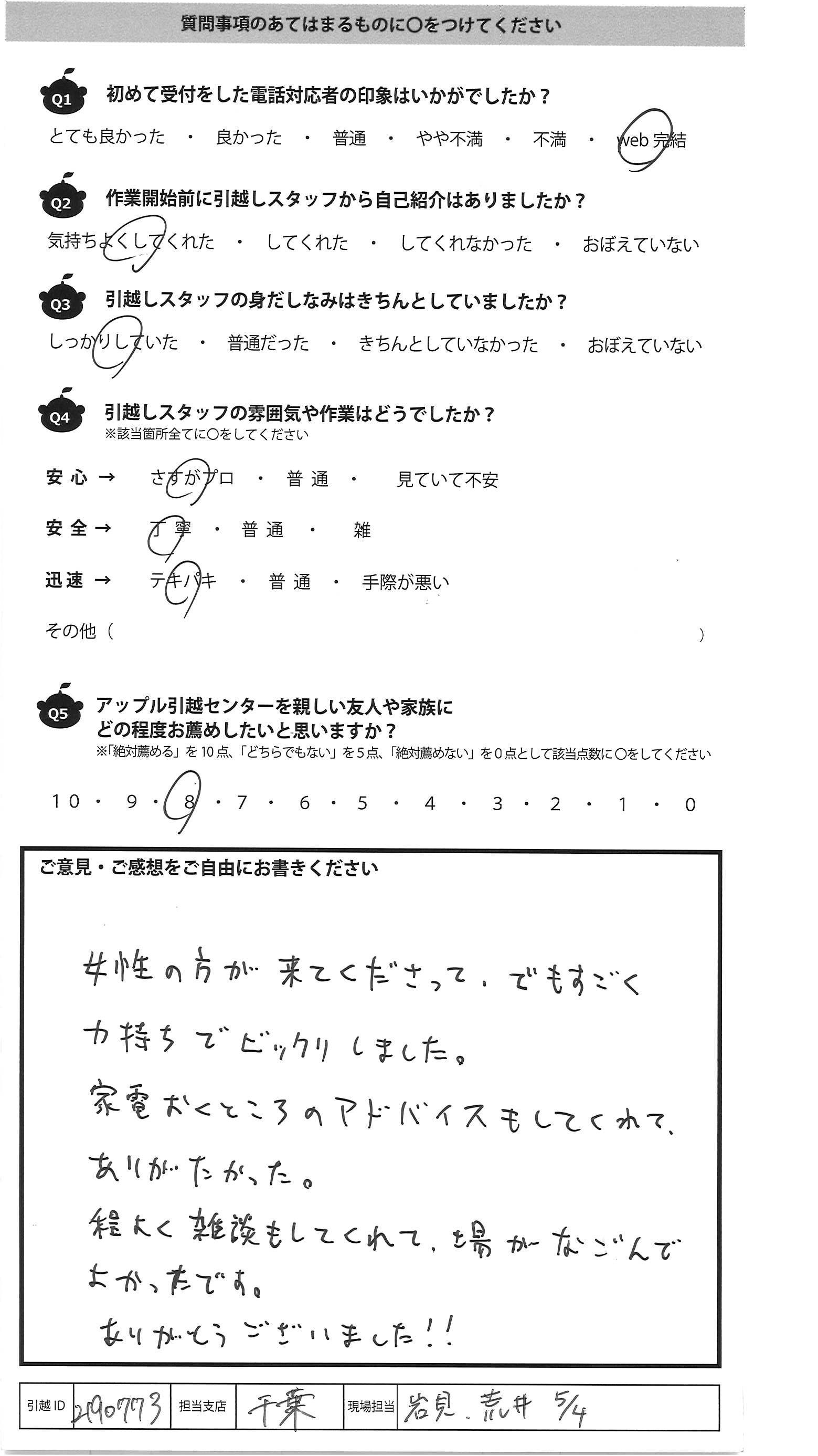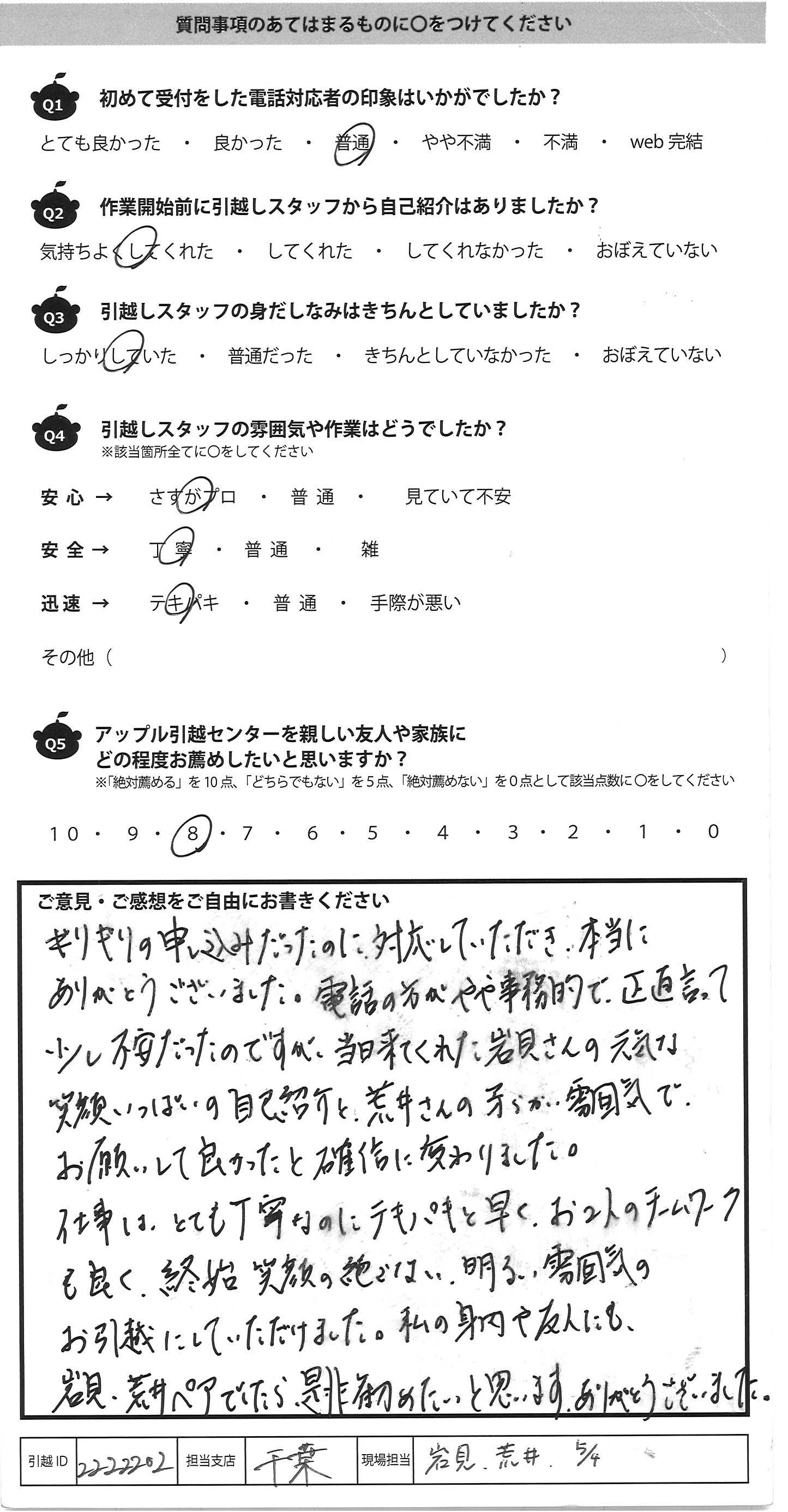 A.ギリギリの申し込みだったのに、対応していただき、本当に ありがとうございました。電話の方がやや事務的で、正直言って 少し不安だったのですが、当日来てくれた岩見さんの元気な 笑顔いっぱいの自己紹介と、荒井さんの柔らかい雰囲気で、 お願いして良かったと確信に変わりました。 仕事は、とても丁寧なのにテキパキと早く、お2人のチームワーク も良く、終始笑顔の絶えない、明るい、雰囲気の お引越にしていただけました。私の身内や友人にも、 岩見、荒井ペアでしたら、是非勧めたいと思います。ありがとうございました。