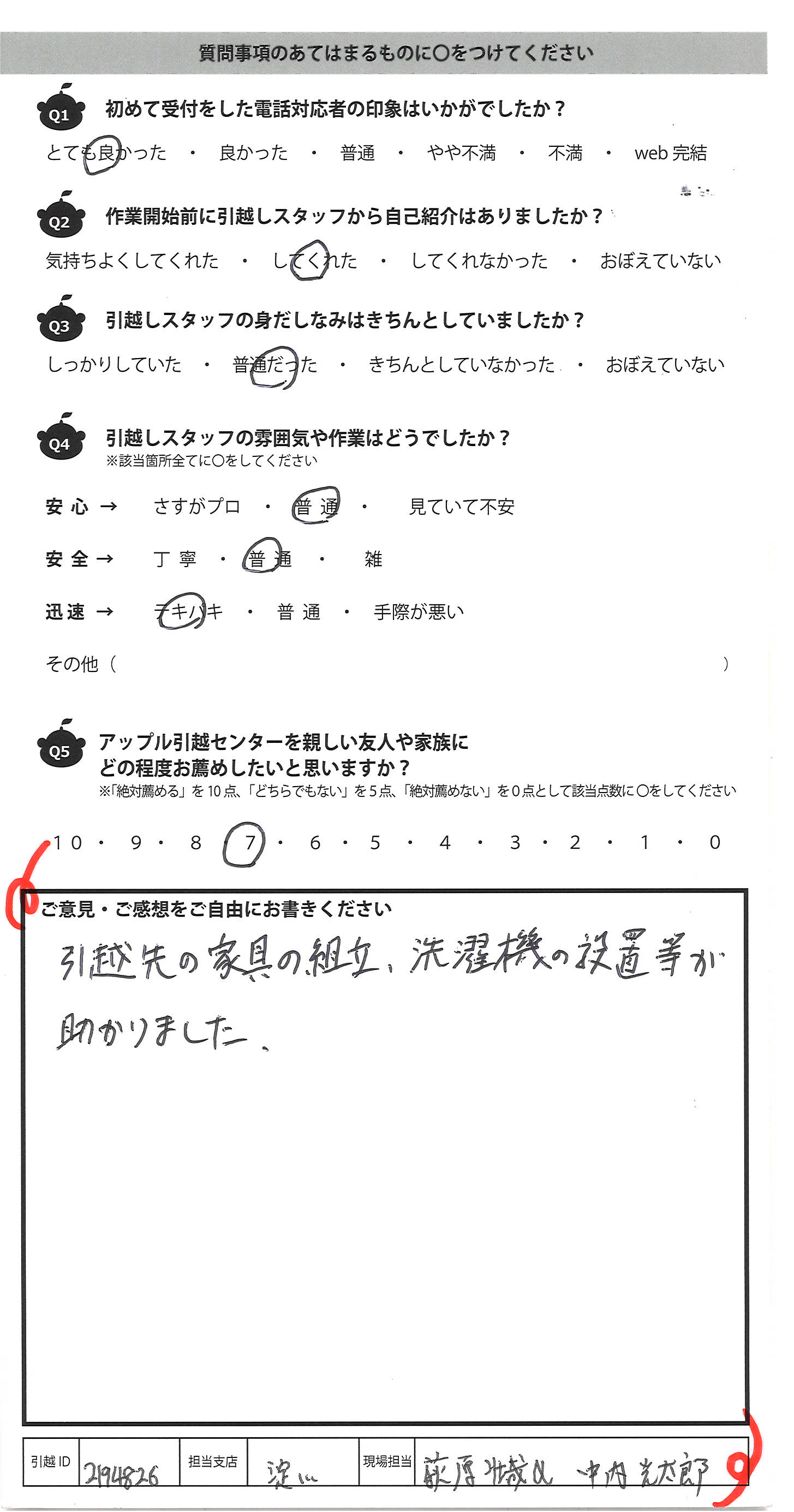 A.引越先の家具の組立、洗濯機の設置等が 助かりました。