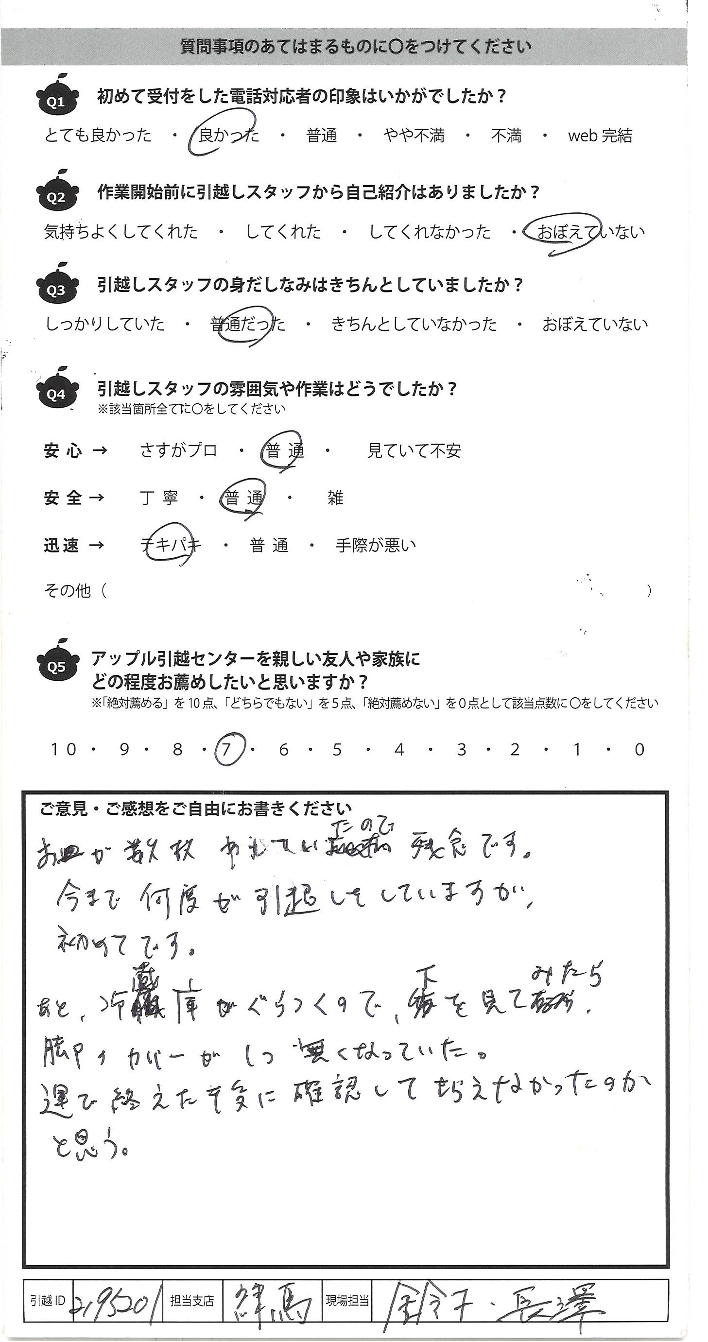 A.お皿が数枚われていたので残念です。 今まで何度か引越しをしていますが、 初めてです。 あと、冷蔵庫がぐらつくので、下を見てみたら 脚のカバーが1つ無くなっていた。 運び終えた後に確認してもらえなかったのか と思う。