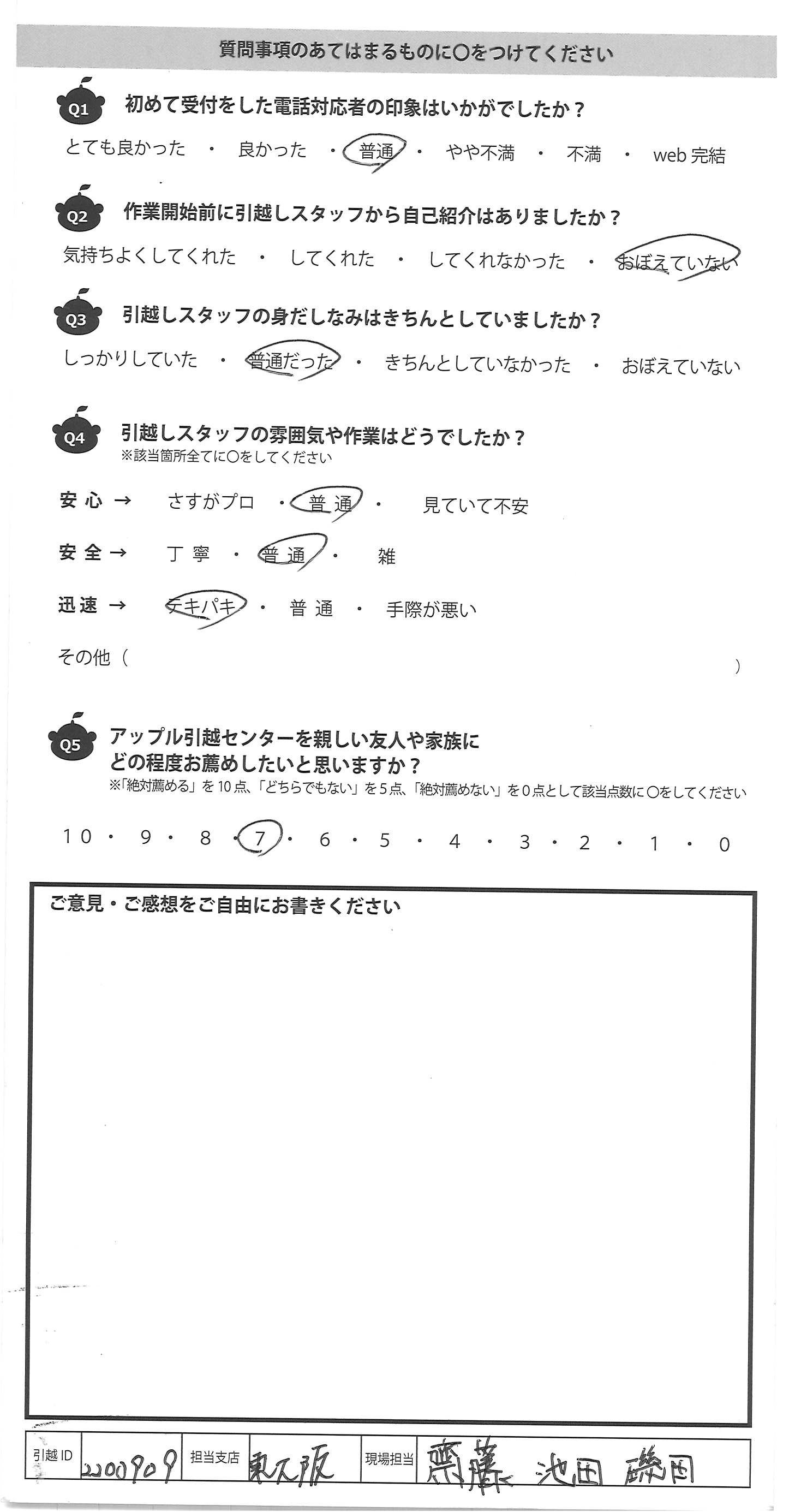 A.引越し対応は非常に迅速に対応いただきました。ありがとうございます。引っ越し時にマンションの勝手口のドアを開けっぱなしにしていたのですが、そのワッシャーがなくなったトラブルがあり、そこだけ少し残念でしたが、それ以外は電話対応、当日対応、値段を含めて非常に良かったです。ありがとうございました。