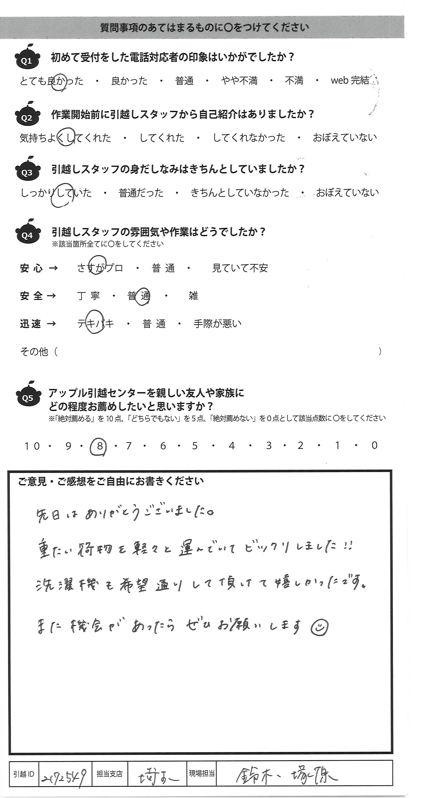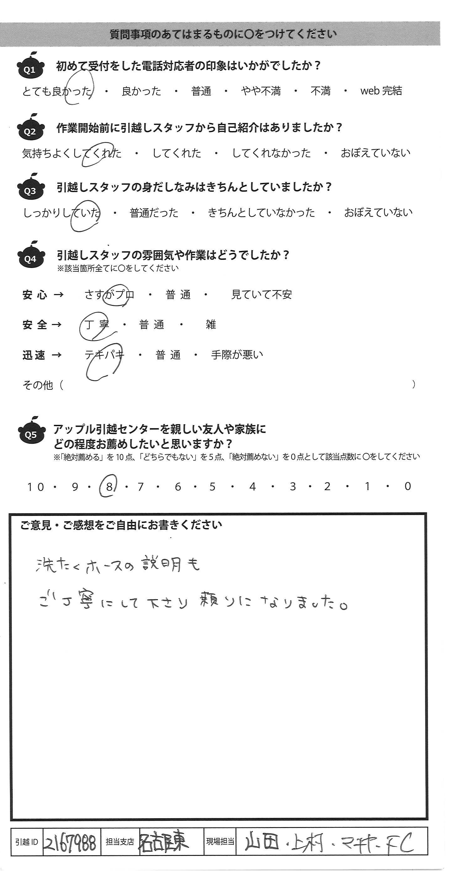 A.先日はありがとうございました。 重たい荷物を軽々と運んでいてビックリしました!! 洗濯機も希望通りして頂けて嬉しかったです。 また機会があったらぜひお願いします