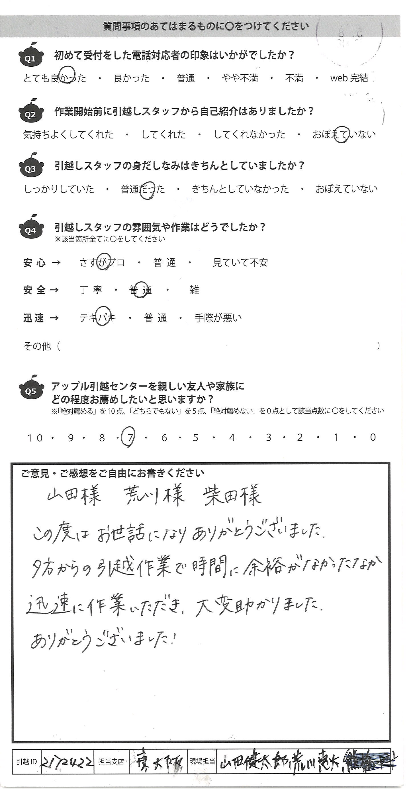 A.山田様、荒川様、柴田様 この度はお世話になりありがとうございました 夕方からの引越作業で時間に余裕がなかったなか 迅速に作業いただき、大変助かりました。 ありがとうございました!