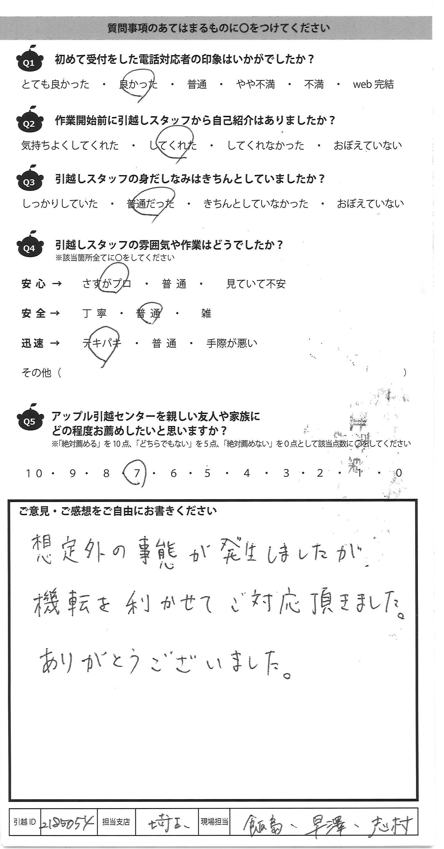 A.想定外の事態が発生しましたが、 機転を利かせてご対応頂きました。 ありがとうございました。