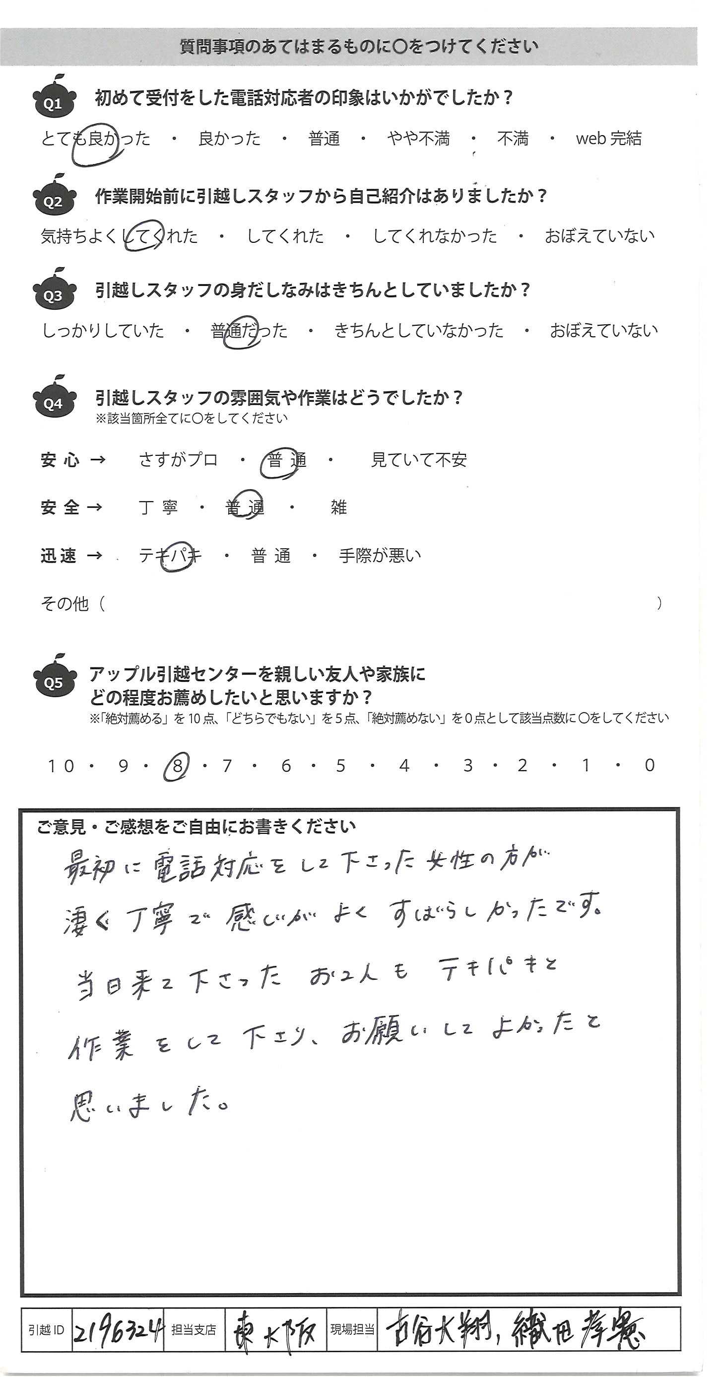 A.最初に電話対応をして下さった女性の方が 凄く丁寧で感じがよくすばらしいかったです。 当日来て下さったお2人もテキパキと 作業をして下さり、お願いしてよかったと 思いました。