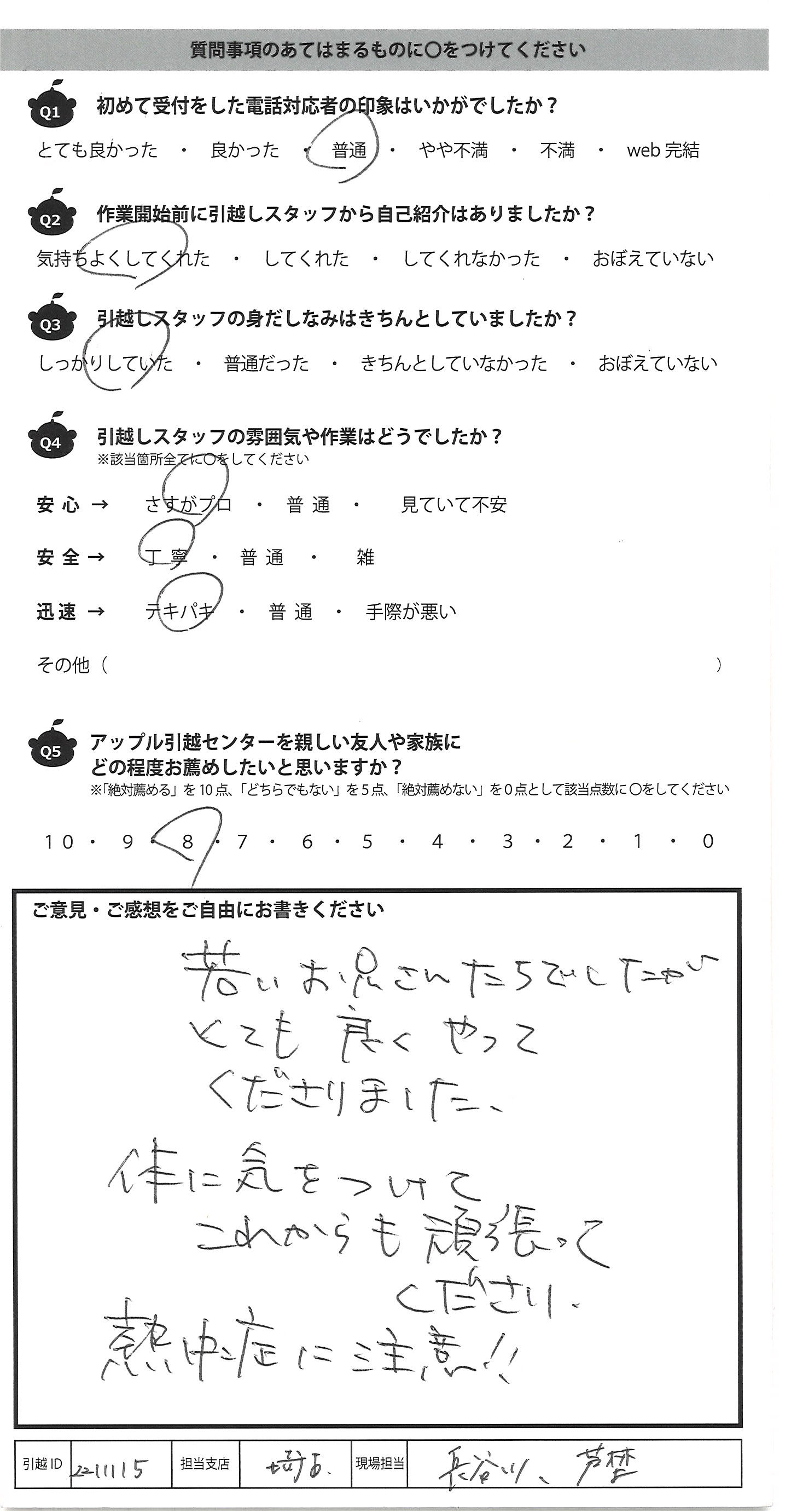 A.若いお兄さんたちでしたが とても良くやって くださいました、 体に気をつけて これからも頑張って ください、 熱中症に注意!!