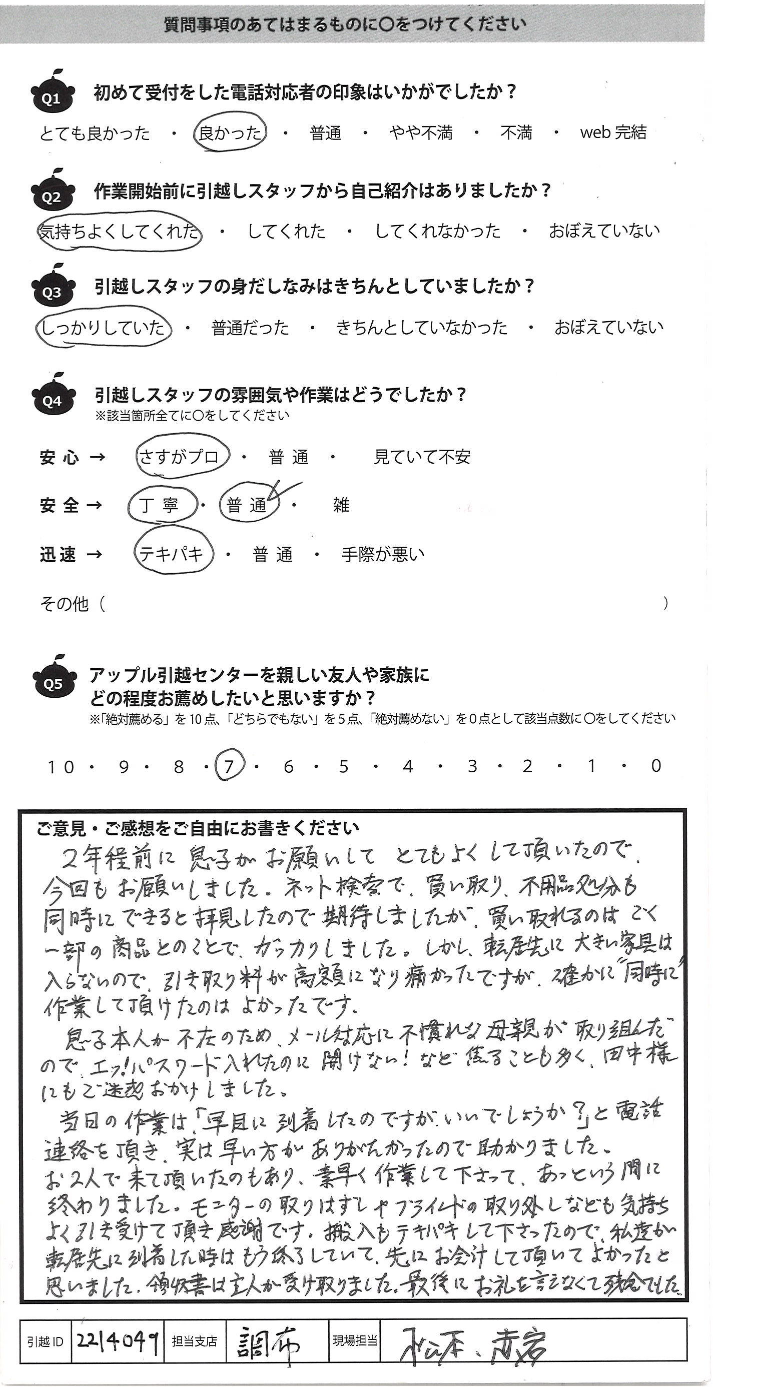 A.2年程前に息子がお願いしてとてもよくして頂いたので、 今回もお願いしました。ネット検索で、買い取り、不用品処分も 同時にできると拝見したので期待しましたが、買い取れるのはごく 一部の商品とのことで、がっかりしました。しかし、転居先に大きい家具は 入らないので、引き取り料が高額になり痛かったですが、確かに同時に 作業して頂けたのはよかったです。 息子本人が不在のため、メール対応に不慣れな母親が取り組んだ のでエッ!パスワード入れたのに開けない!など焦ることも多く、田中様 にもご迷惑おかけしました。 当日の作業は「早目に到着したのですがいいでしょうか?」と電話 連絡を頂き、実は早い方がありがたかったので助かりました。 お2人で来て頂いたのもあり、素早く作業して下さって、あっという間に 終わりました。モニターの取りはずしやブラインドの取り外しなども気持ち よく引き受けて頂き感謝です。搬入もテキパキして下さったので、私達が 転居先に到着した時はもう終了していて、先にお会計して頂いてよかったと 思いました。領収書は主人が受け取りました。最後にお礼を言えなくて残念でした
