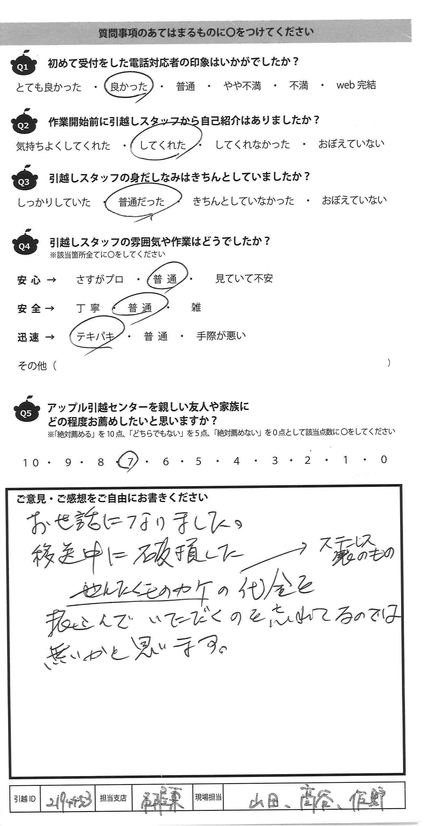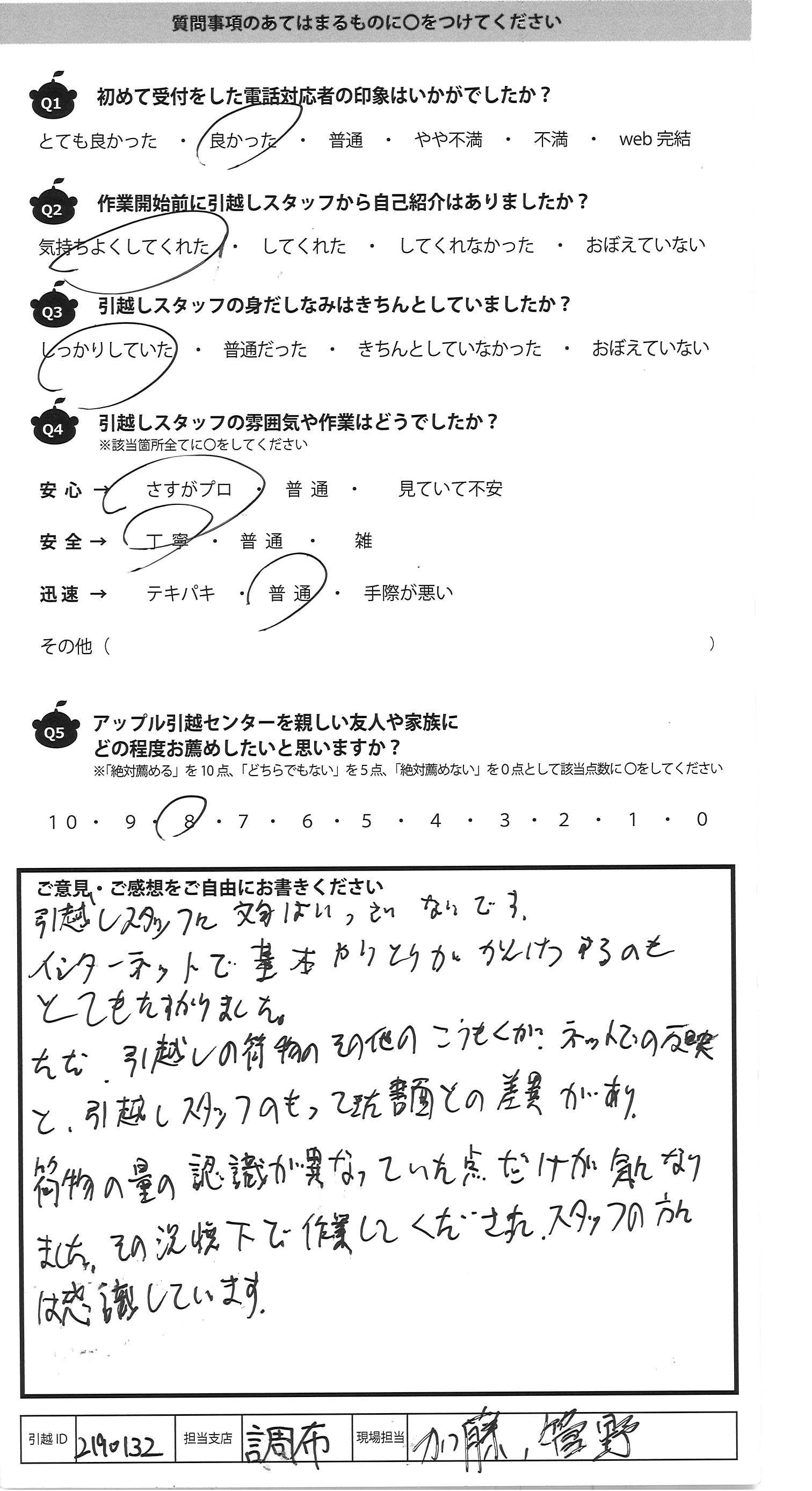 A.引越しスタッフに文句はいっさいないです。 インターネットで基本やりとりがかんけつするのも とてもたすかりました。 ただ、引越しの荷物のその他のこうもくがネットでの反映 と、引越しスタッフのもってきた書面との差異があり、 荷物の量の認識が異なっていた点だけが気になり ました。その況状下で作業してくださったスタッフの方に は感謝しています。