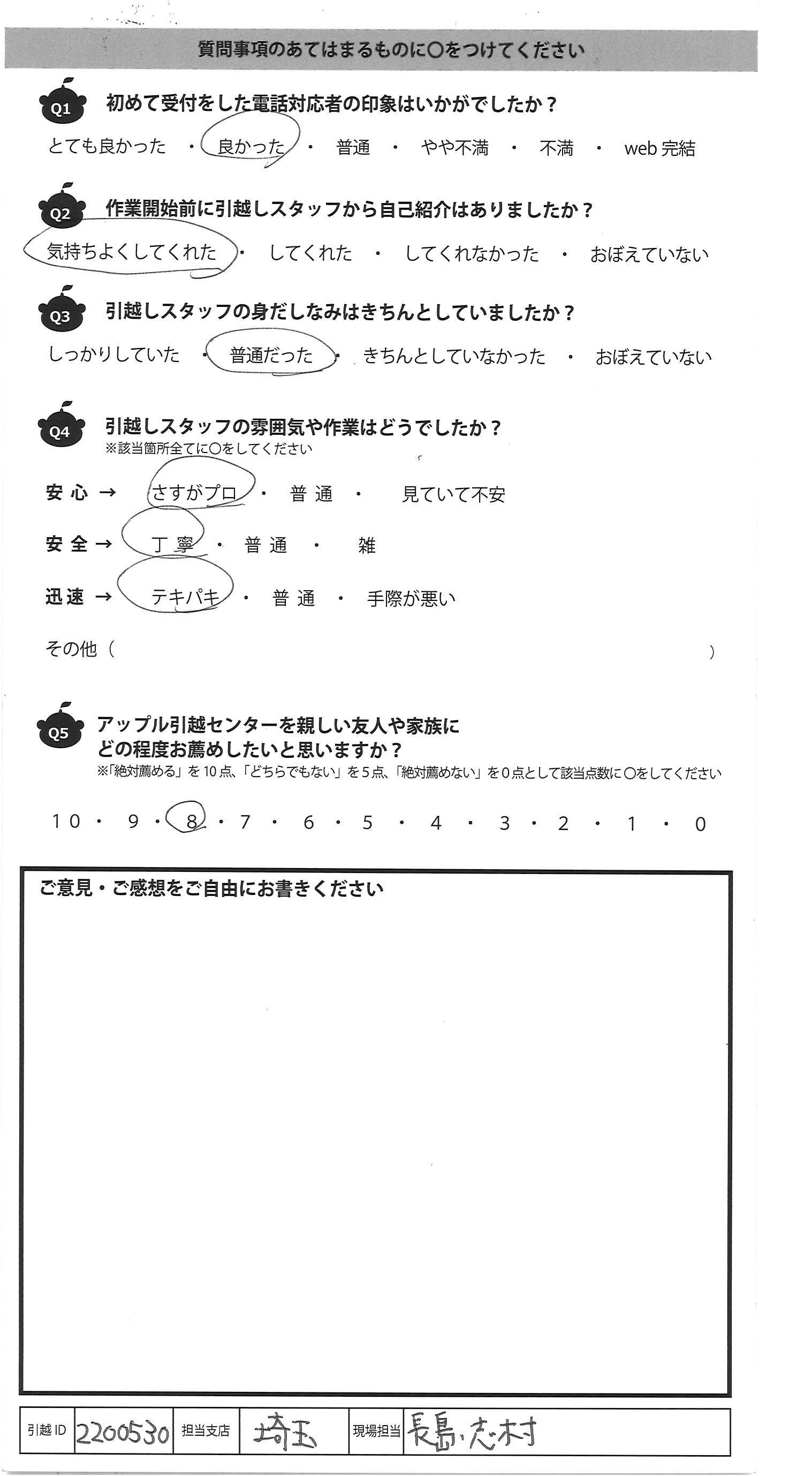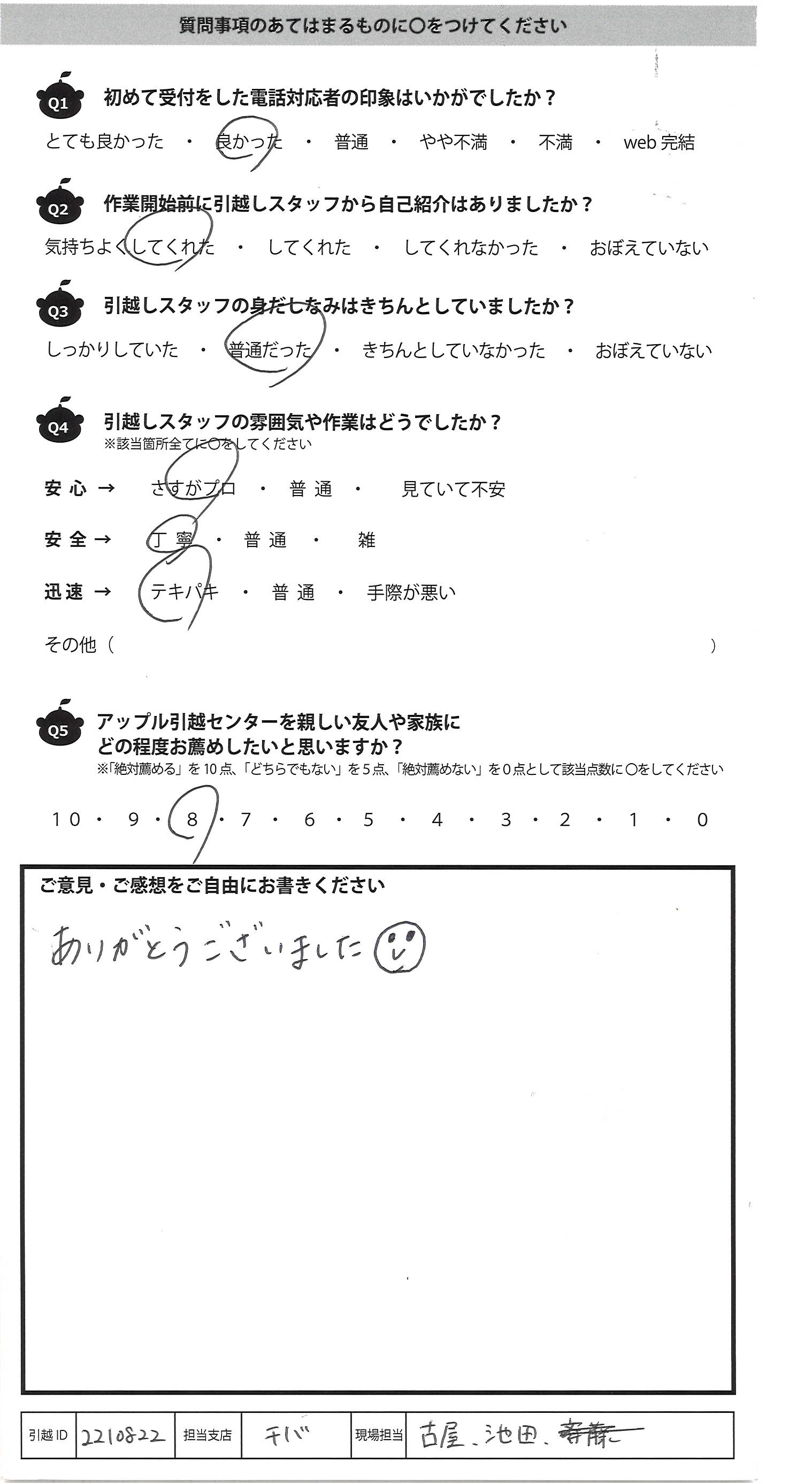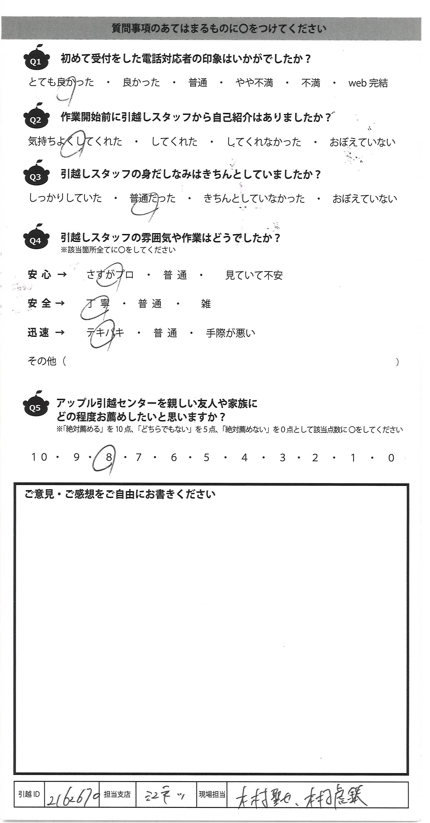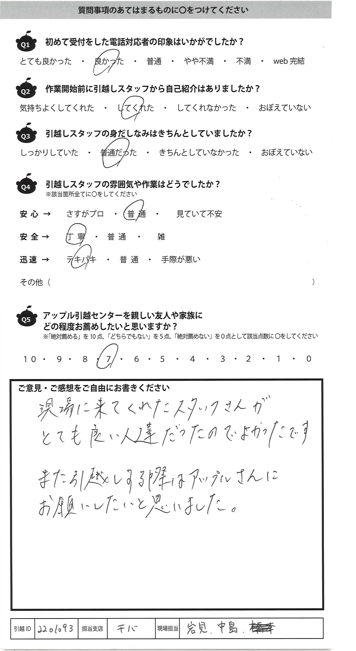 A.現場に来てくれたスタッフさんが とても良い人達だったのでよかったです また引越しする際はアップルさんに お願いしたいと思いました。
