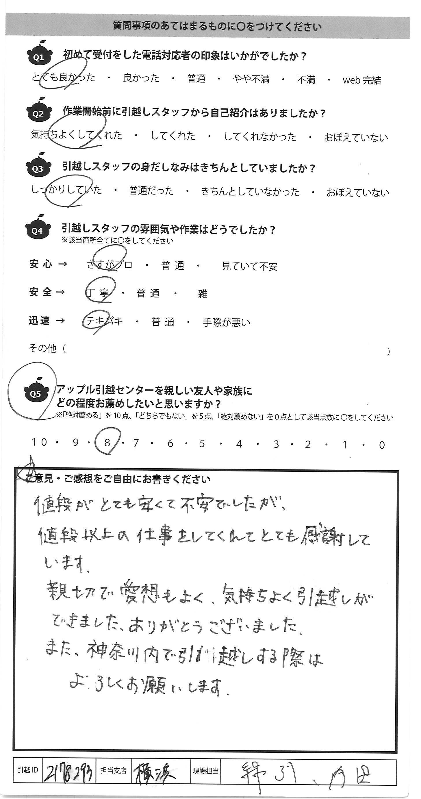 A.値段がとても安くて不安でしたが、 値段以上の仕事をしてくれてとても感謝して います。 親切で愛想もよく、気持ちよく引越しが できました、ありがとうございました。 また、神奈川内で引越しする際は よろしくお願いします。