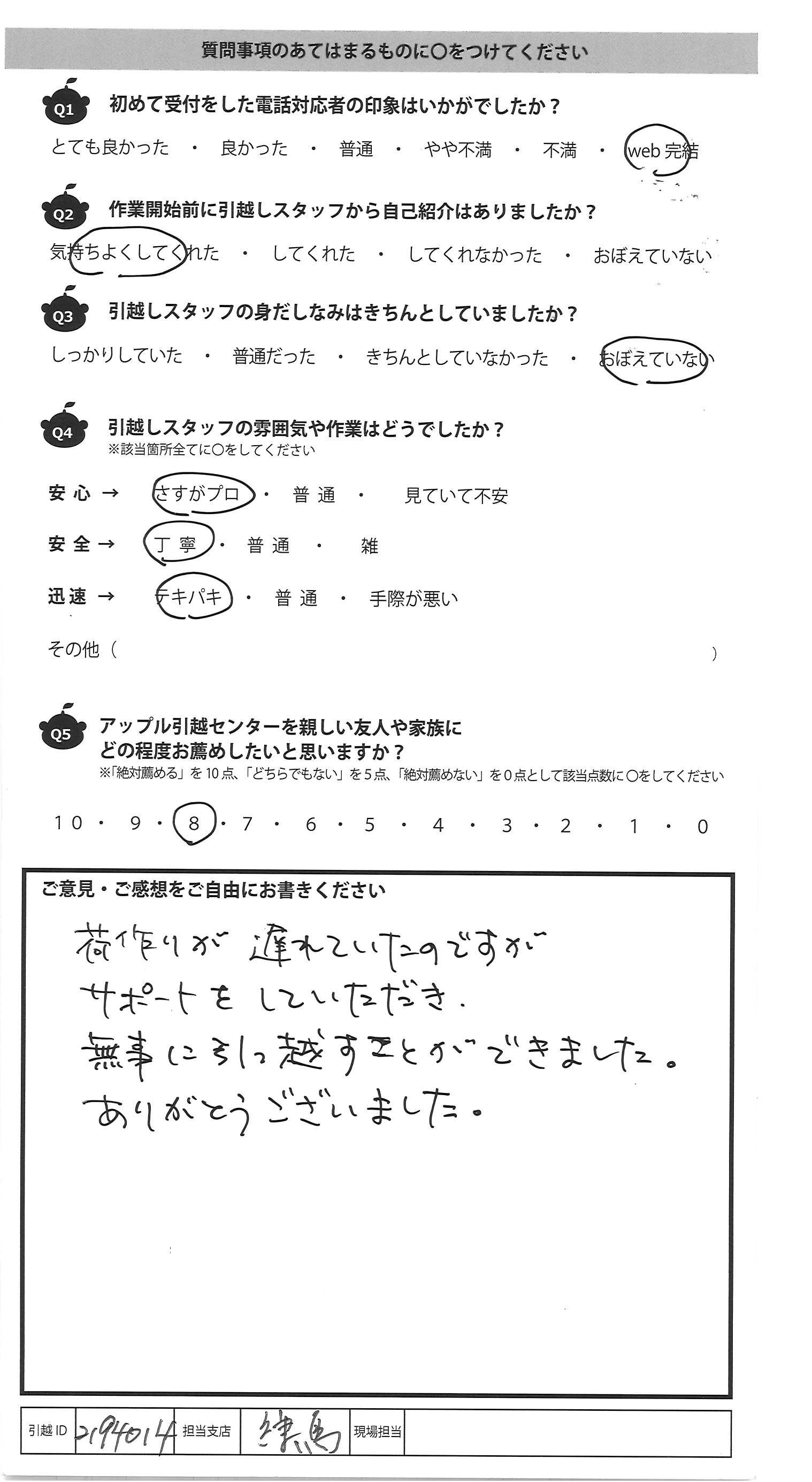 A.荷作りが遅れていたのですが サポートをしていただき、 無事に引っ越すことができました。 ありがとうございました。