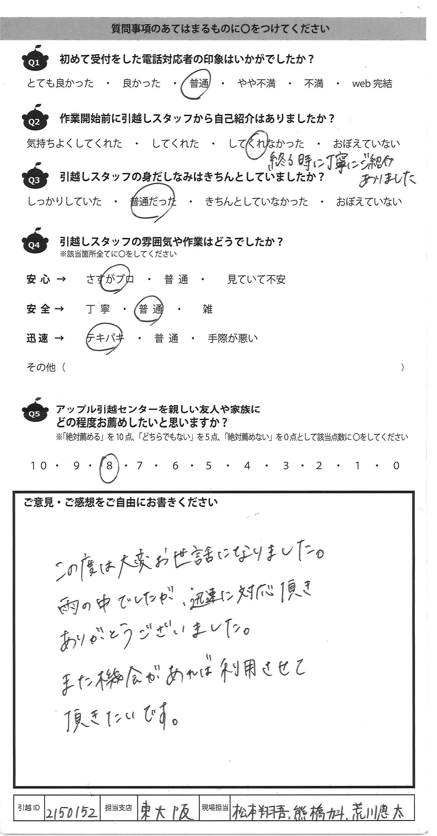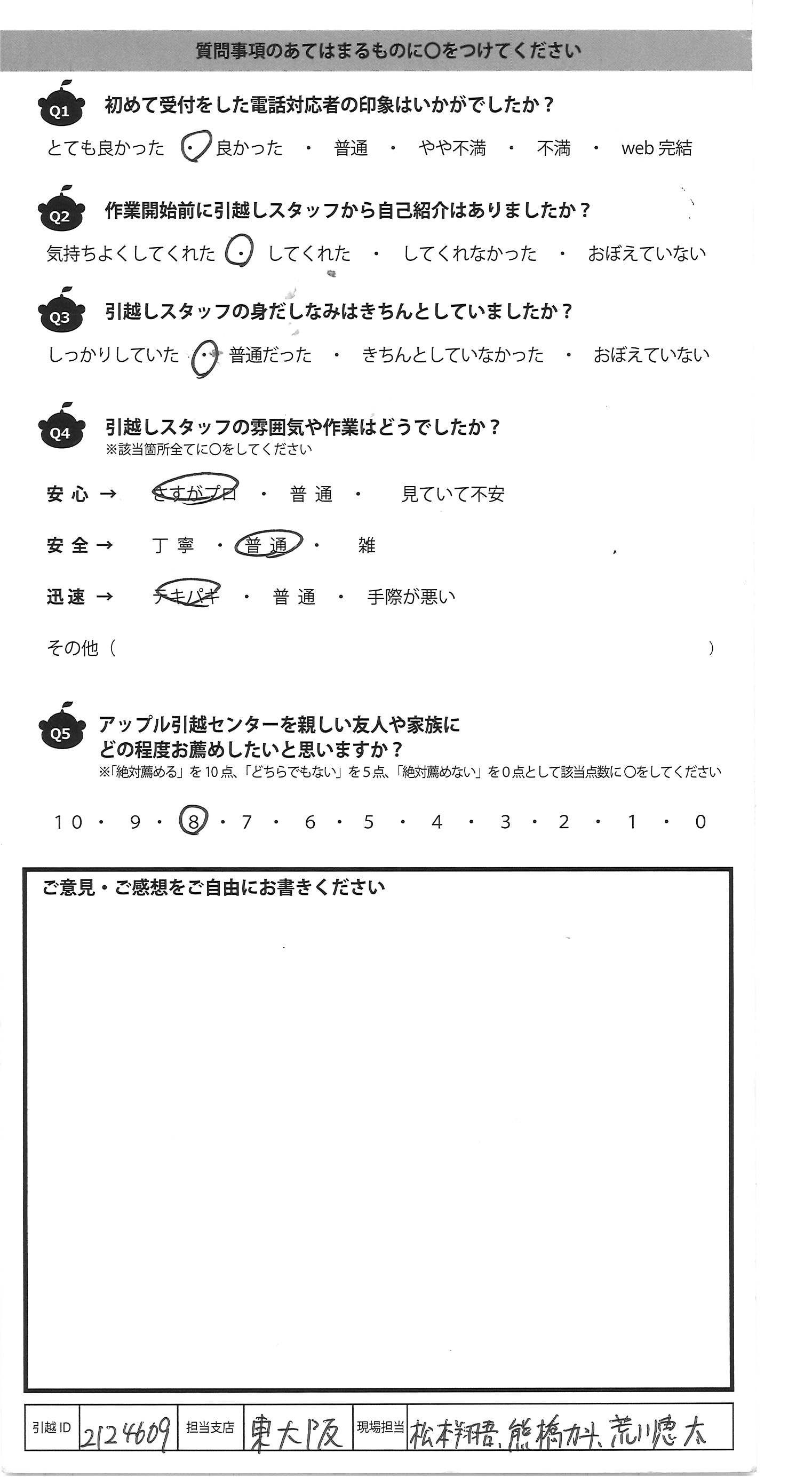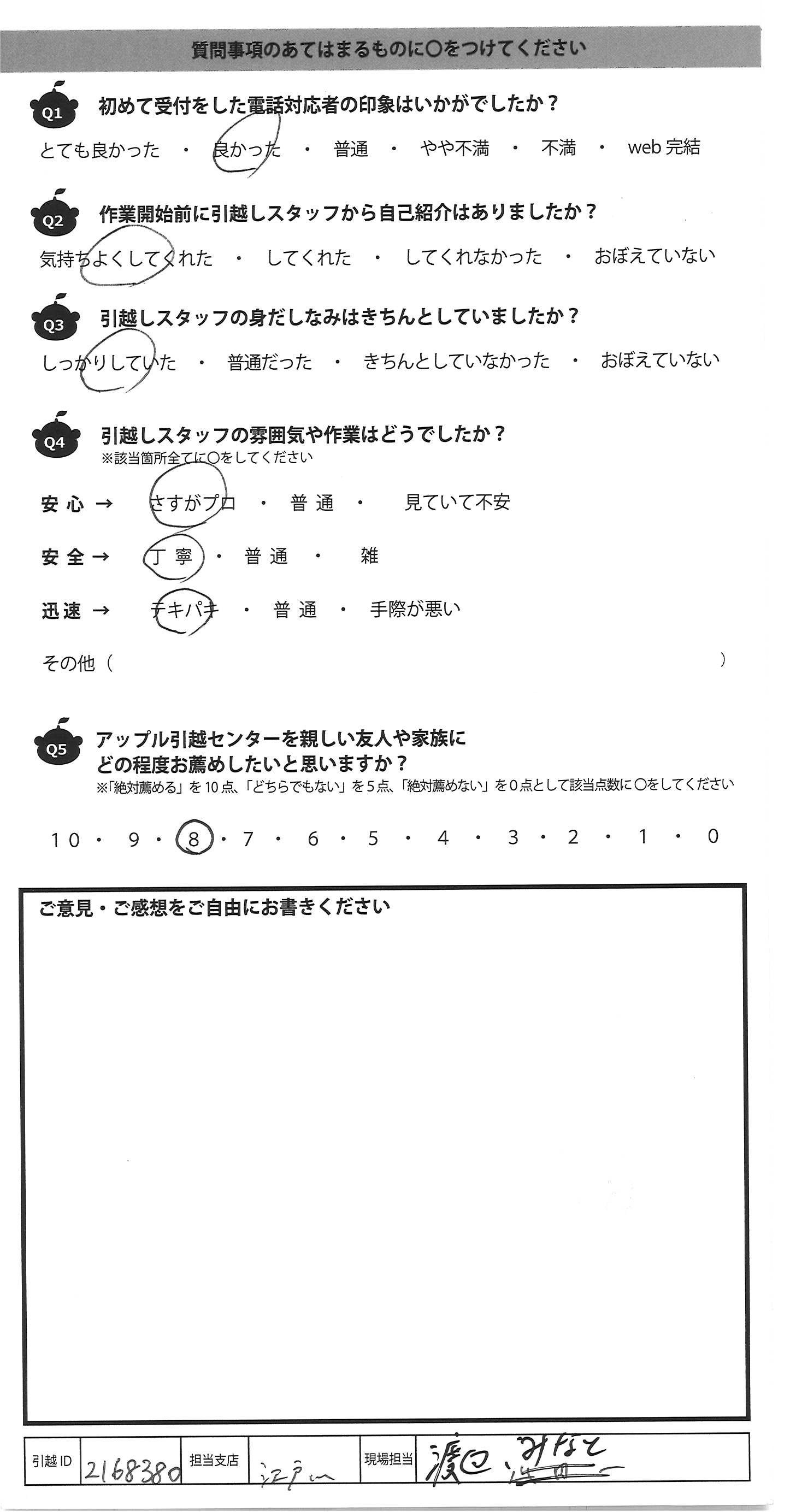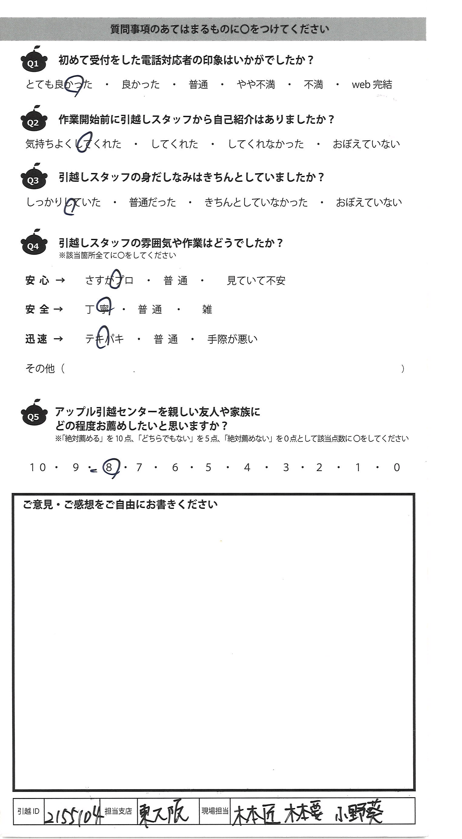A.電話対応は機械的ではなくにこやかな対応で安心して話すことができました。当日作業も迅速ですごいなあ…と関心しながら見ていました。また引っ越す機会があればぜひ利用したいと思えました。ありがとうございました。
