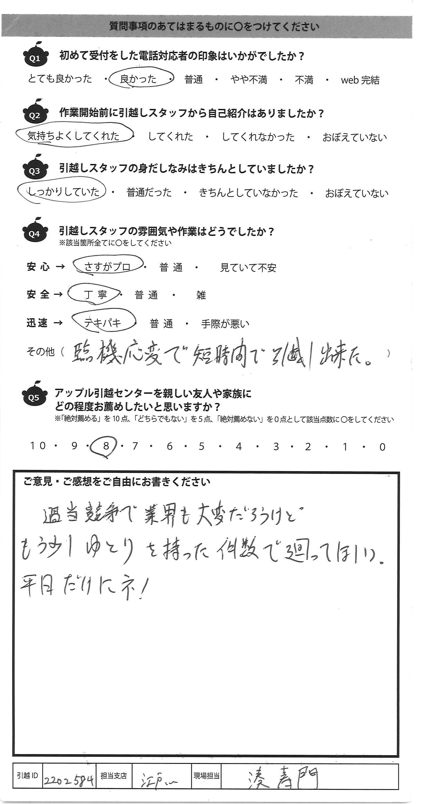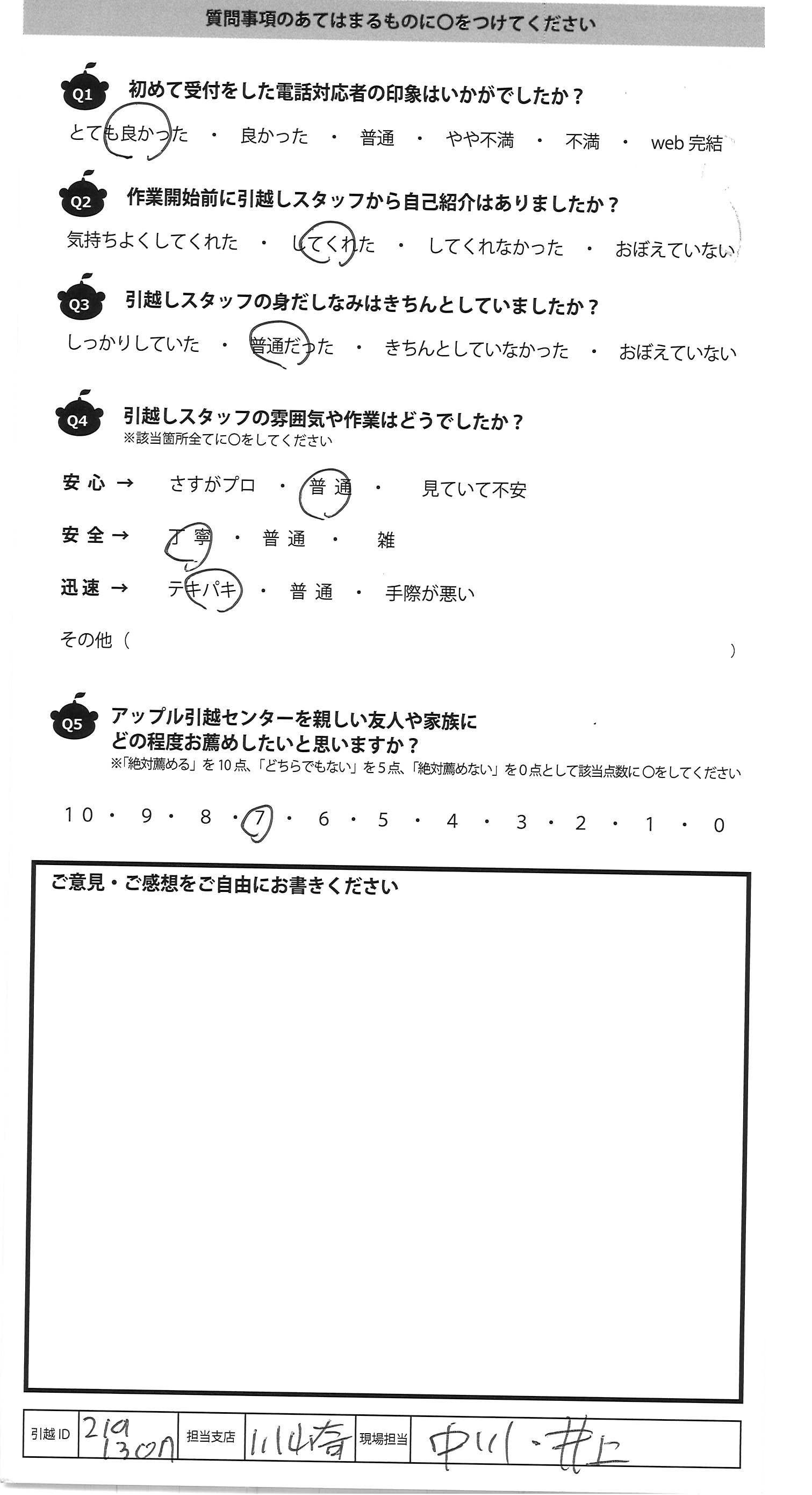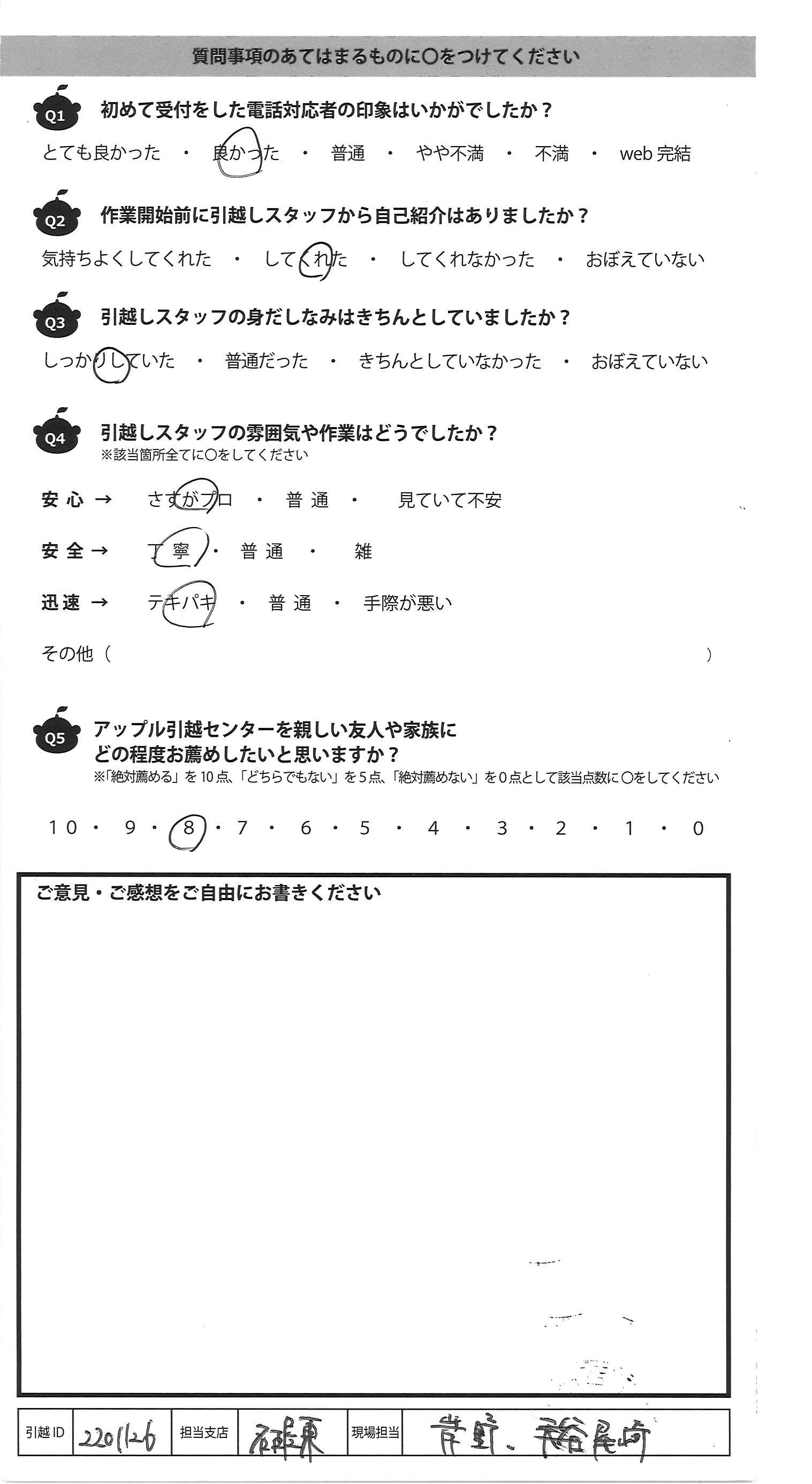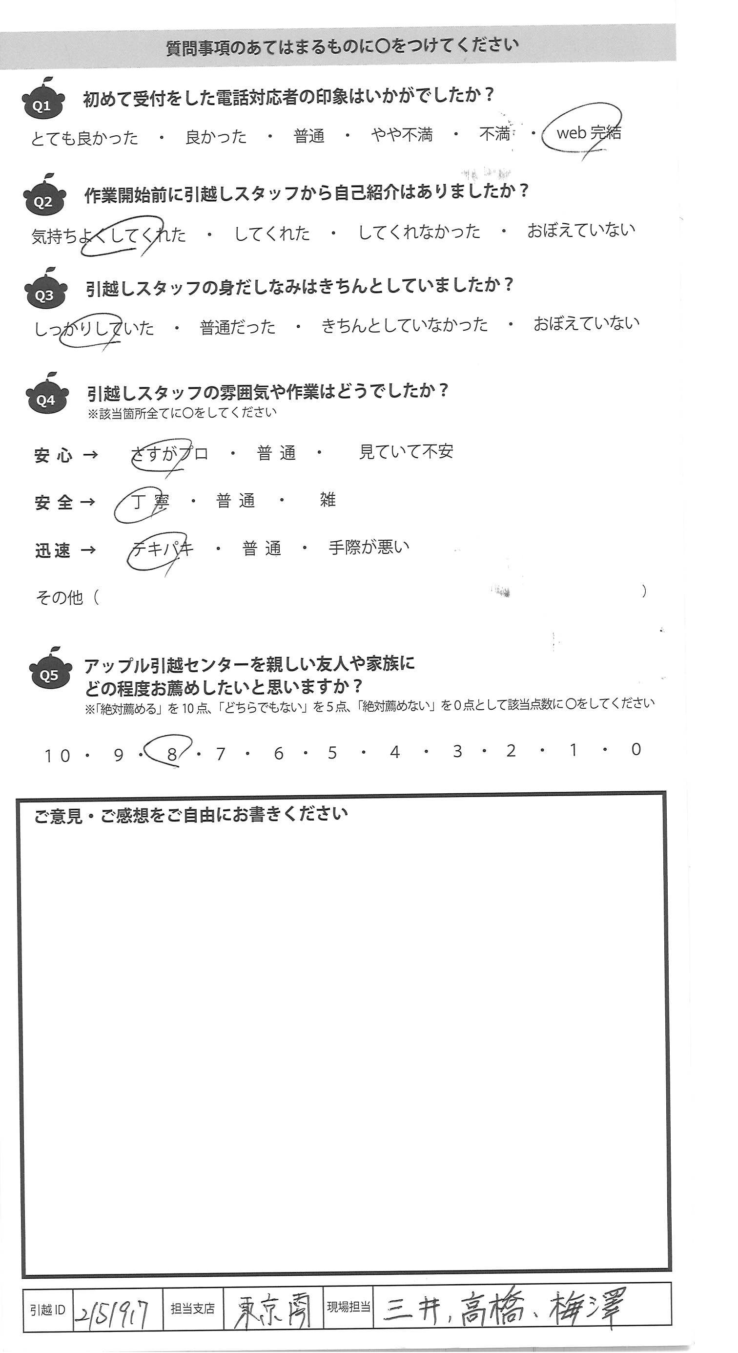 A.電話対応は機械的ではなくにこやかな対応で安心して話すことができました。当日作業も迅速ですごいなあ…と関心しながら見ていました。また引っ越す機会があればぜひ利用したいと思えました。ありがとうございました。
