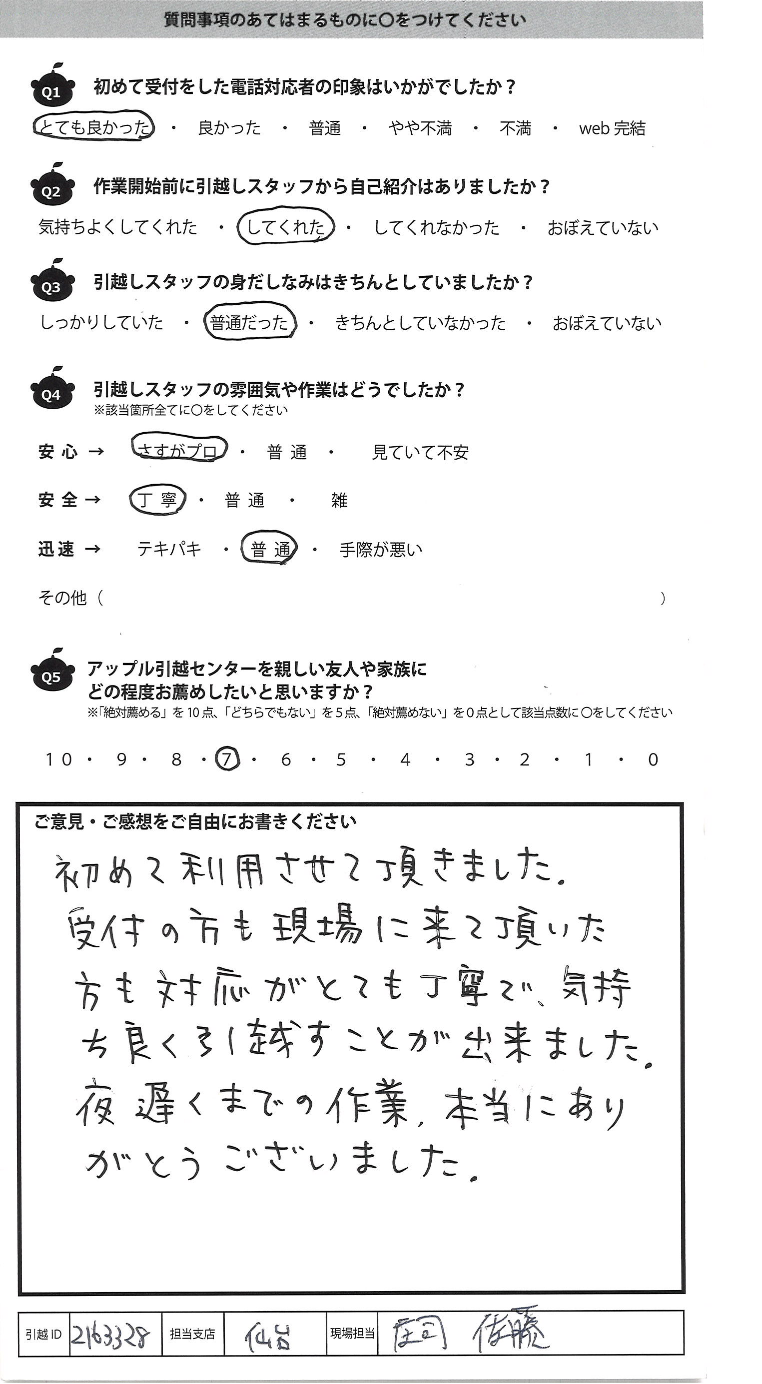 A.初めて利用させて頂きました。 受付の方も現場に来て頂いた 方も対応がとても丁寧で、気持 ち良く引越すことが出来ました。 夜遅くまでの作業、本当にあり がとうございました。