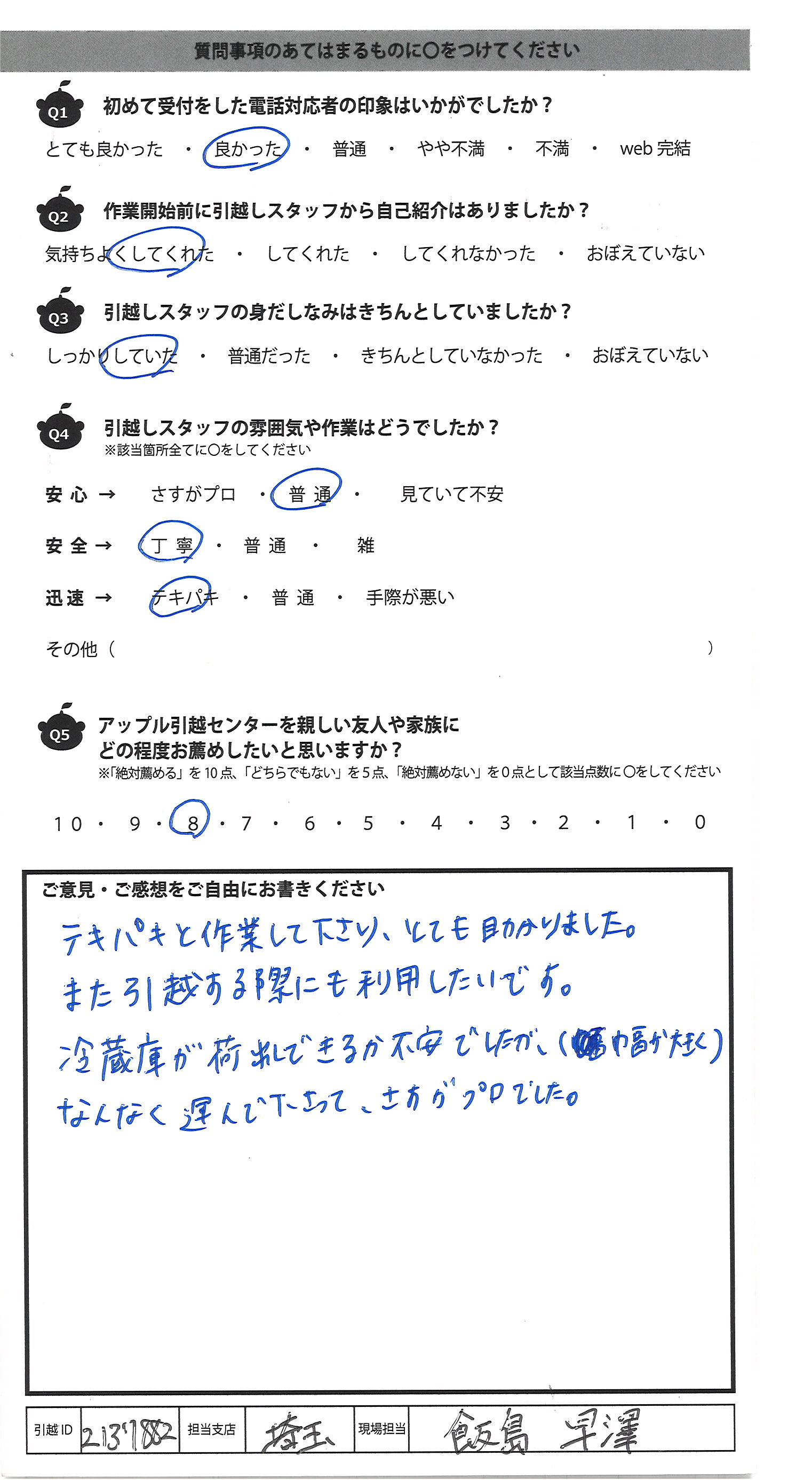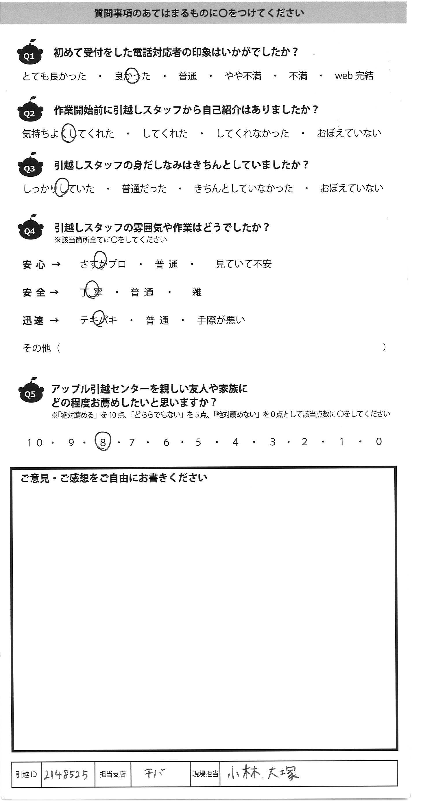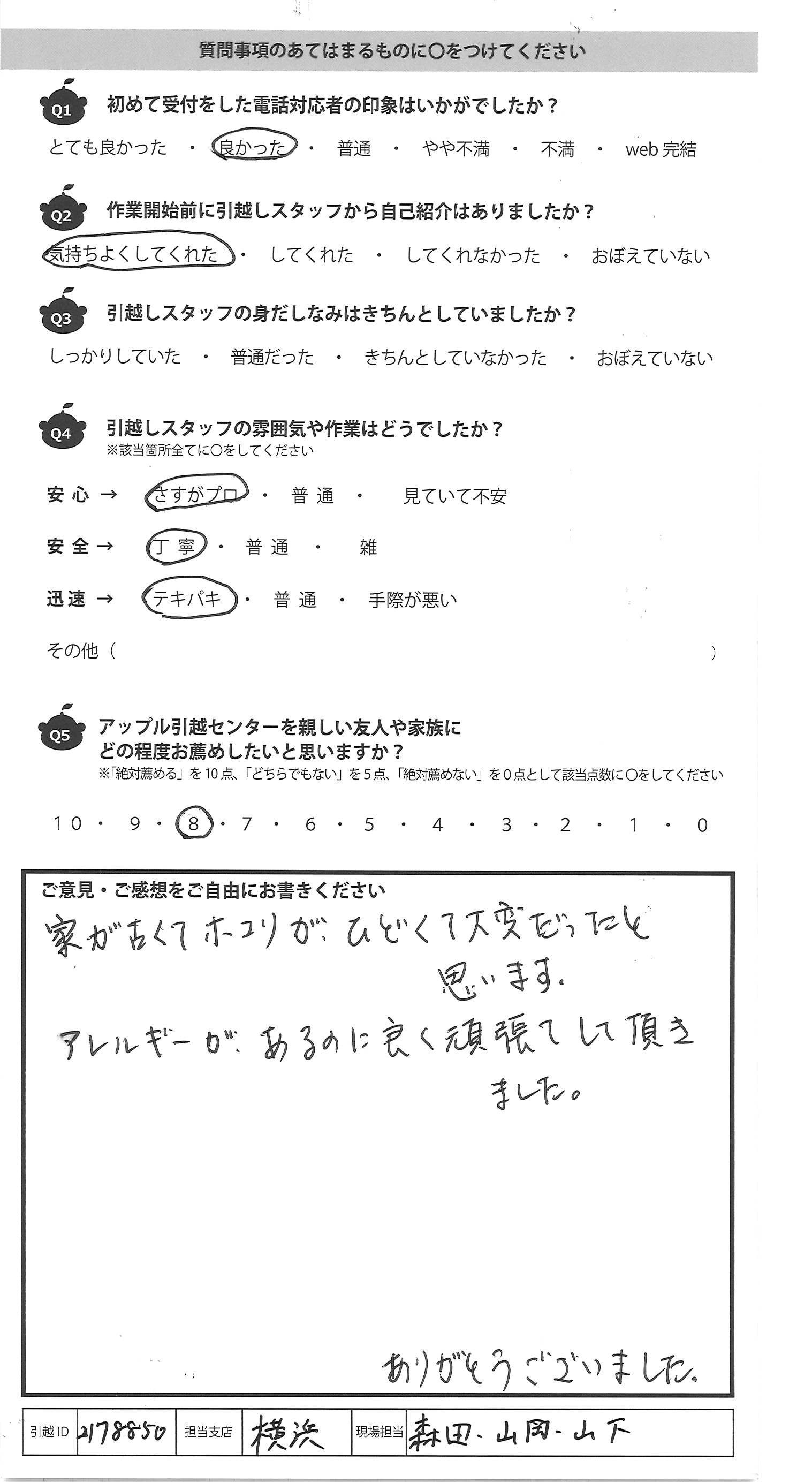 A.今回自分で行う初めての引っ越しで不安もありましたが、無事終わってよかった。 見積もりの段階で他社と比べて高過ぎない金額を出してくれた。 見積もり後もLINEを通して質問することができて、便利だった。 盗聴器の確認をしてもらって安心した。 当日は基本は丁寧に作業をしてくれていた。 事前に確認はしたが、運んだ後の段ボールがやや黒くなっていたのが残念。汚されては困るので、行っていたか不明だが、新居に入る前に新しい手袋、新しい靴下にするべきだと思った。 また、洗濯機が防水パンには入ったが、嵩上げをしないと高圧洗浄できない事実を後から知り、引っ越し業者の方にその事実を教えて欲しかった。また、臨機応変に嵩上げ台を売ってでも対応して欲しかった。 段ボール回収は無料だが、9時ー20時の間、何時になるかせめて午前か午後か教えて欲しかった。 親切と不親切な部分が両極端に分かれた。
