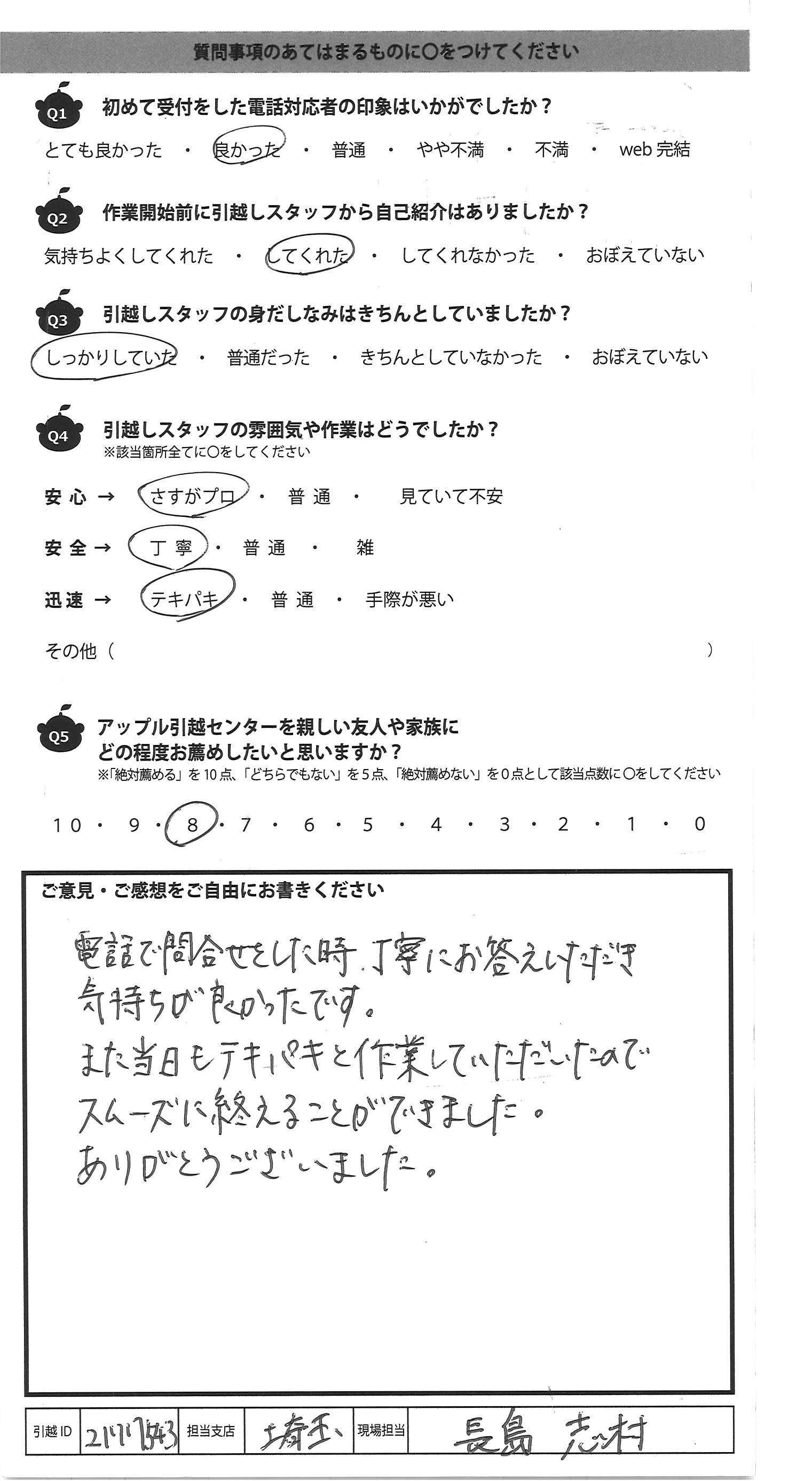A.電話で問合せをした時、丁寧にお答えいただき 気持ちが良かったです。 また当日もテキパキと作業していただいたので スムーズに終えることができました。 ありがとうございました。