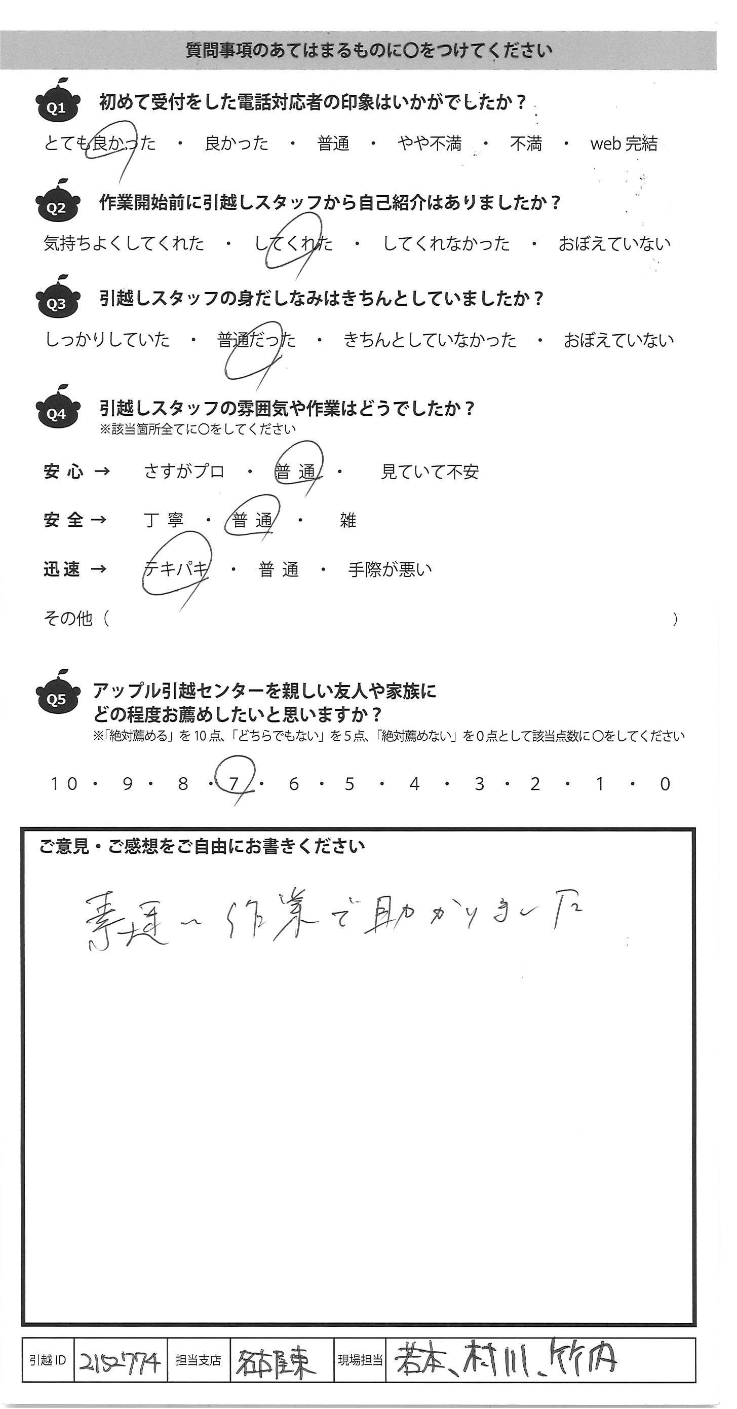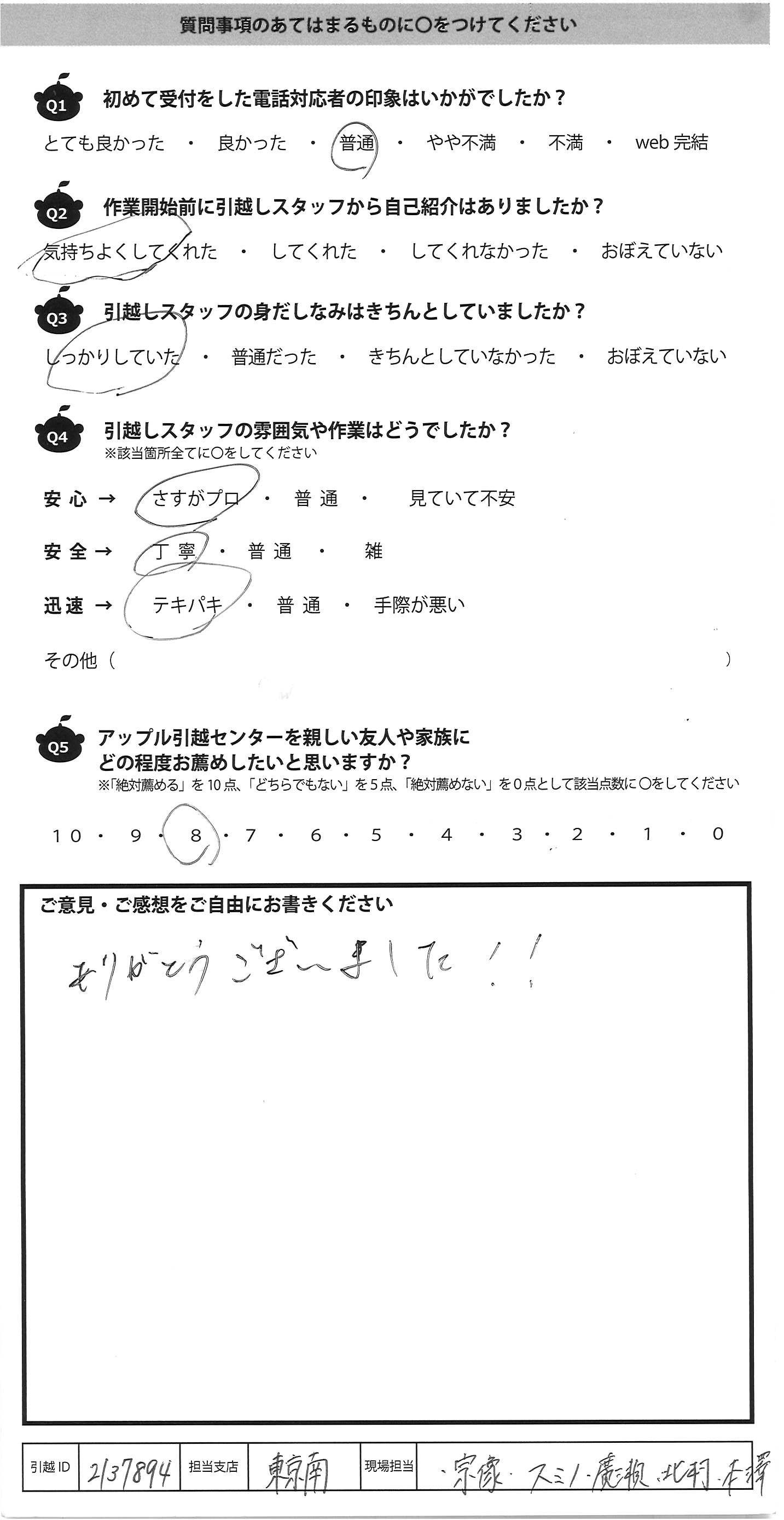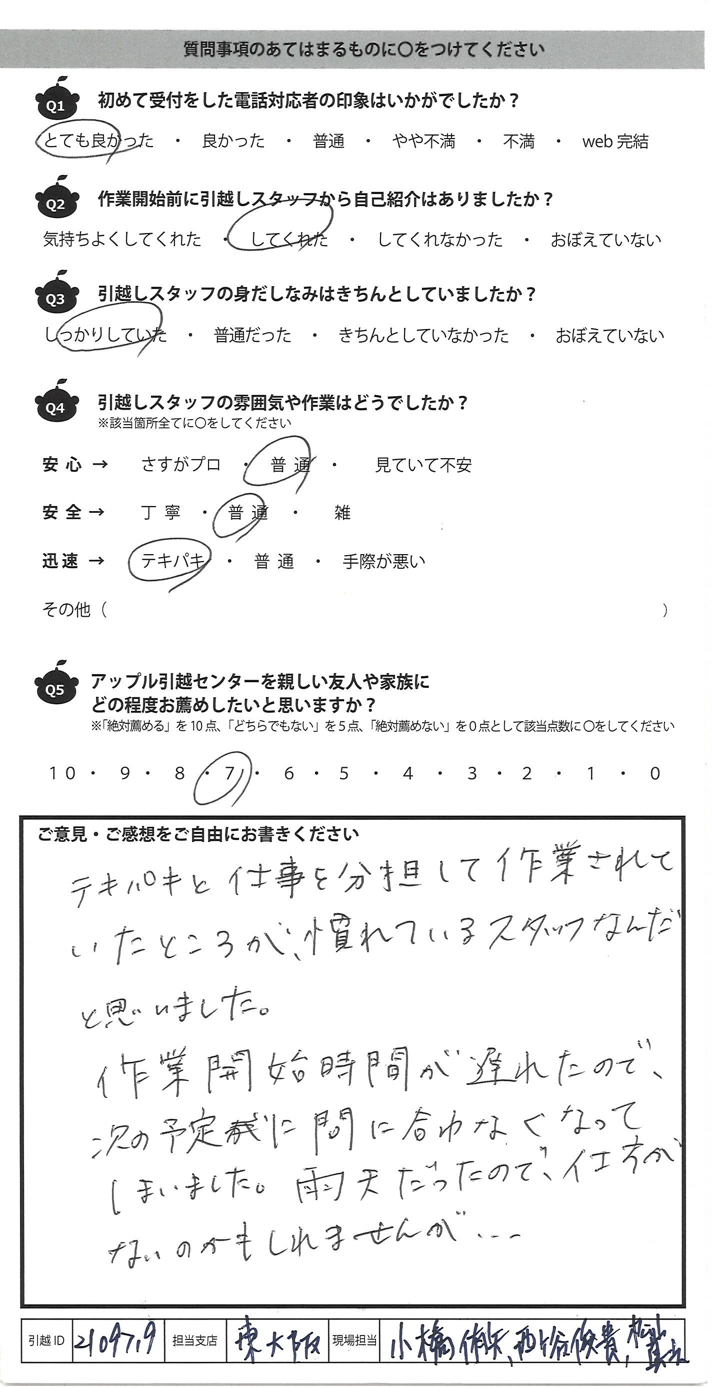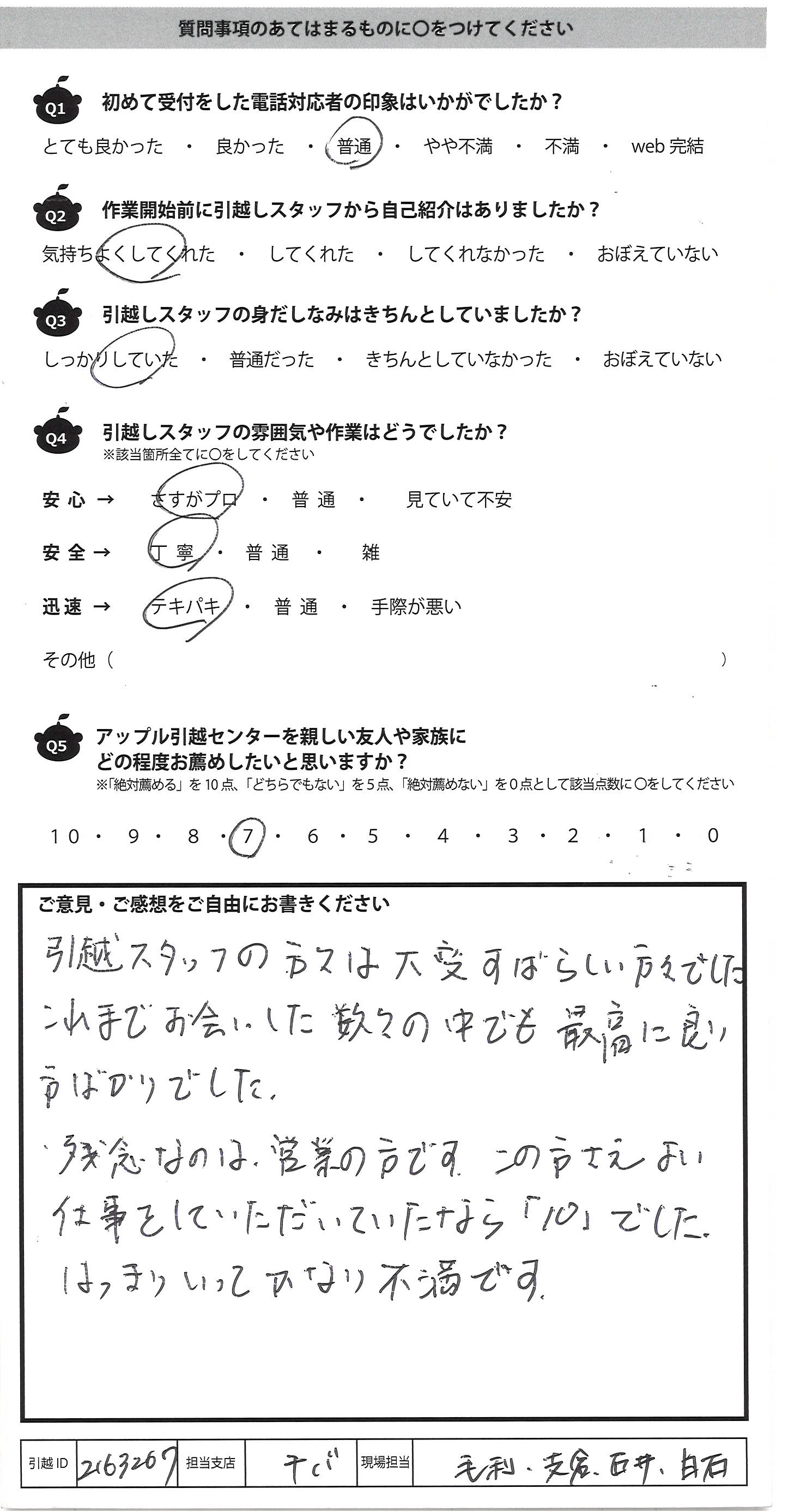 A.引越スタッフの方々は大変すばらしい方々でした こえまでお会いした数々の中でも最高に良い 方ばかりでした。 残念なのは、営業の方です。この方さえよい 仕事をしていただいていたなら「10」でした。 はっきりいってかなり不満です。