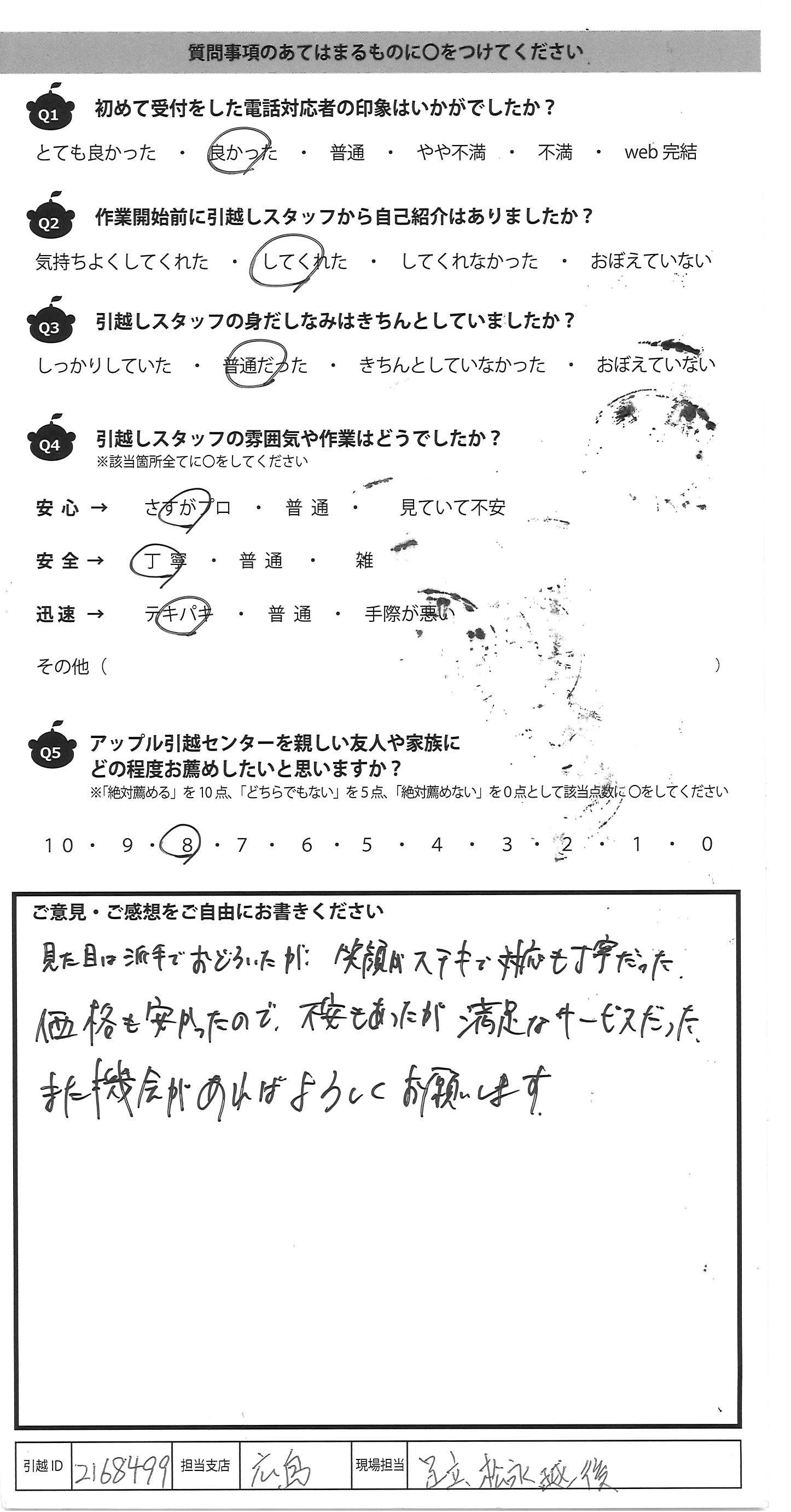 A.暑い中ありがとうございました。 1点だけ、2階に運んでいただいた扇風機の底部に破損がありました。前日梱包した時には破損箇所はなかったはずなので、搬出時か移動中に破損した可能性があります。 元々捨ててもいいと思っていたものなのと、ビニールに入れただけの簡単な梱包だったので破損は仕方ないかもしれませんが、搬出時に梱包の手直しが必要であれば教えたいただけるとありがたかったです! 全体的に無駄のない作業で予定より早く引越し作業が終わり大変感謝です。