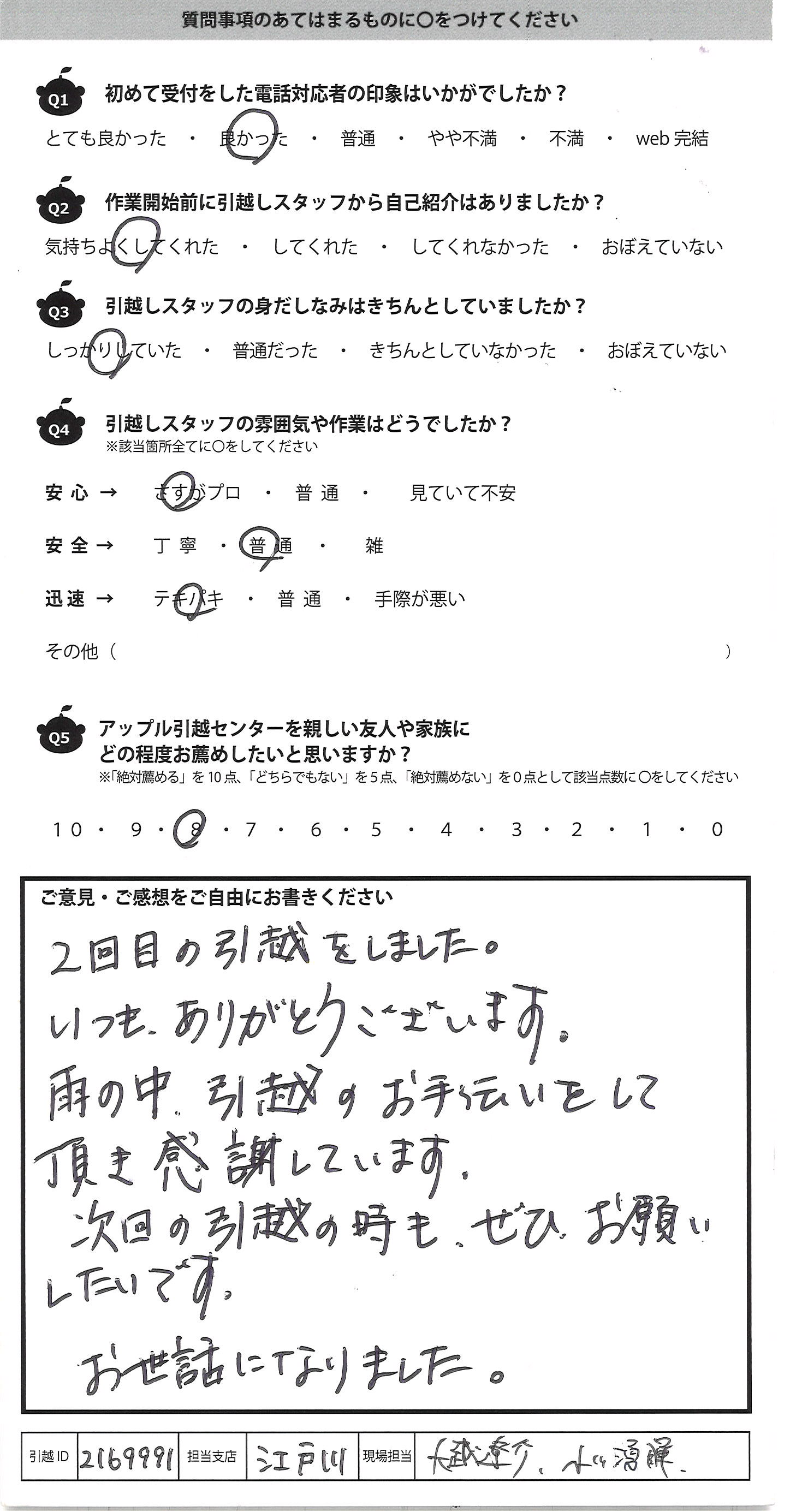 A.2回目の引越をしました。 いつも、ありがとうございます。 雨の中、引越のお手伝いをして 頂き感謝しています。 次回の引越の時もぜひお願い したいです。 お世話になりました。