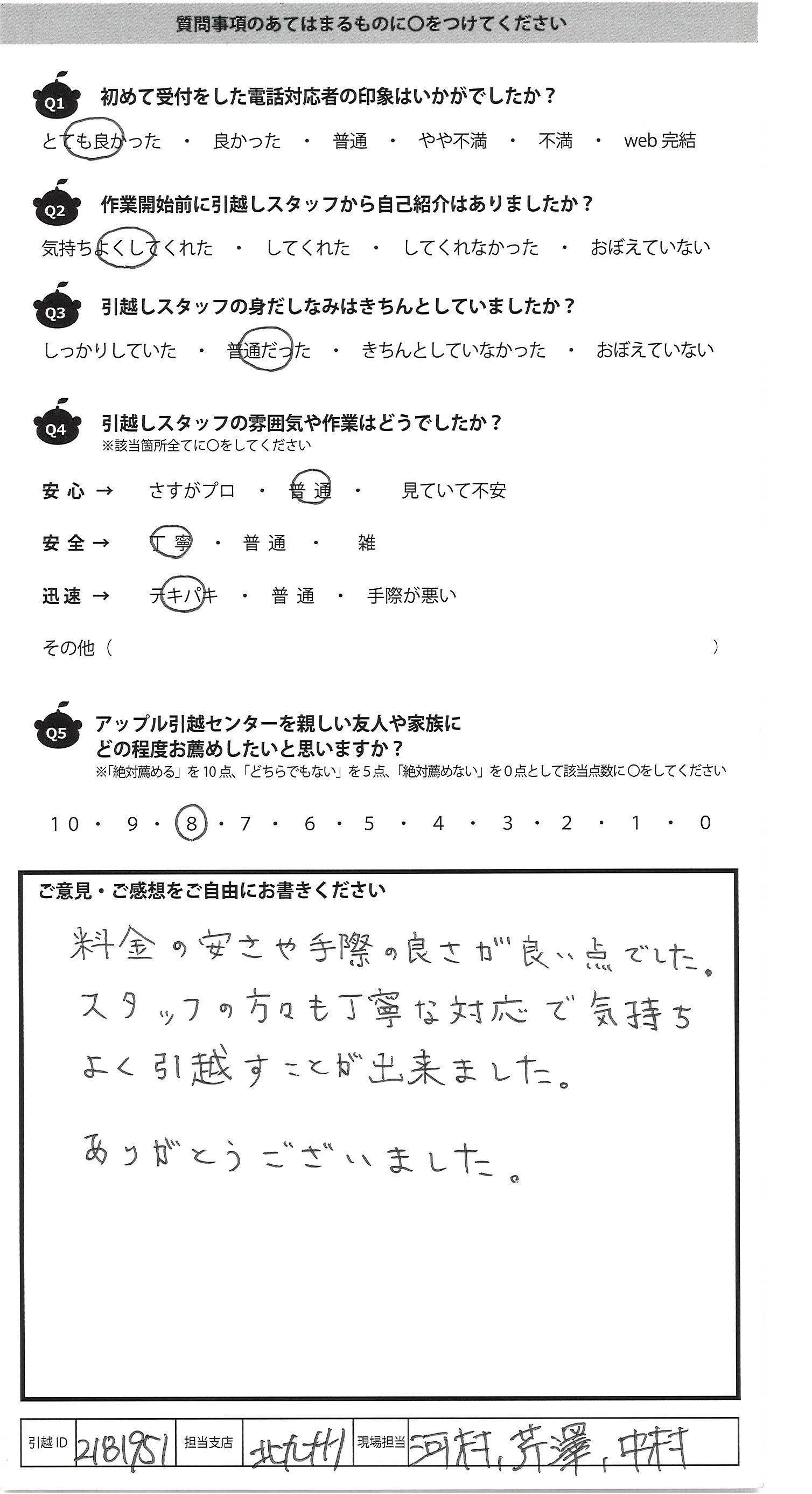 A.料金の安さや手際の良さが良い点でした。 スタッフの方々も丁寧な対応で気持ち よく引越すことが出来ました。 ありがとうございました。