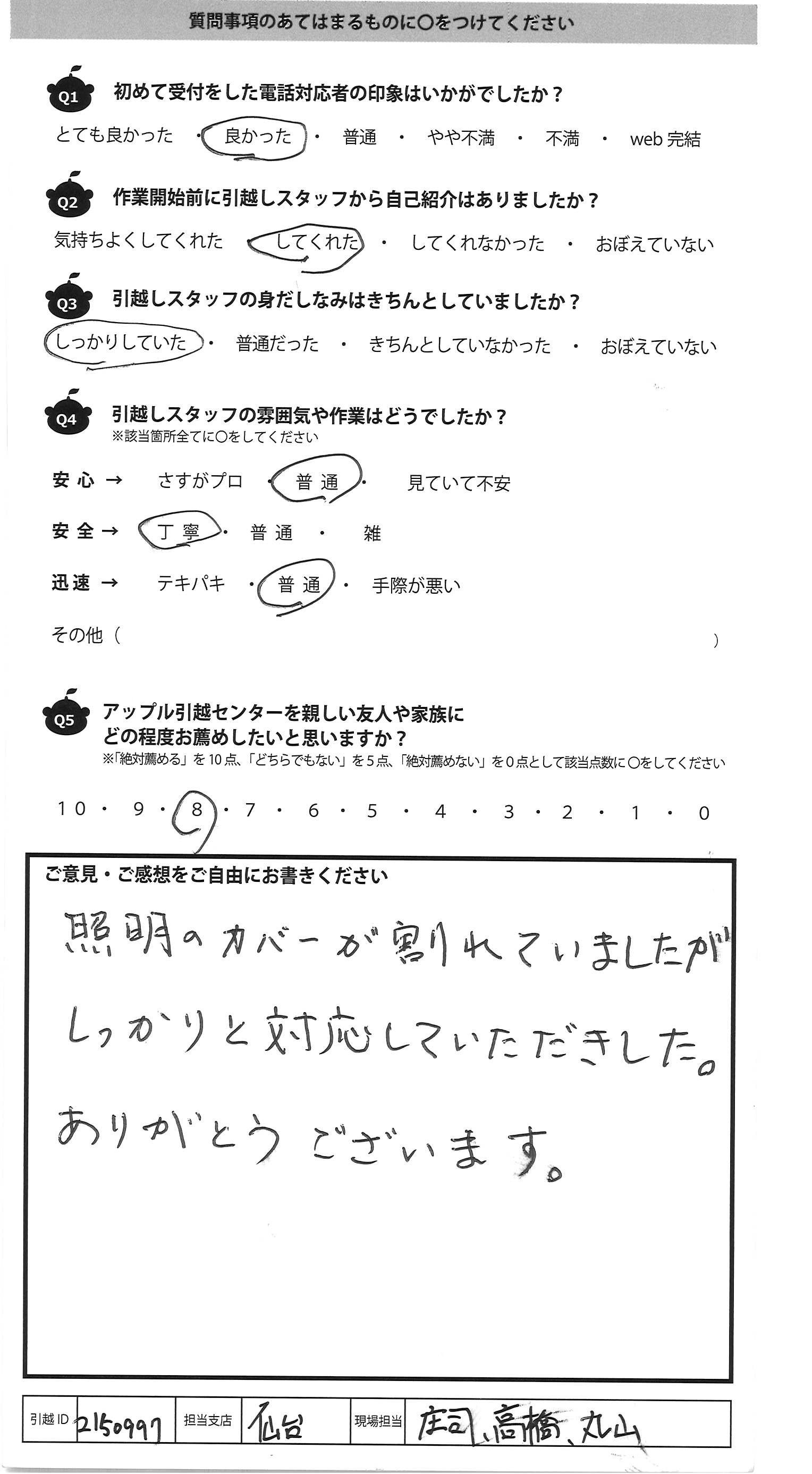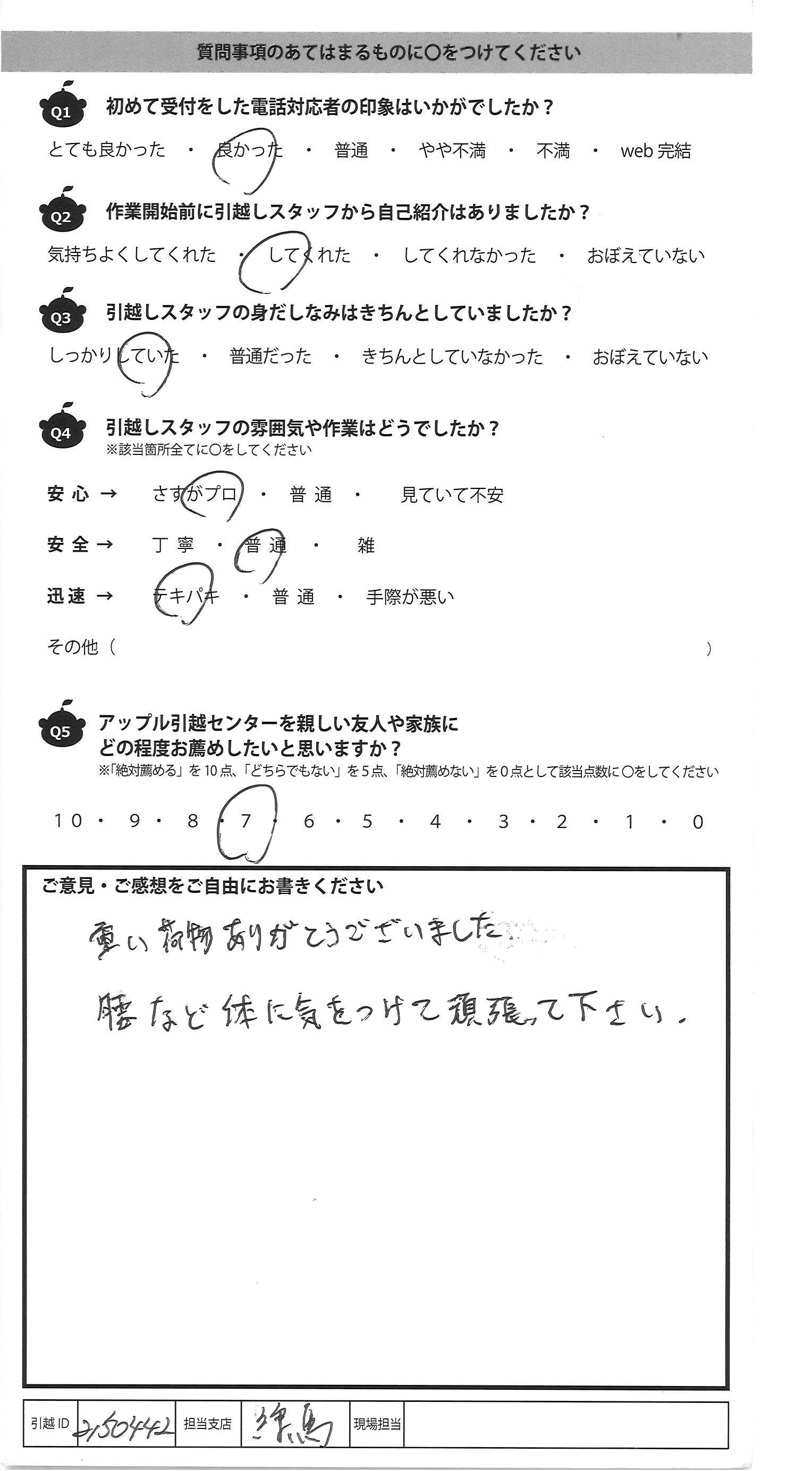 A.作業される方が2名と少なかったが、積み込み、移動、積み下ろしが早く、難しいと考えていた引越し先での転入手続きが可能となった。ただ、昼食も取らずに作業を行なっていないか心配であった。 無事に引越しが完了しました。ありがとうございました。