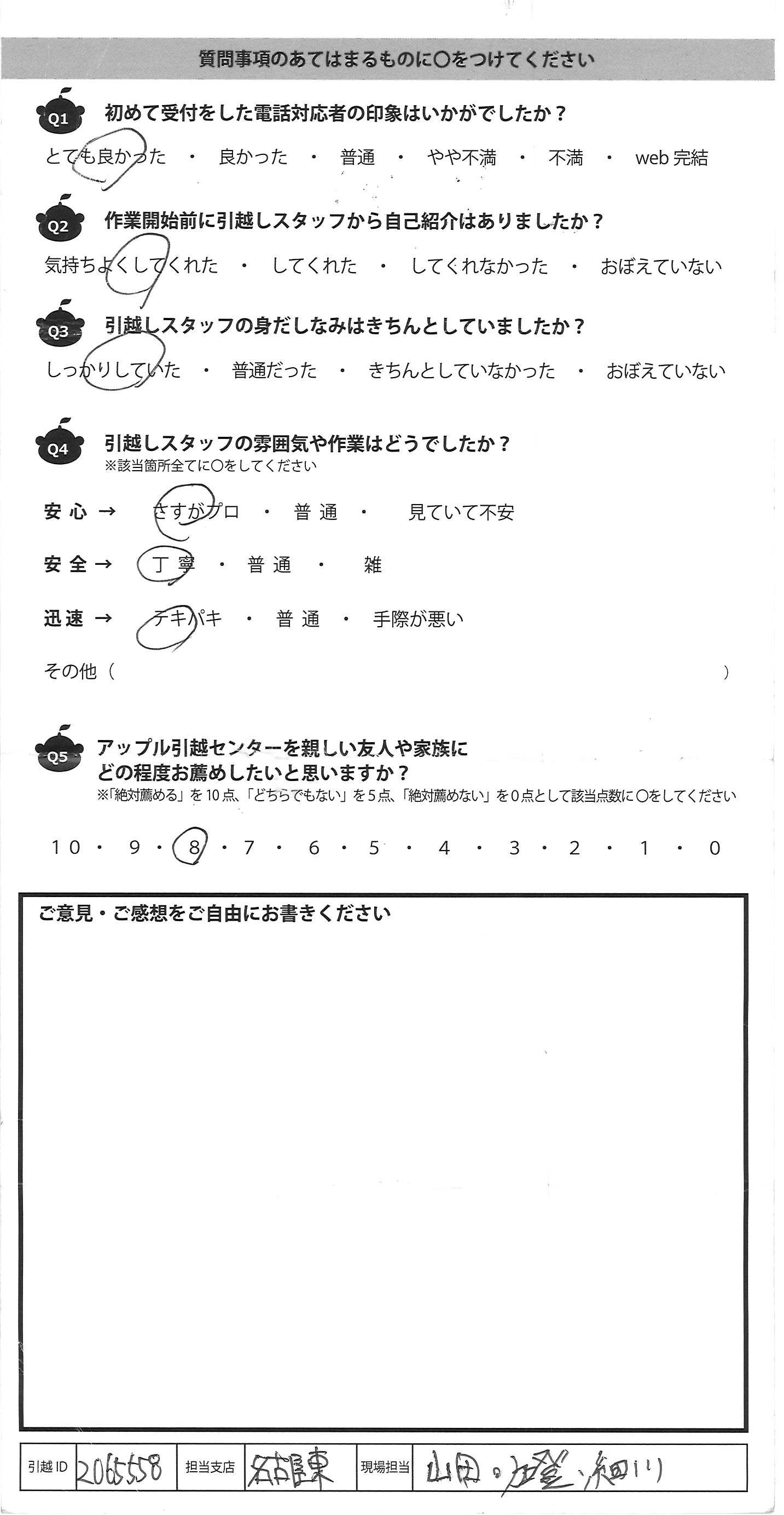 A.見積もりで対応いただい杉浦様にもお礼を申し上げます。 繁忙期だったので、前回の引越しより値段がびっくりするほど高かったですが、納得する値段をご提示いただきました。 ありがとうございます。 これから、何度か引越しをすると思います。その際にはまた声をかけさせていただきます。