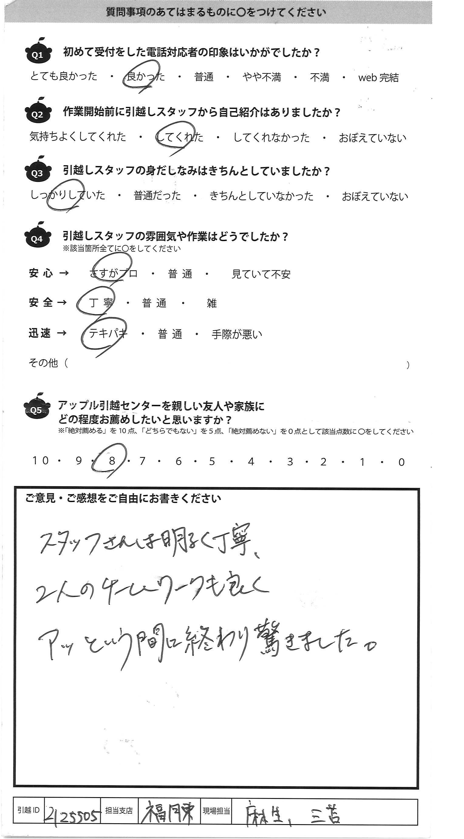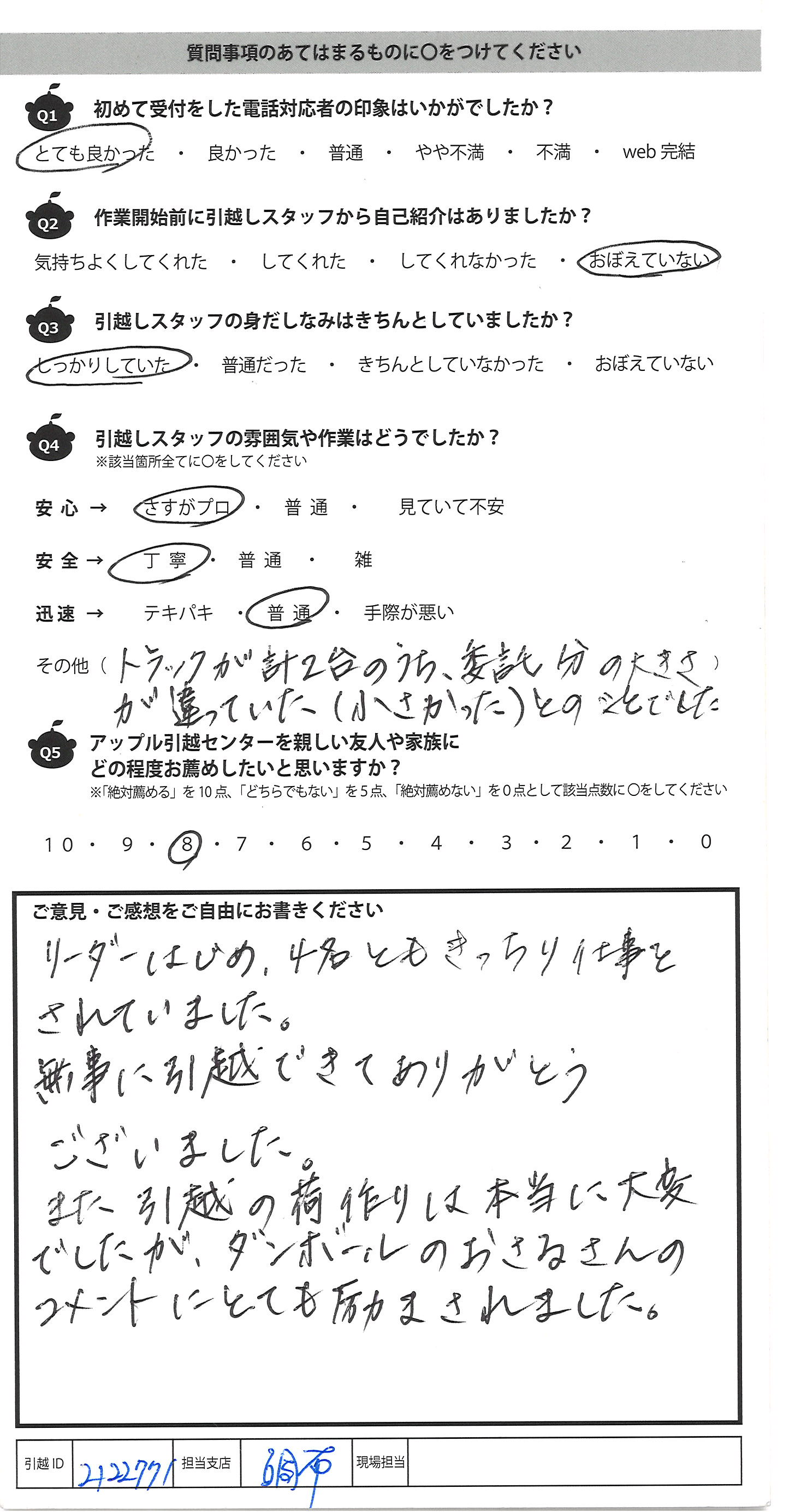 A.リーダーはじめ、4名ともきっちり仕事を されていました。 無事に引越できてありがとう ございました。 また引越の荷作りは本当に大変 でしたが、ダンボールのおさるさんの コメントにとても励まされました。