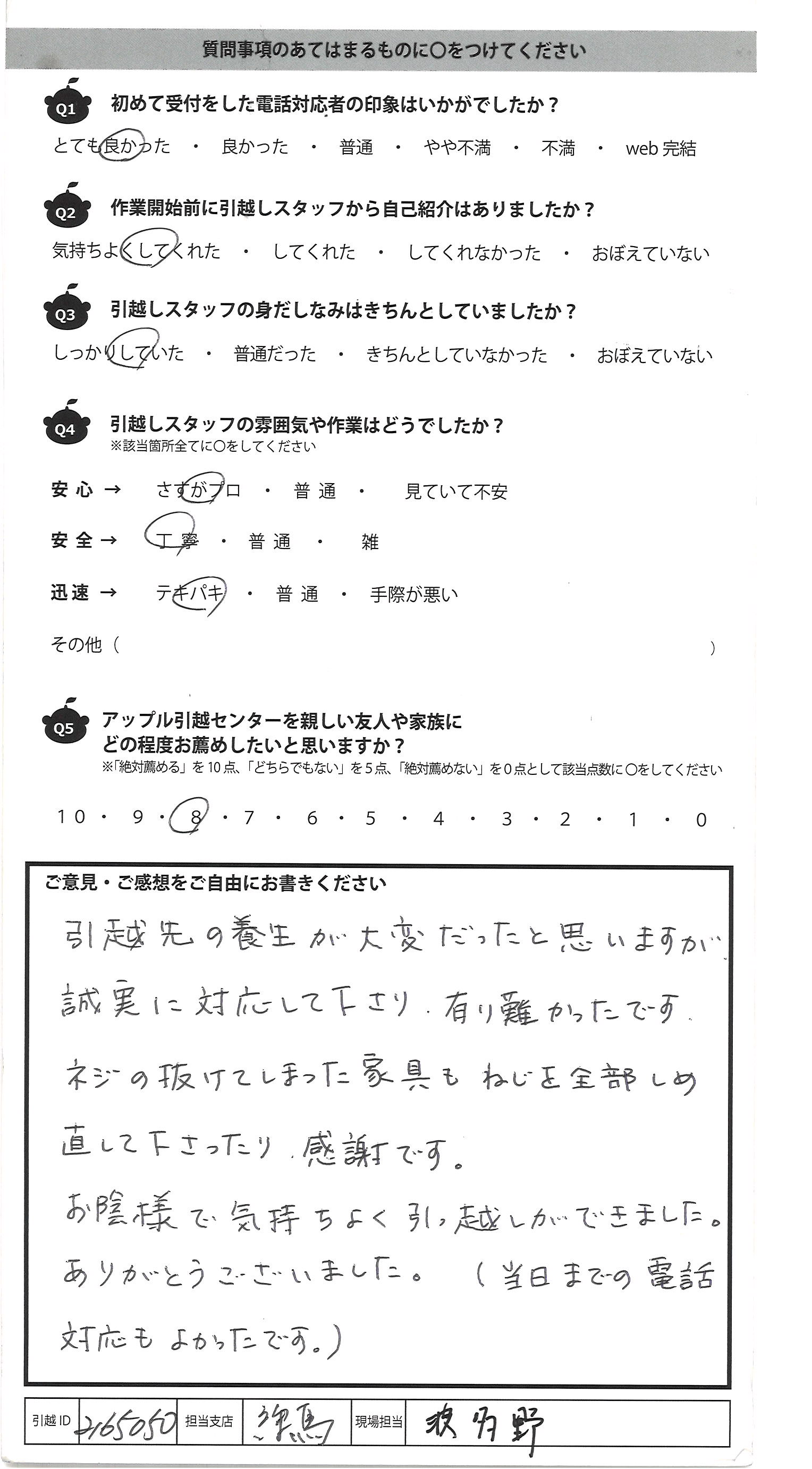 A.引越先の養生が大変だったと思いますが 誠実に対応して下さり、有り難かったです ネジの抜けてしまった家具もねじを全部しめ 直して下さったり、感謝です。 お陰様で気持ちよく引っ越しができました。 ありがとうございました。(当日までの電話 対応もよかったです。)