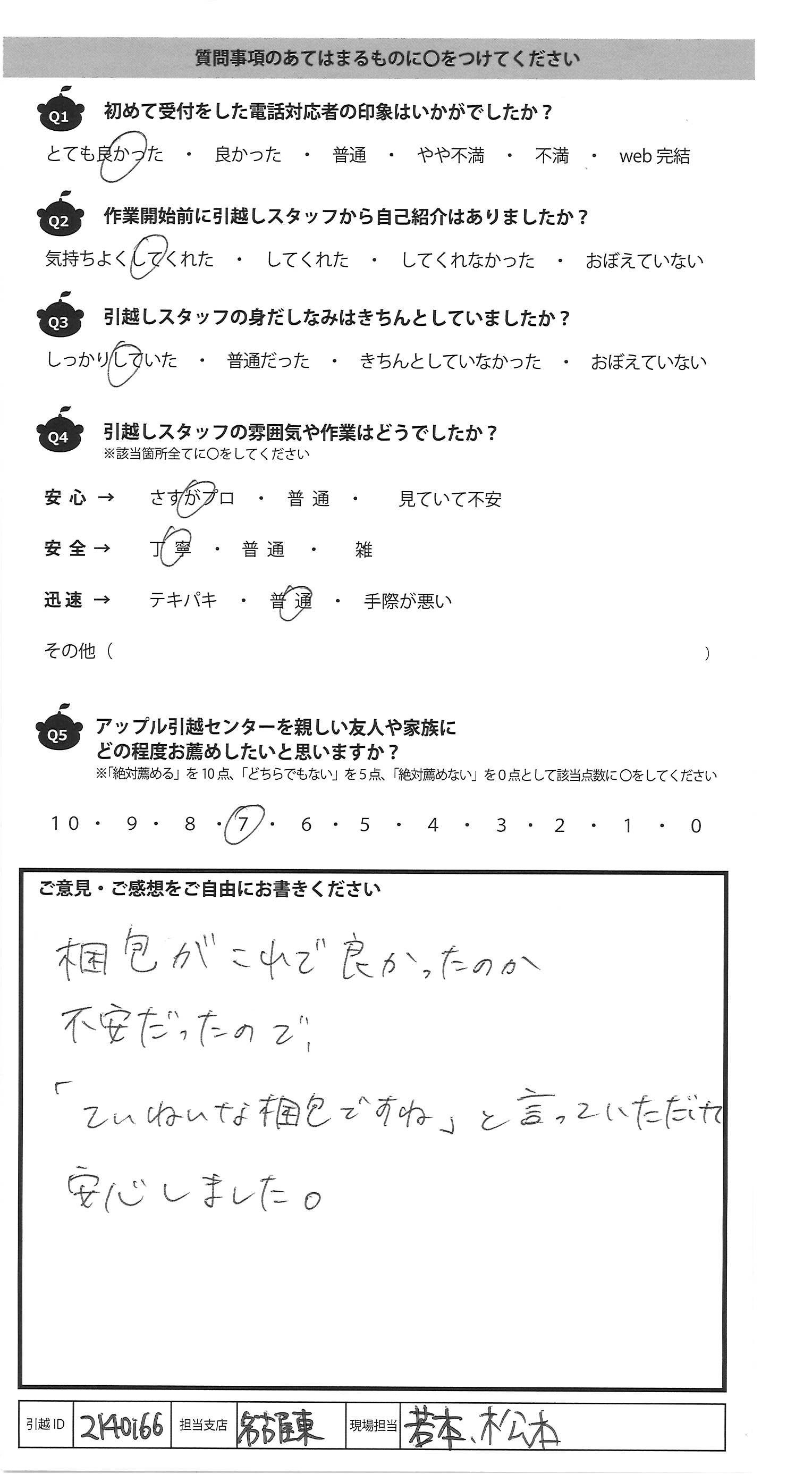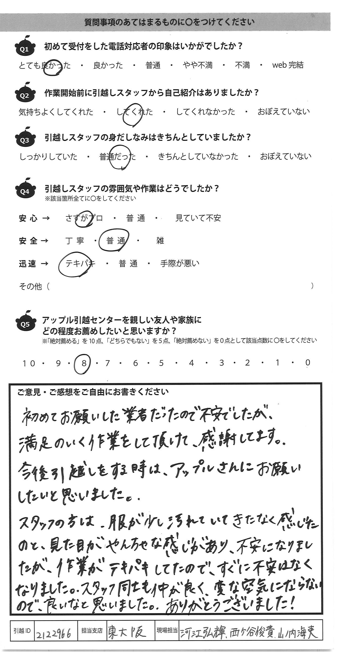A.初めてお願いした業者だったので不安でしたが、 満足のいく作業をして頂けて、感謝してます。 今後引越しをする時は、アップルさんにお願い したいと思いました。 スタッフの方は、服が少し汚れていてきたなく感じた のと、見た目がやんちゃな感じがあり、不安になりまし たが、作業がテキパキしていたので、すぐ不安はなく なりました。スタッフ同士も仲が良く、変な空気にならない ので、良いなと思いました。ありがとうございました!
