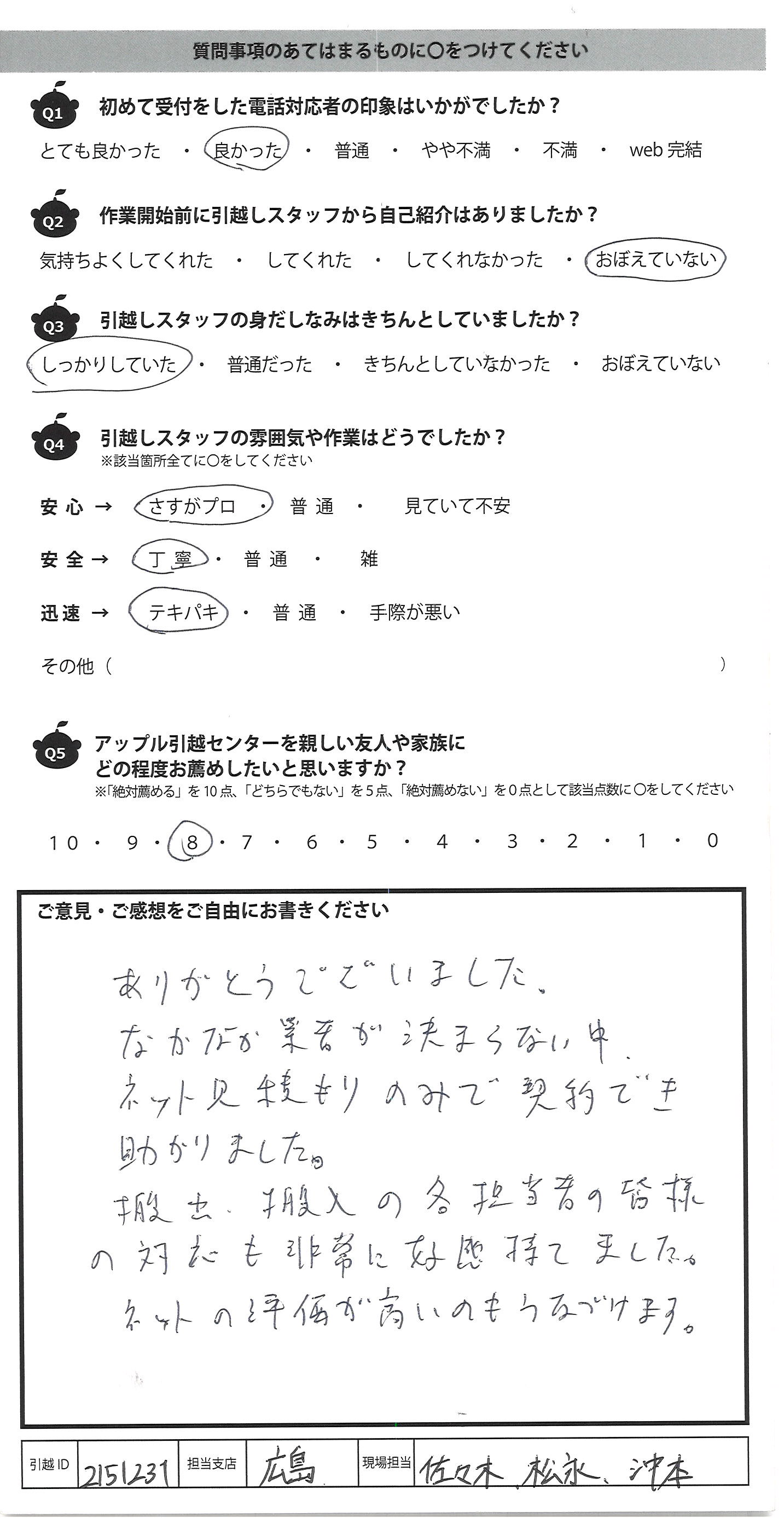 A.ありがとうございました。 なかなか業者が決まらない中、 ネット見積もりのみで契約でき 助かりました。 搬出、搬入の各担当者の皆様 の対応も非常に好感持てました。 ネットの評価が高いのもうなづけます。