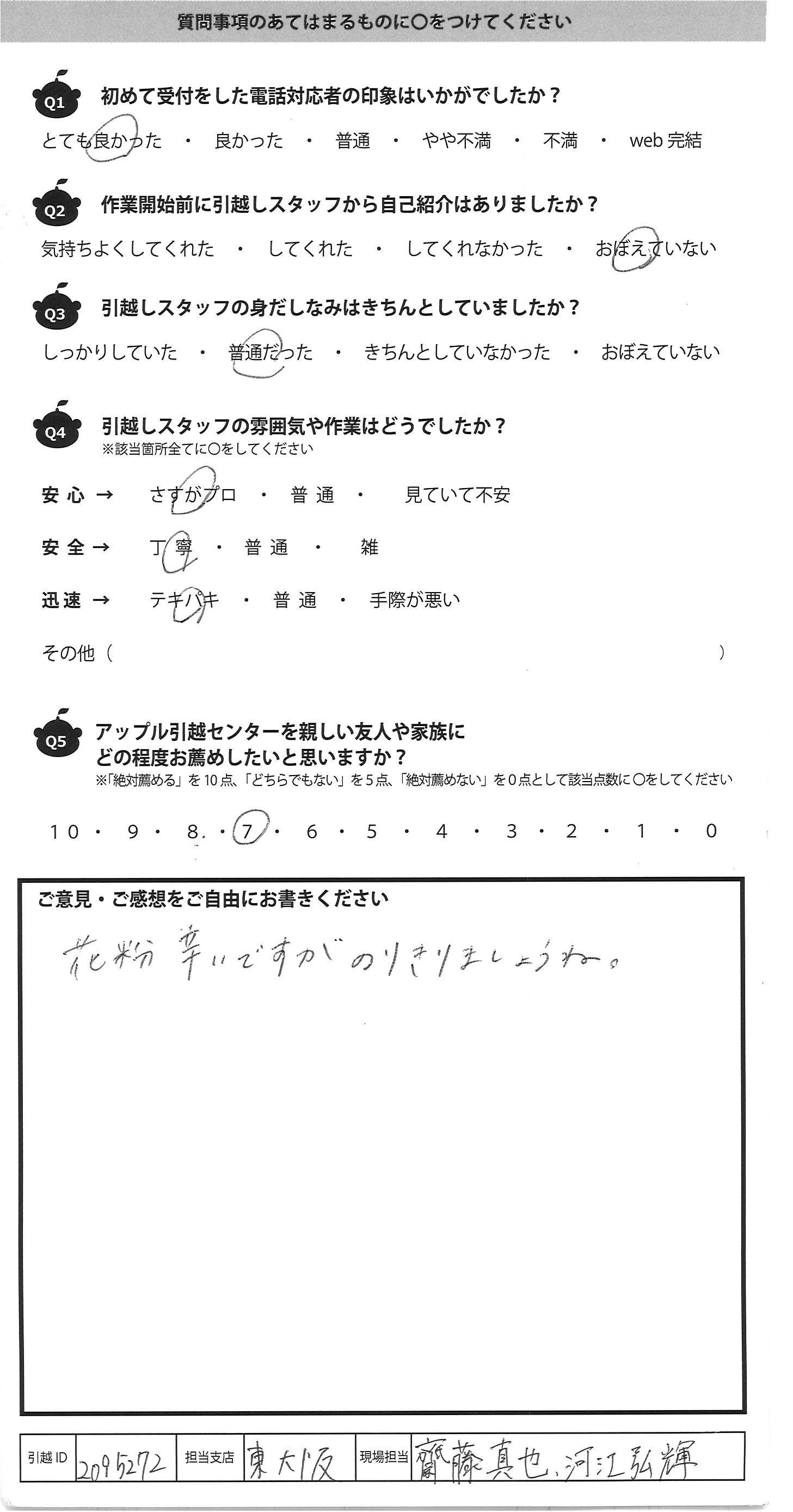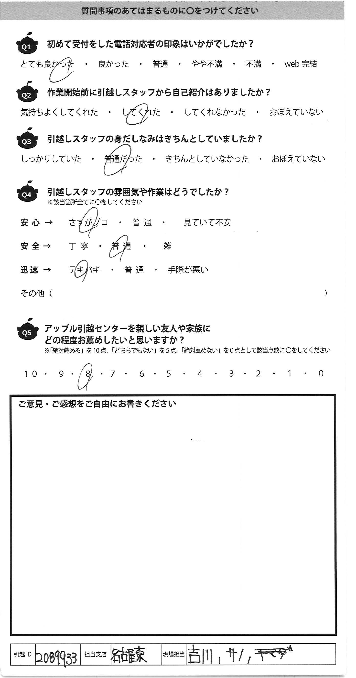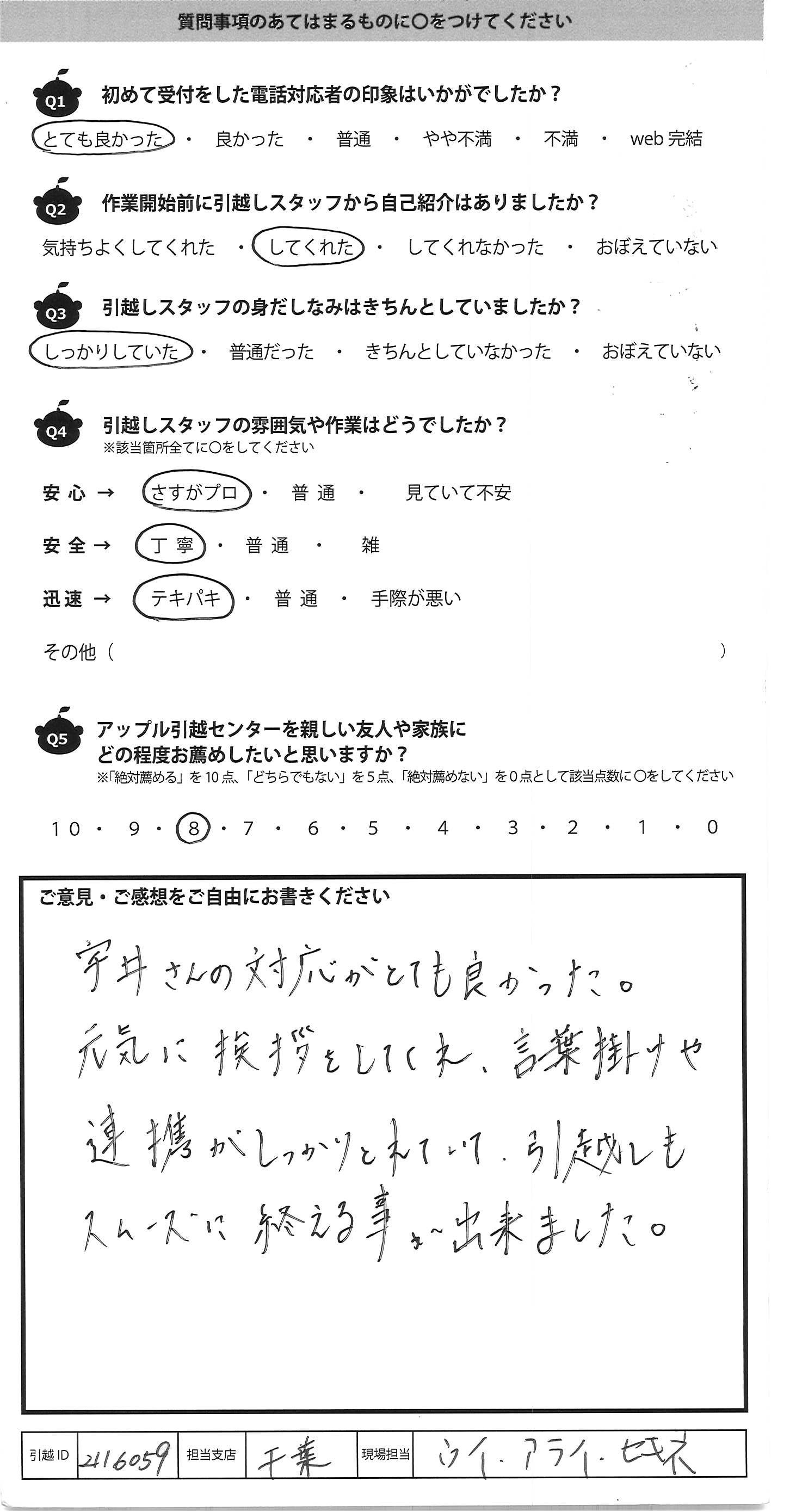 A.宇井さんの対応がとても良かった。 元気に挨拶をしてくれ、言葉掛けや 連携がしっかりとれていて、引越しも スムーズに終える事が出来ました。