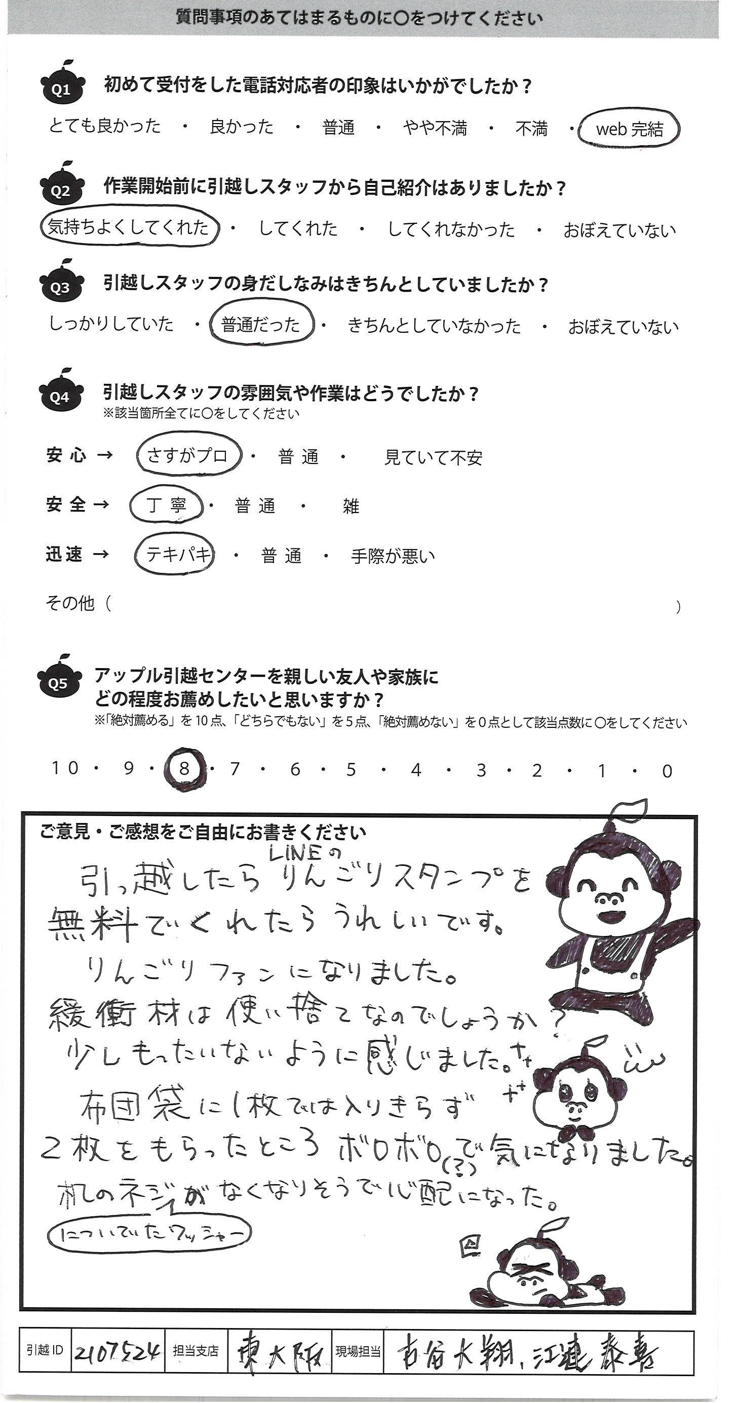 アップル引越センターでは、面映いお褒めの言葉も、胸に突き刺さるお叱りのコメントも、