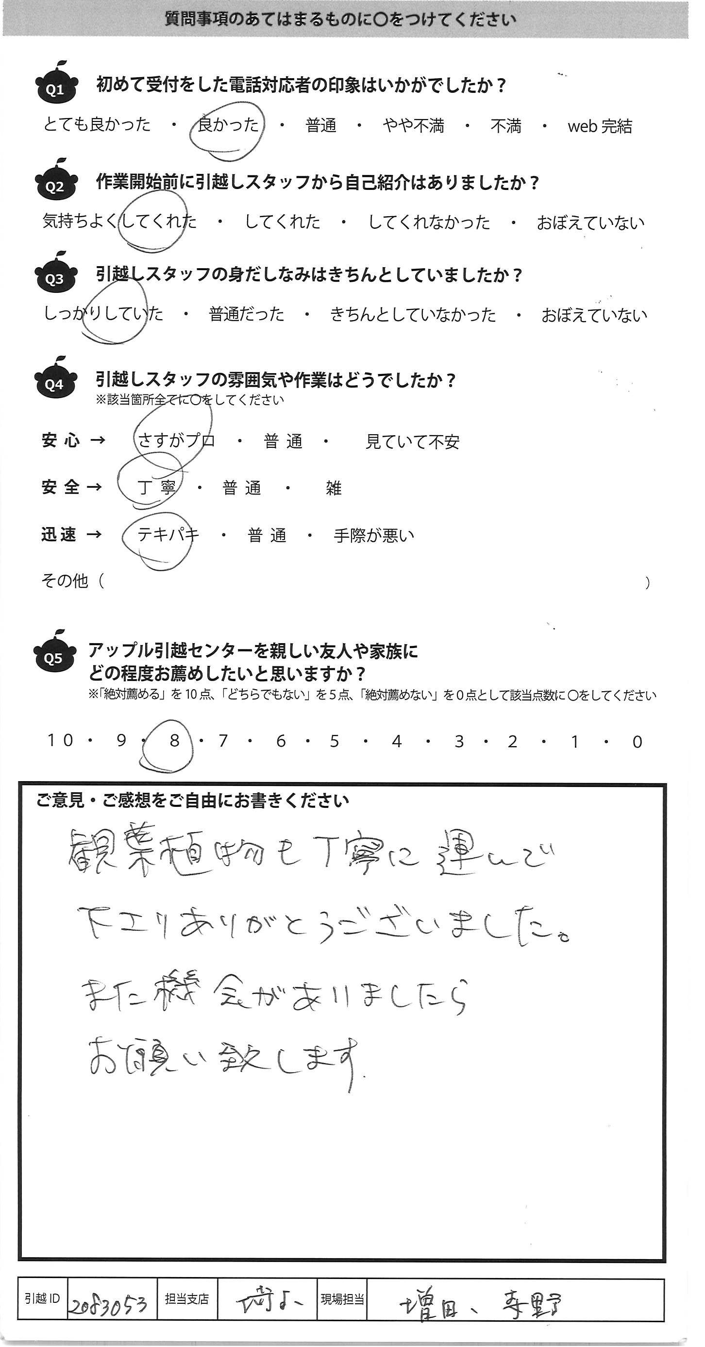 A.営業担当への電話が混雑のためつながり にくかった。担当の栗原さんはとても対応 がよく、おまかせできて良かった。 当日のご担当の皆さまも短かい時間で ていねいに荷物を扱っていただきました。 ありがとうございました。