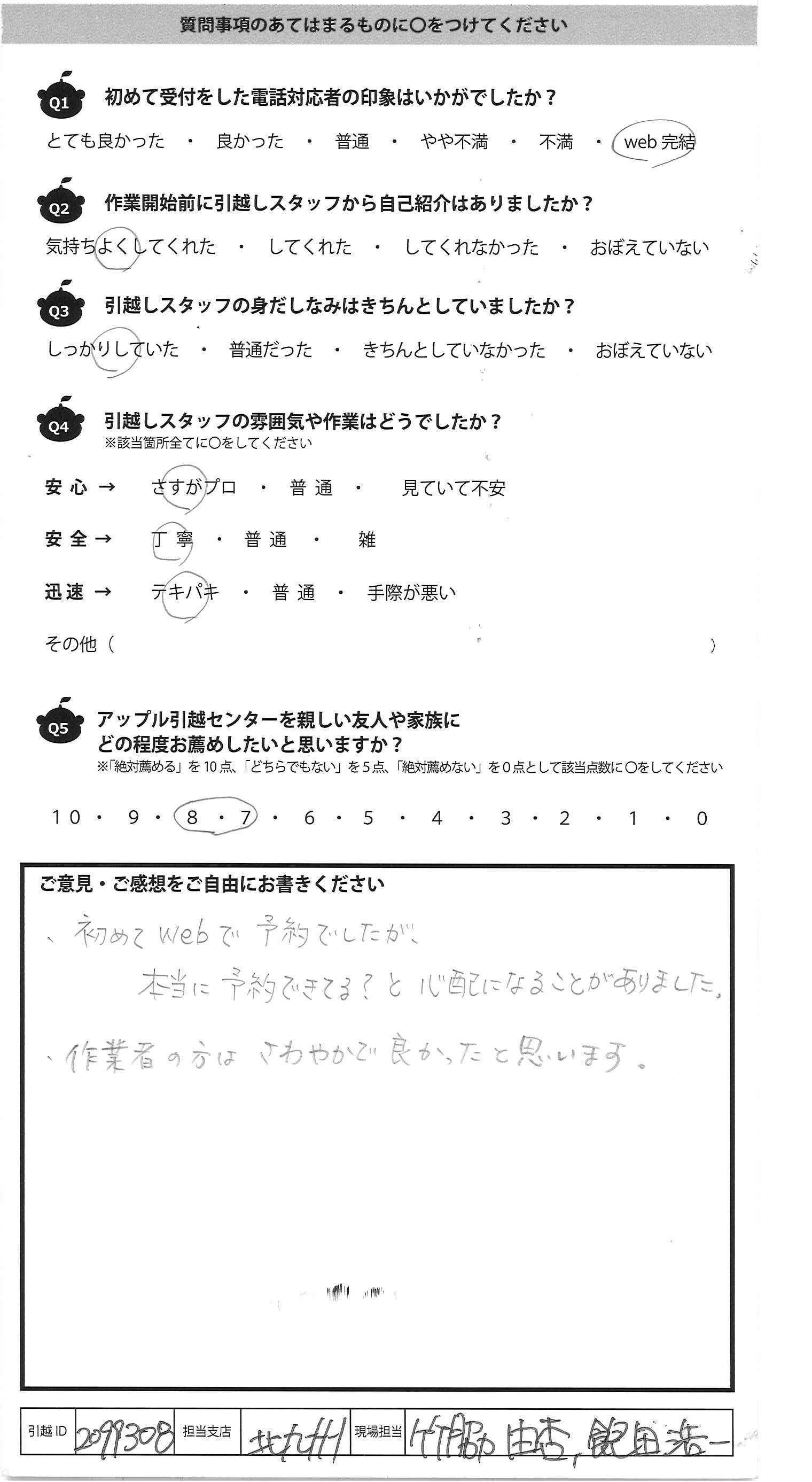 A.・初めてwebで予約でしたが、 本当に予約できてる?と心配になることがありました。 ・作業者の方はさわやかで良かったと思います。