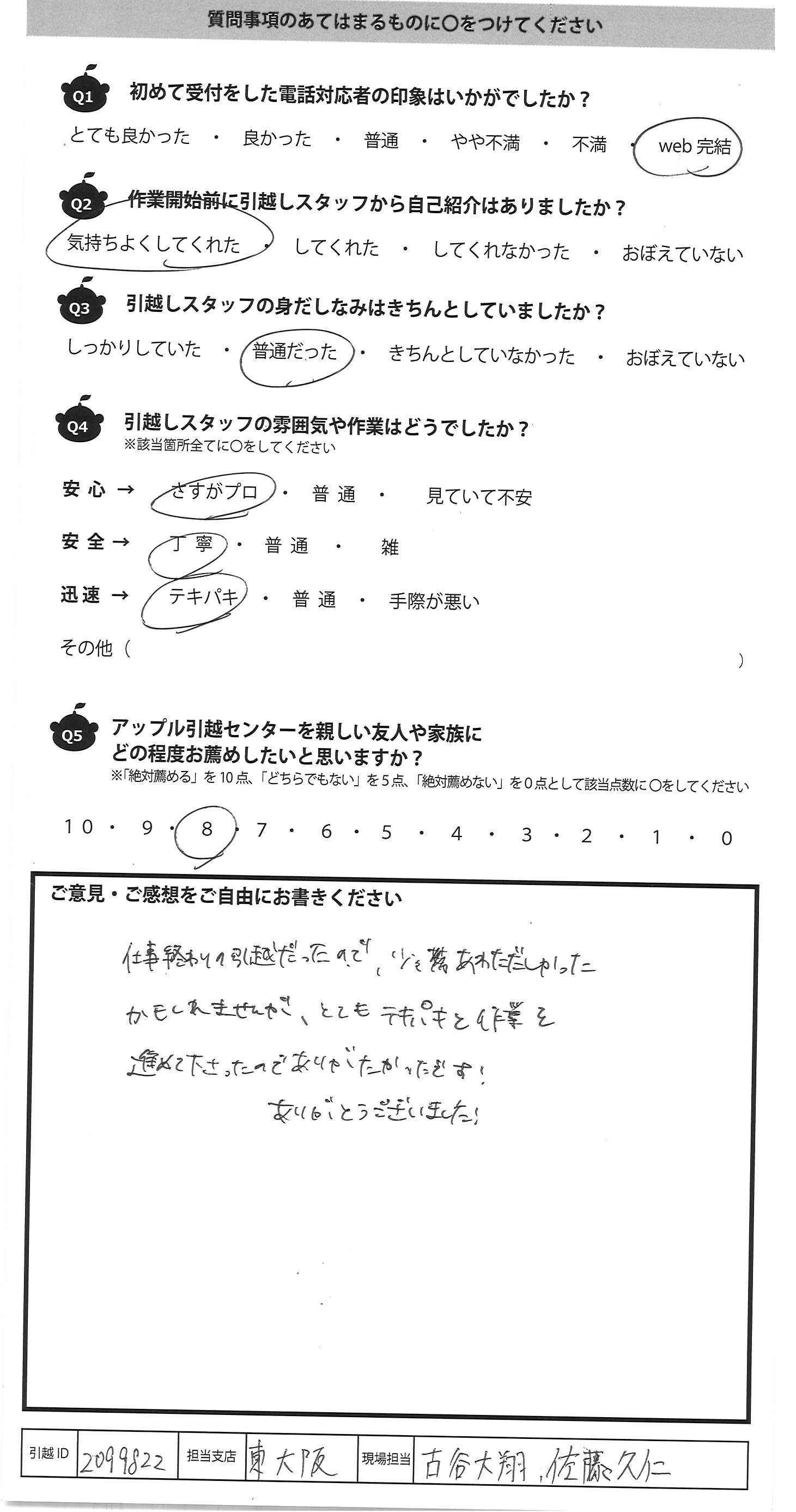 A.仕事終わりの引越だったので、少しあわただしかった かもしれませんが、とてもテキパキと作業を 進めて下さったのでありがたかったです! ありがとうございました!