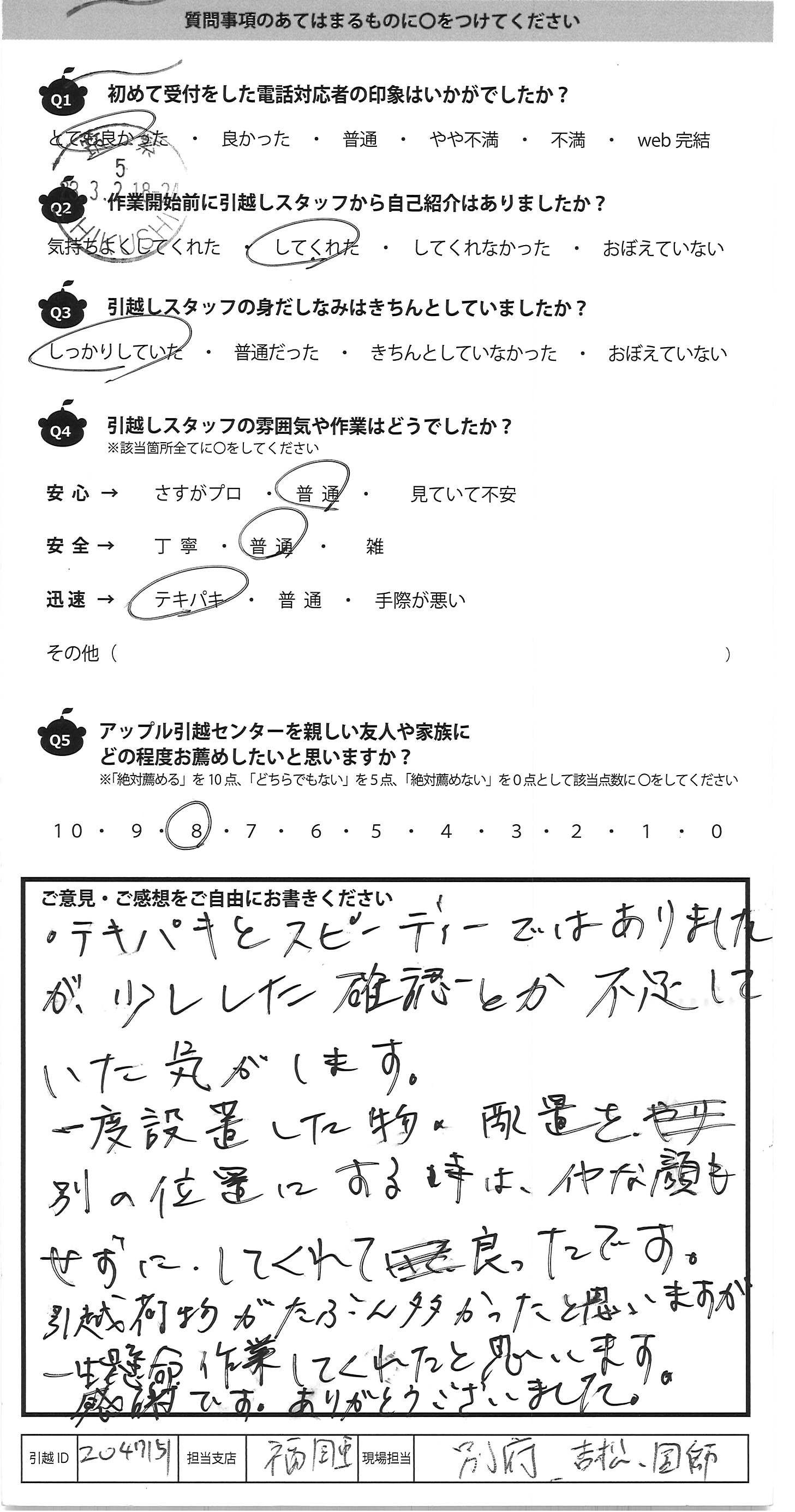A.・テキパキとスピーディーではありました が、少しした確認とか不足して いた気がします。 一度設置した物の配置を 別の位置にする時は、イヤな顔も せずに、してくれて良かったです。 引越荷物がたぶん多かったと思いますが 一生懸命作業してくれたと思います。 感謝です。ありがとうございました。
