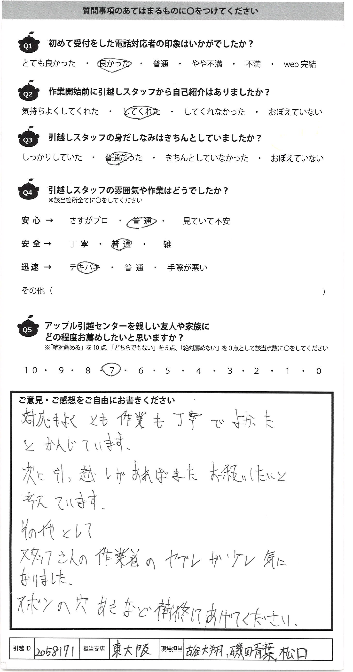A.対応もよくとも作業も丁寧でよかった とかんじています、 次に引っ越しがあればまたお願いしたいと 考えています、 その他として スタッフさんの作業着のヤブレが少し気に なりました、 ズボンの穴あきなど補修してあげてください、