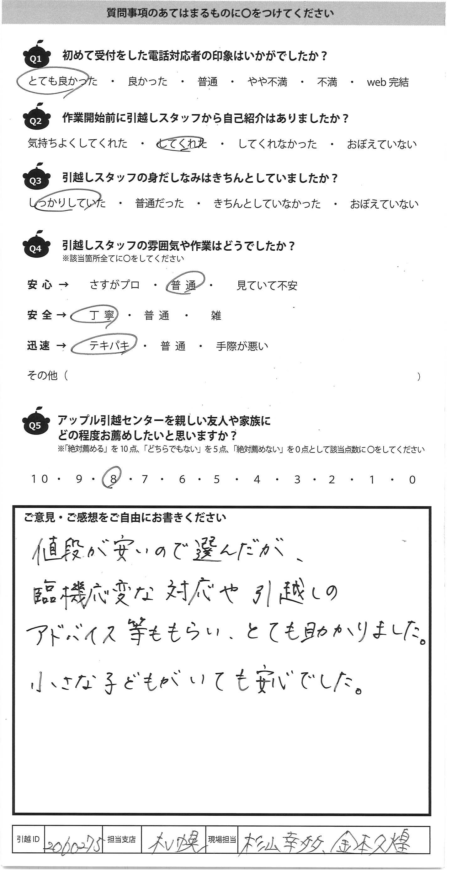 A.値段が安いので選んだが、 臨機応変な対応や引越しの アドバイス等ももらい、とても助かりました。 小さな子どもがいても安心でした。