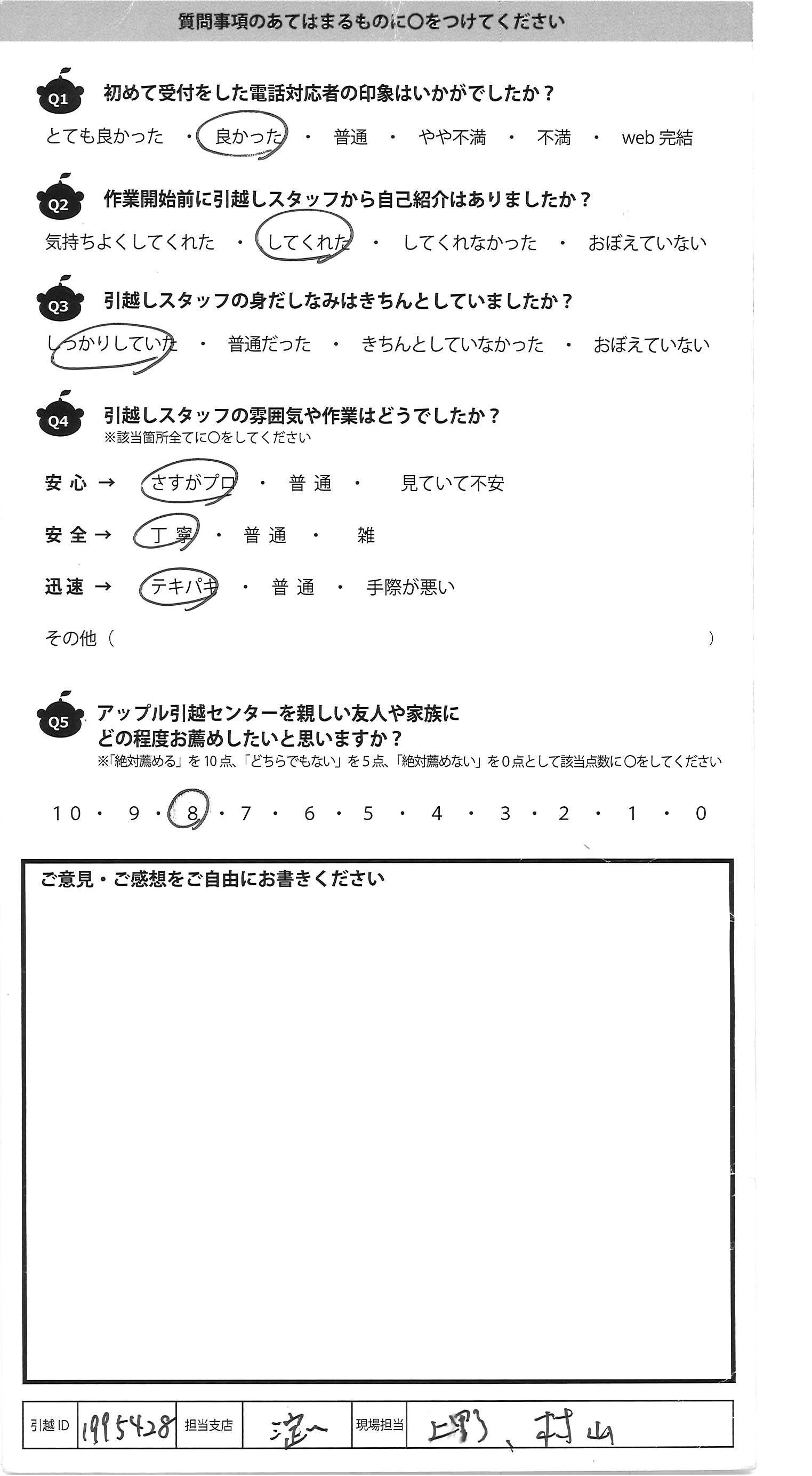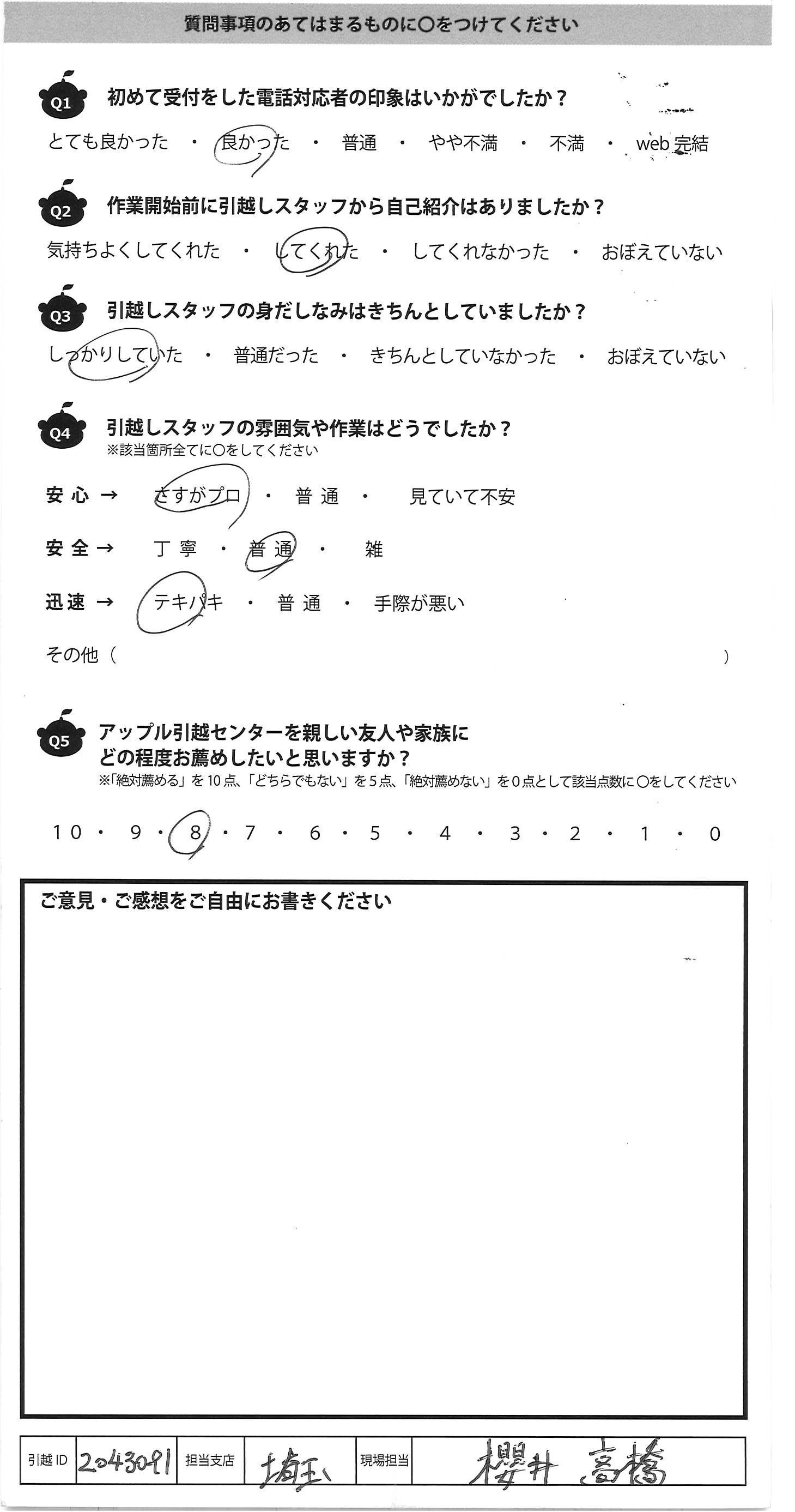 A.若いお二人で作業して頂きました。引越し先が 4Fで階段しかなくそんな大変な中作業を して下さりとても感謝しています 引越し後にバタバタしておりすぐにアンケートが送れ ずにすみませんでした。 どうもありがとうございました!
