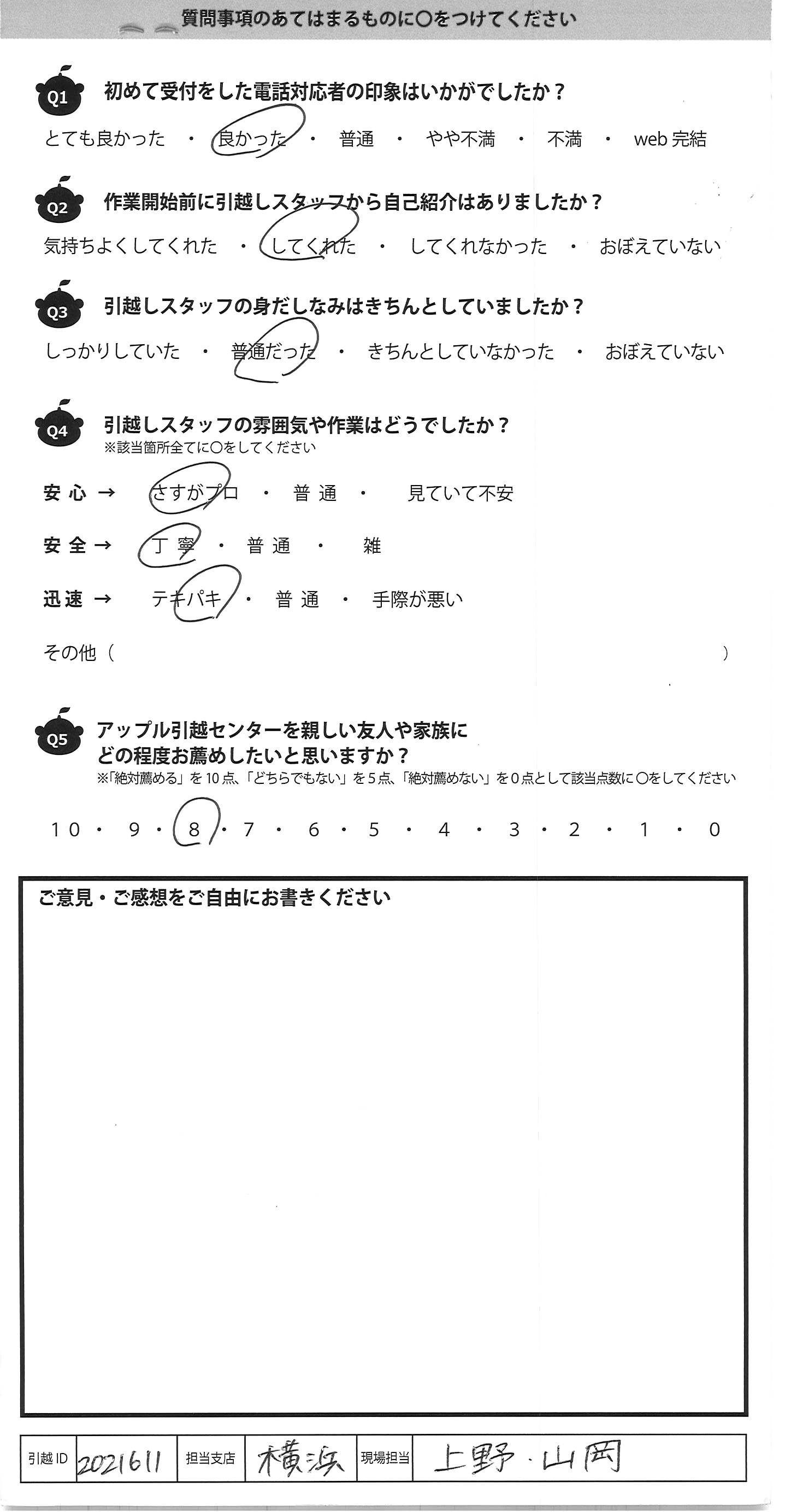 A.本部に対しては改善して欲しいことがございます。戸建で手作業による重量分の運搬だったため、適切な人員配置ではなかったと思います。これは担当いただいた方々ではなく、本部の問題と存じます。