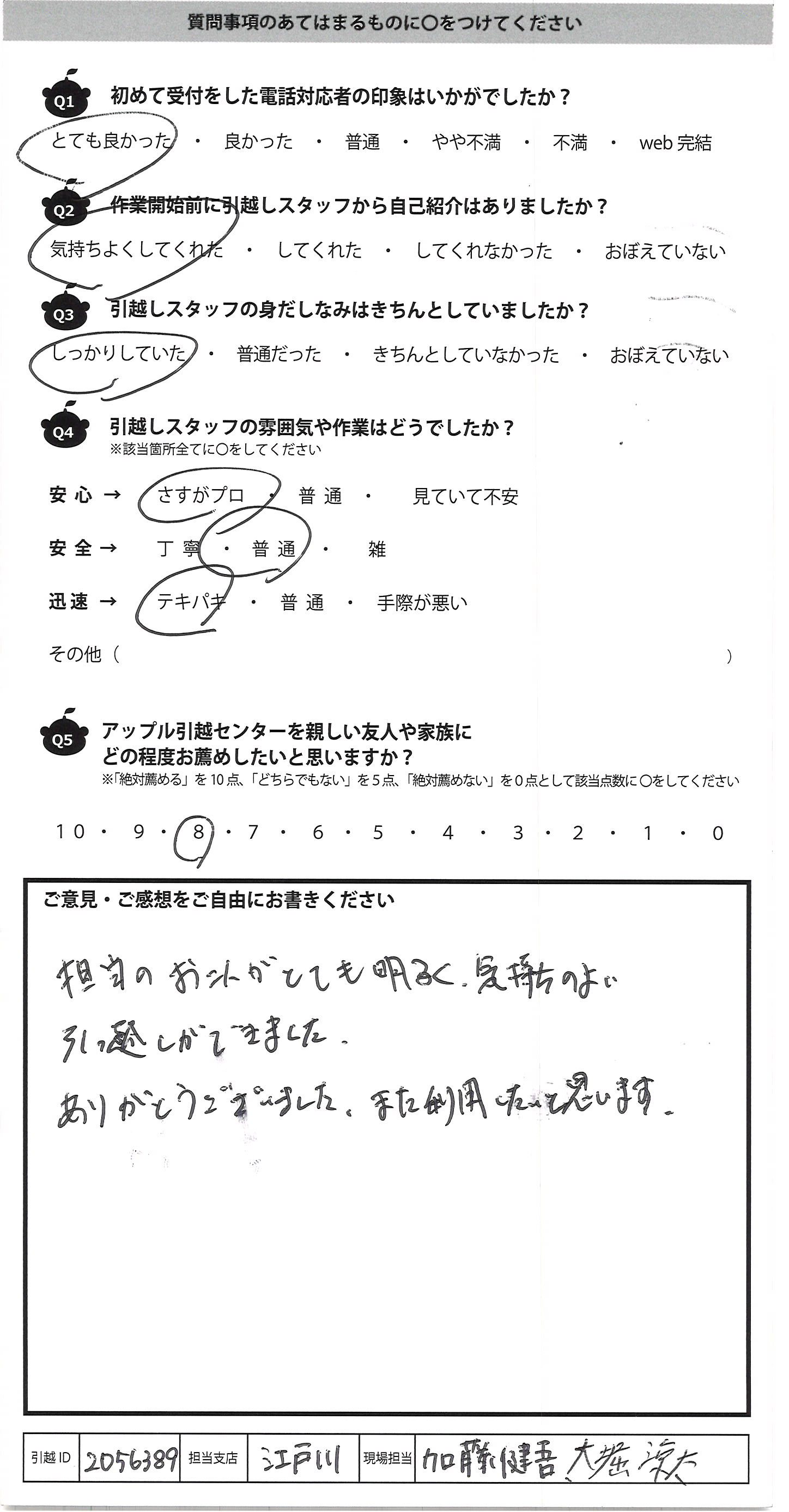 A.本日はご対応いただきありがとうございました 終始丁寧に作業していただき、安心して引っ越しを 終えることが出来ました また当日に引取物の変更がありましたが、臨機応変 に対応してくださり、助かりました また、機会がありましたら、よろしくお願い申し上げます