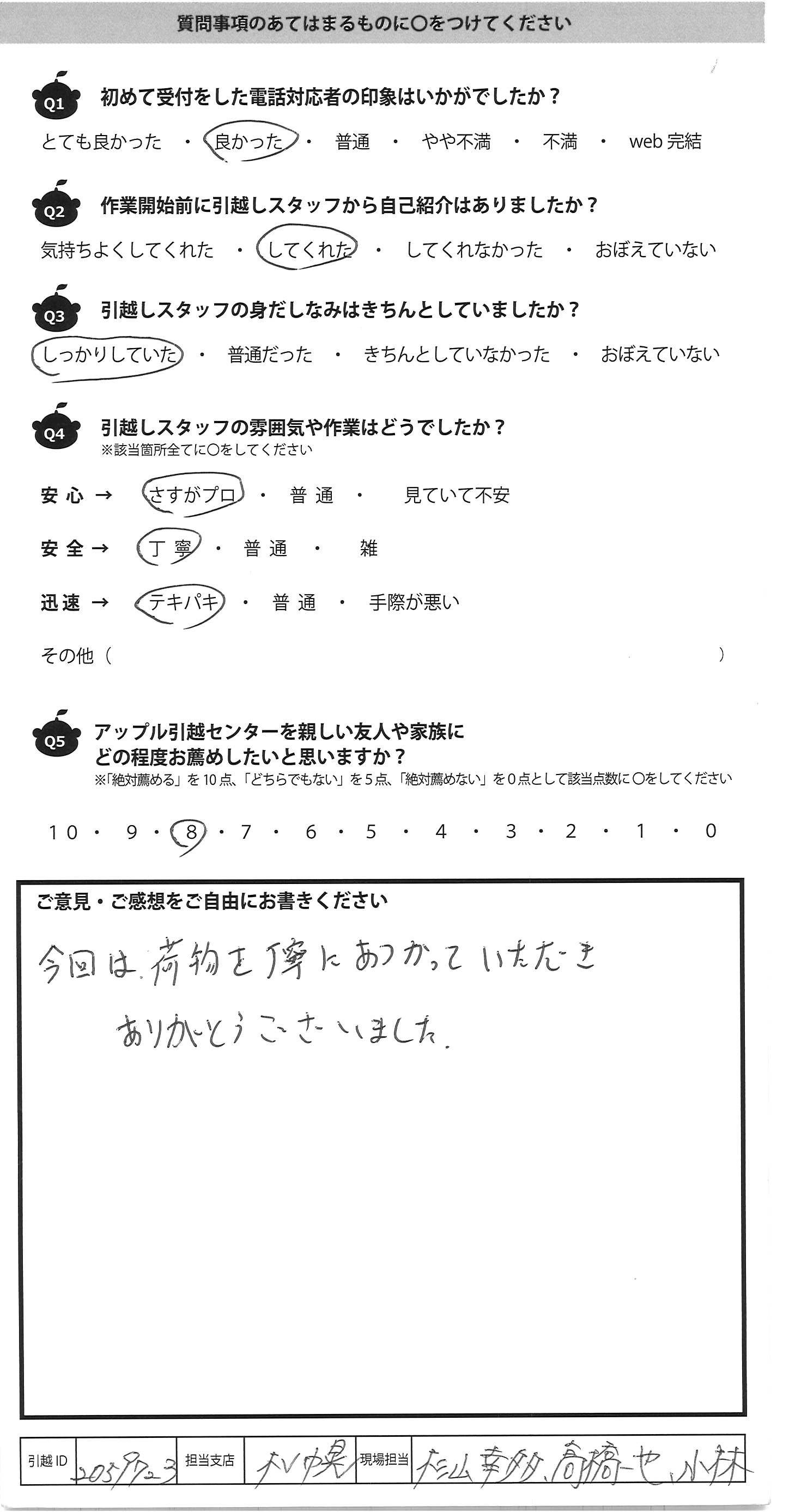 A.毛利さん、岩見さん どちらが男性、女性か忘れましたが 男性の方はとても的確にスピーディーに動いてオペレーションも取っていて感心しました。見た目とのギャップにやられました笑 家具の解体も手慣れた感じで本当に無駄な動きゼロですごかったです。 女性の方も頑張ってついて行ってました!もうちょっと焦っている感じを出さなかったら安心感につながると思います。 生産性を求められていると思うのでしょうがないと思いますが!実際、速さに本当に驚きました。 でも手続きなどは女性の方がやりましたが、とても丁寧で好感が待てて素晴らしかったです。 アンケート用紙も女性の方からしっかりアンケートの意味、想いを持って渡してくれたのですが、適当に働いている人材だったらサッと渡して終わると思います。ですので、真面目でとても良い人材だと思います。私も従業員バイトを多く抱えている仕事をしているので分かります。 また、諦めていたIKEAのデカいテレビ台も解体、設置もして頂き新居でも使用できて助かりました。 この作業込みで、この値段はかなり安いと思いますので次回引越しの際は他社見積もり無しでこちらにお願いすると思います! ありがとうございました! 担当者は 毛利、岩見、宇井、吉田