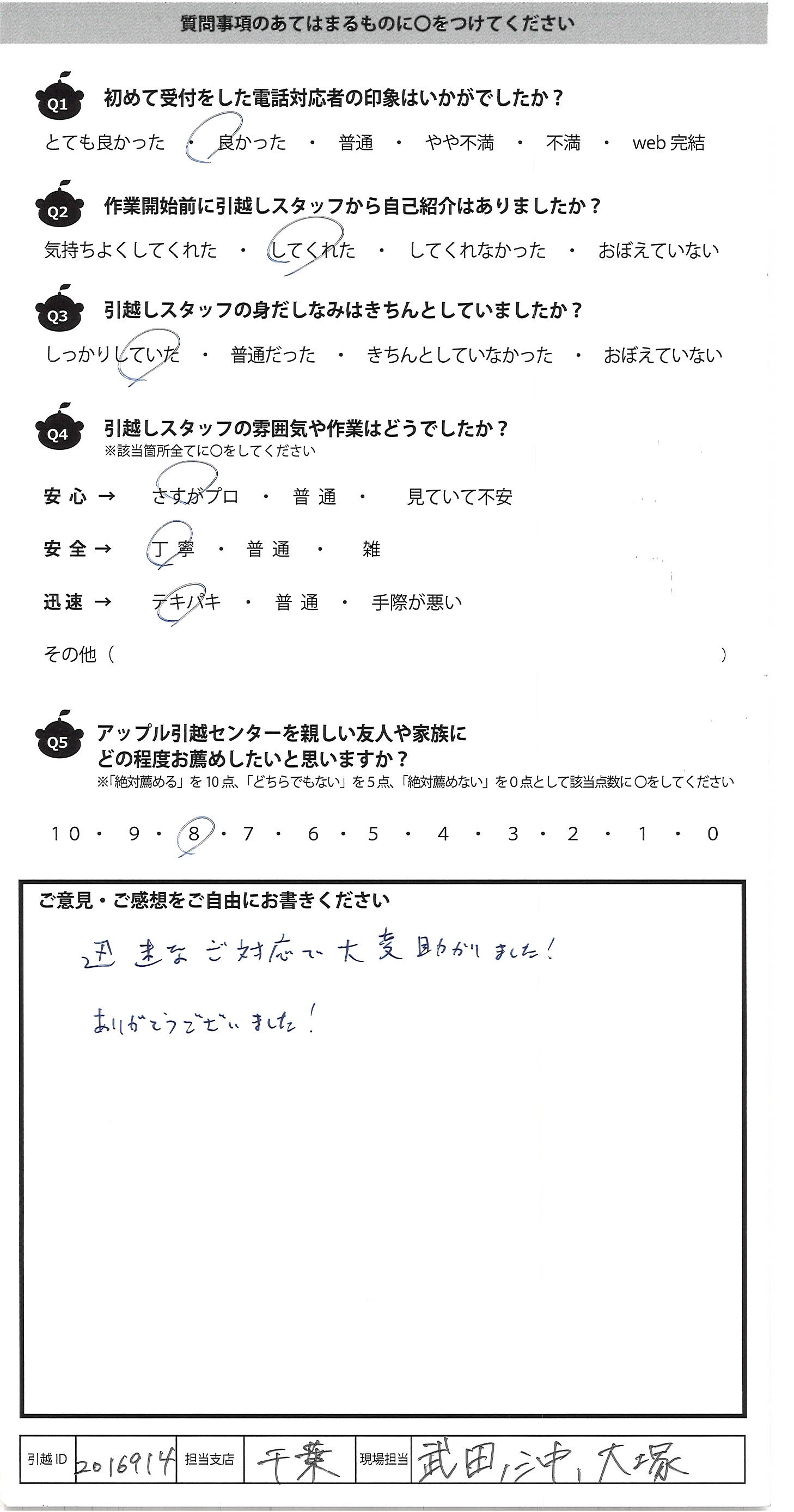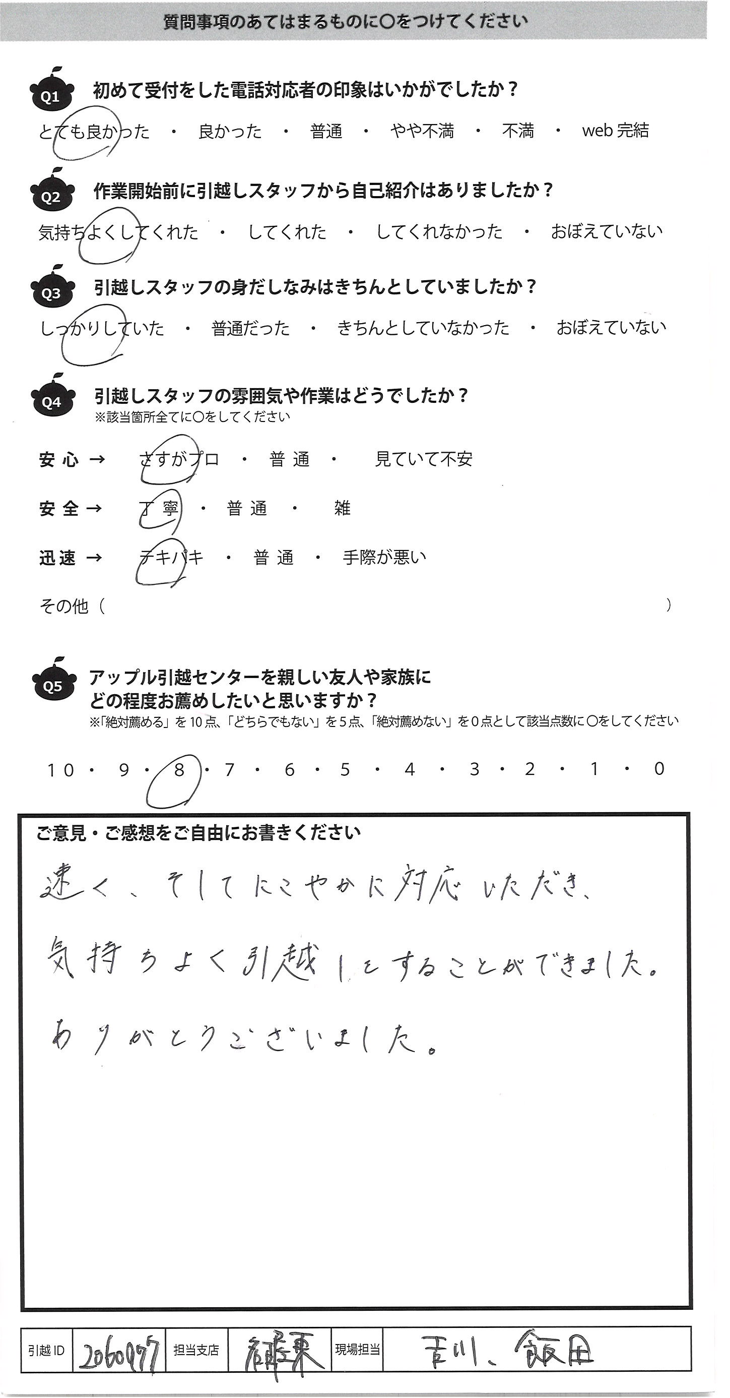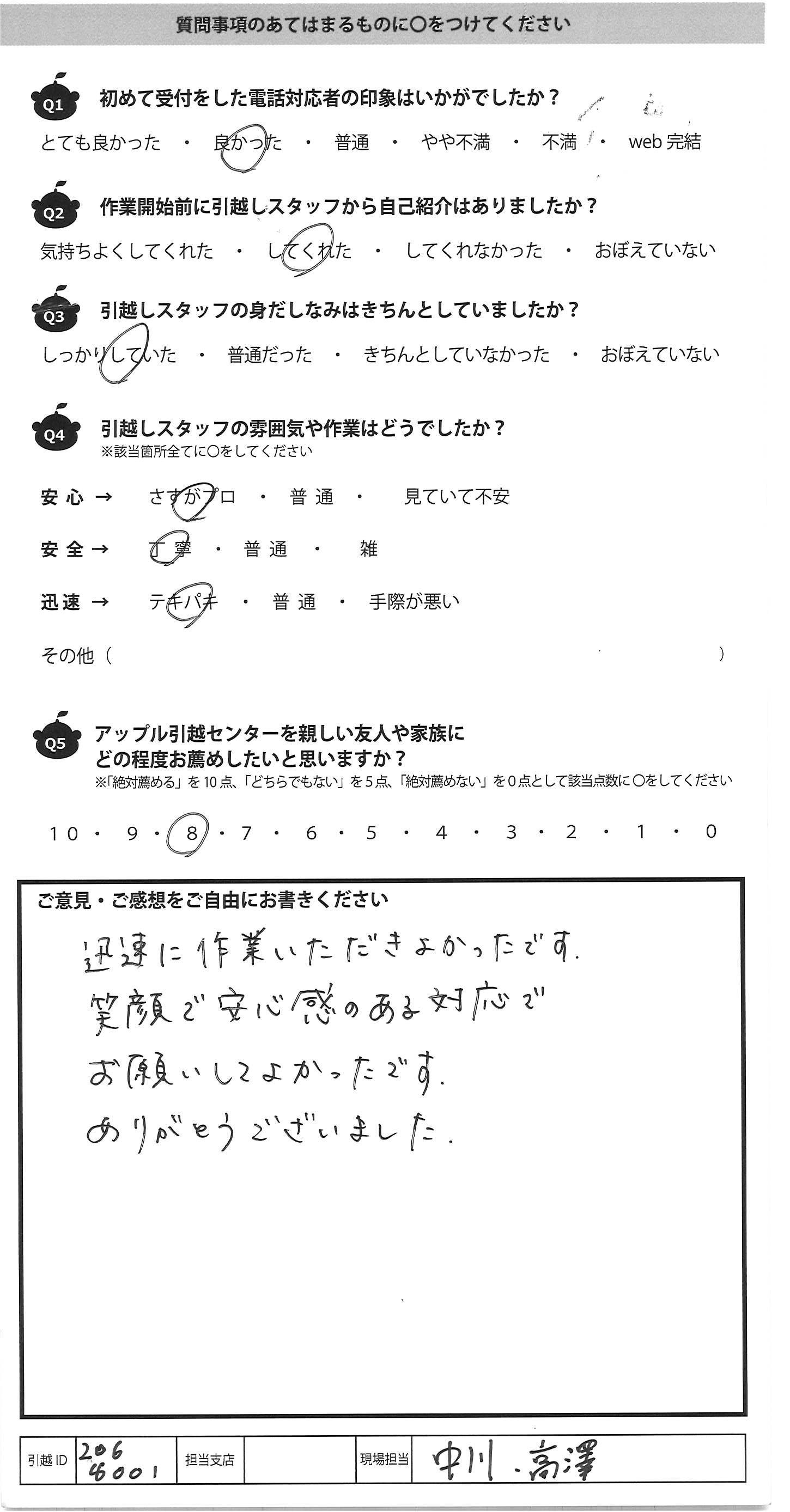 A.速く、そしてにこやかに対応いただき 気持ちよく引越しをすることができました ありがとうございました