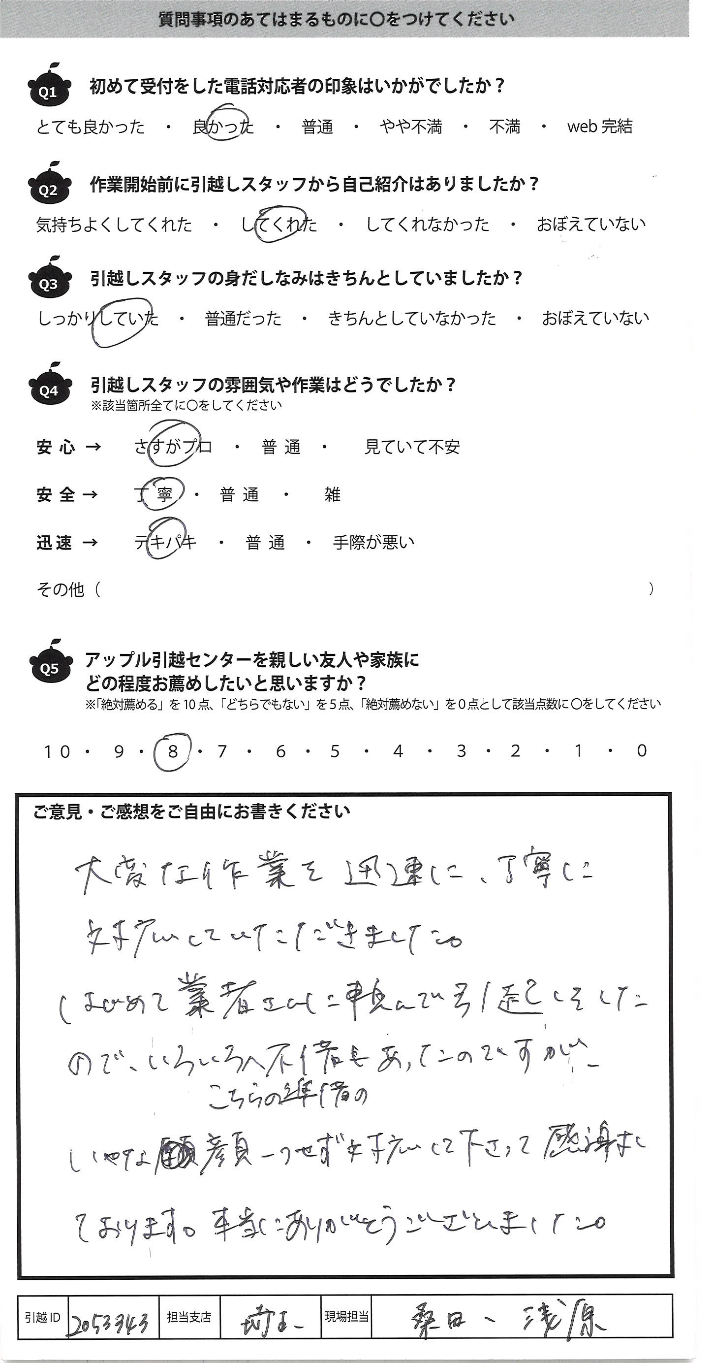 A.大変な作業を迅速に丁寧に 対応していただきました はじめて業者さんに頼んで引越しをした のでいろいろ不備もあったのですが いやな顔一つせず対応して下さって感謝 しております。本当にありがとうございました