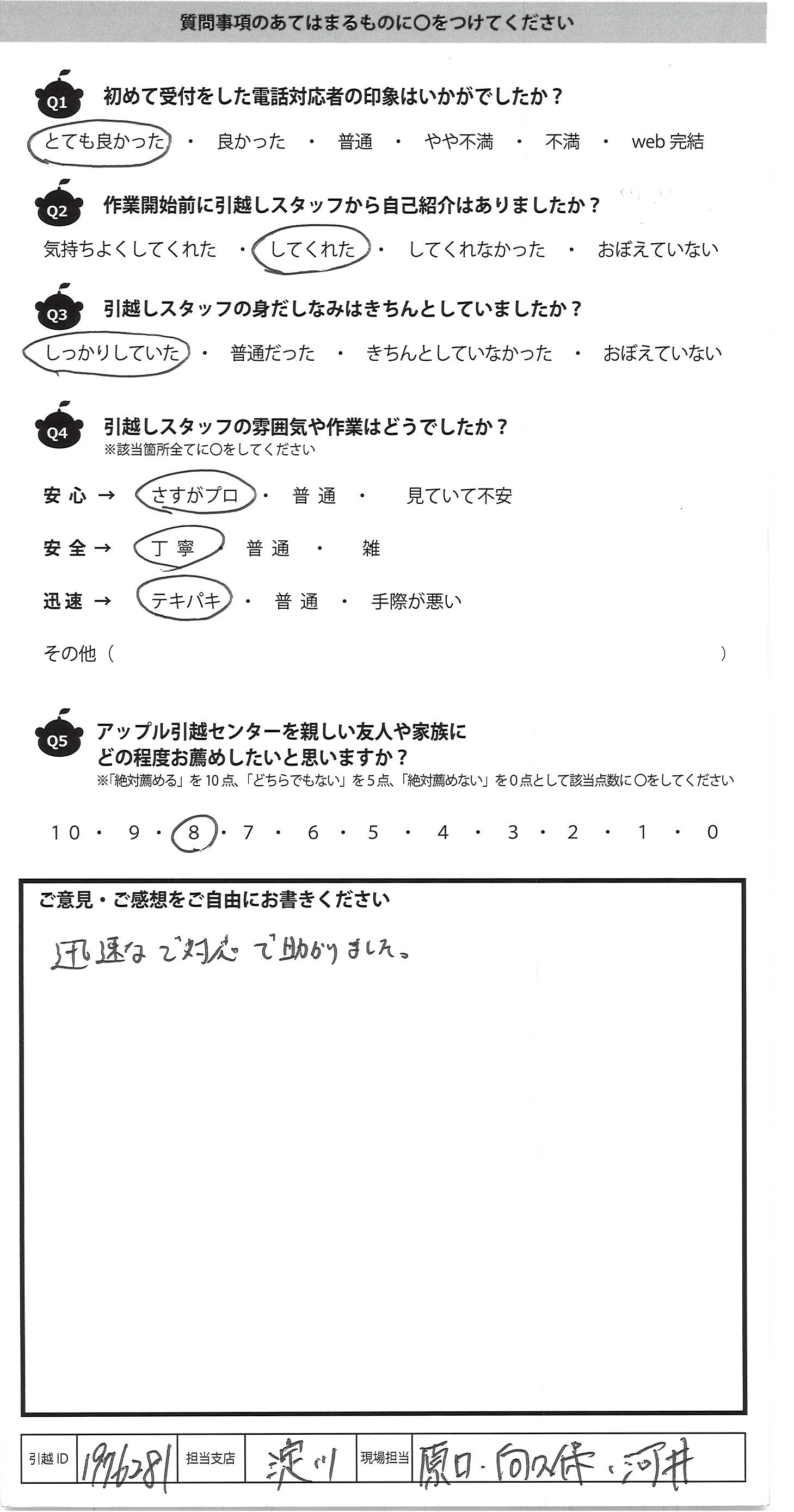 A.引越し元も引越し先もエレベーターの無い3階で大変だったと思いますが、丁寧迅速に対応いただきました。ありがとうございました!