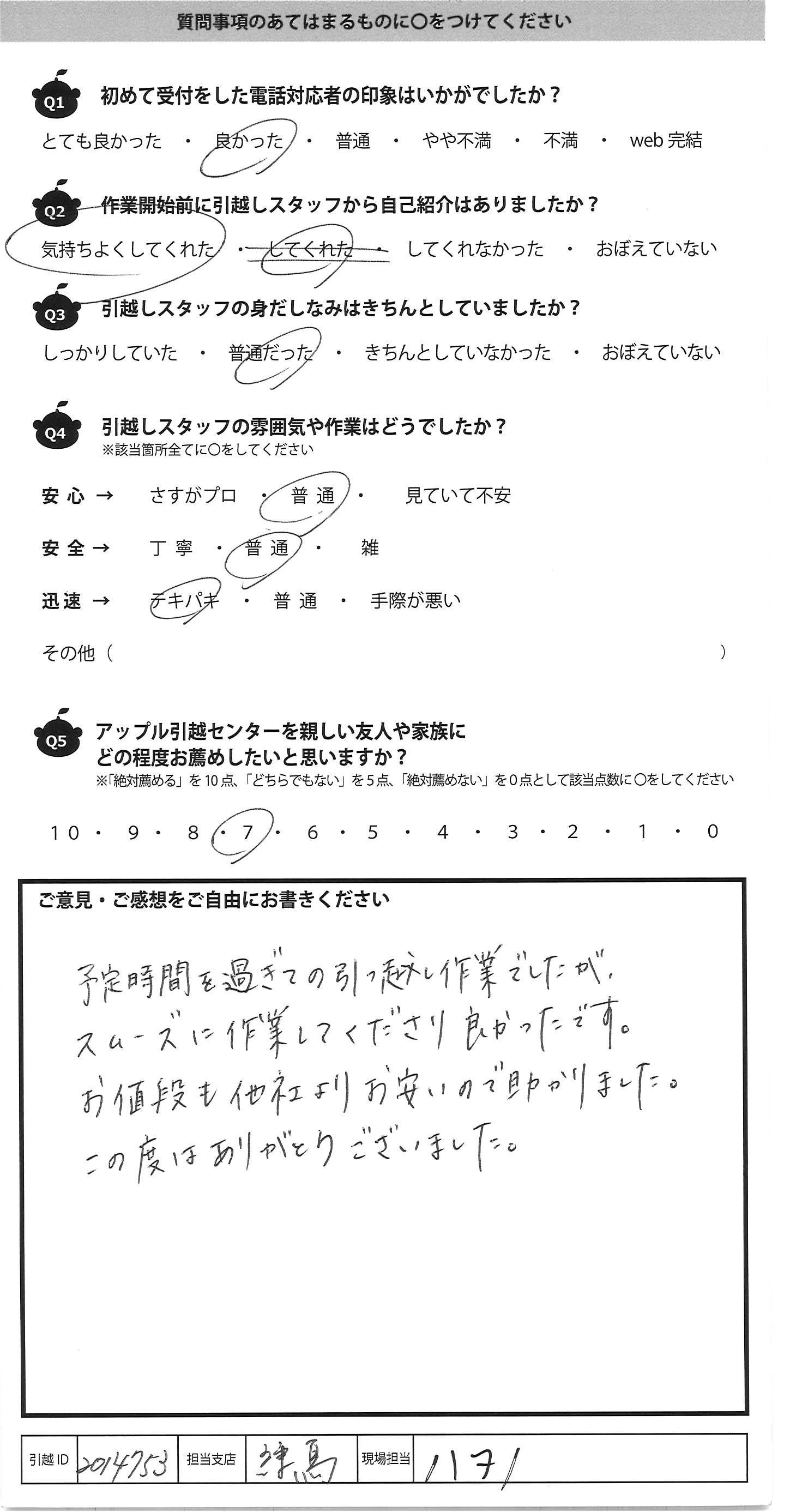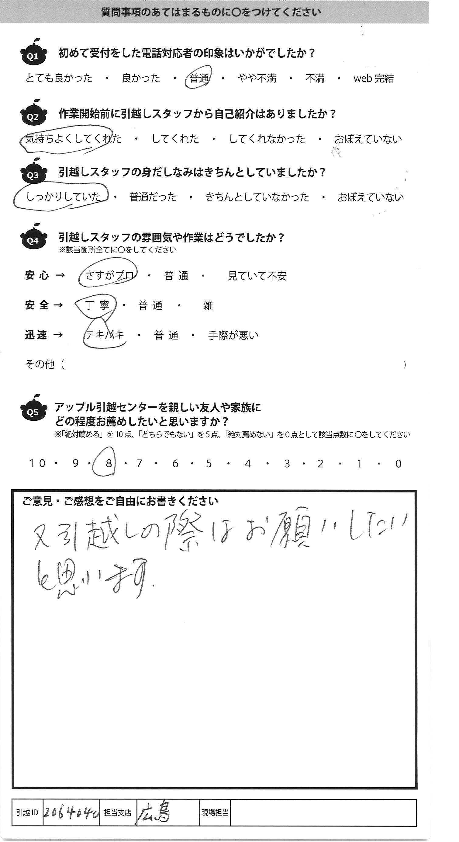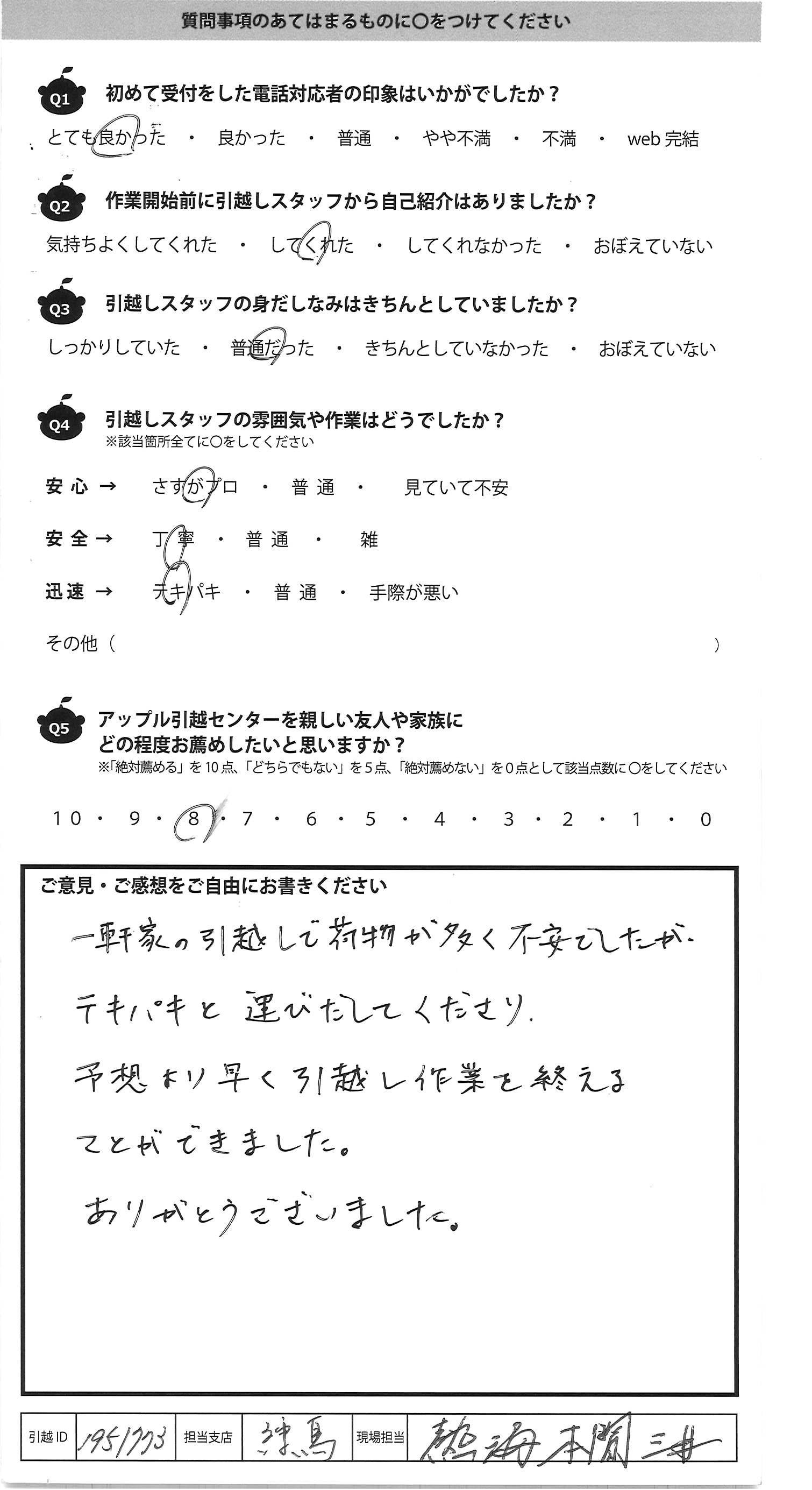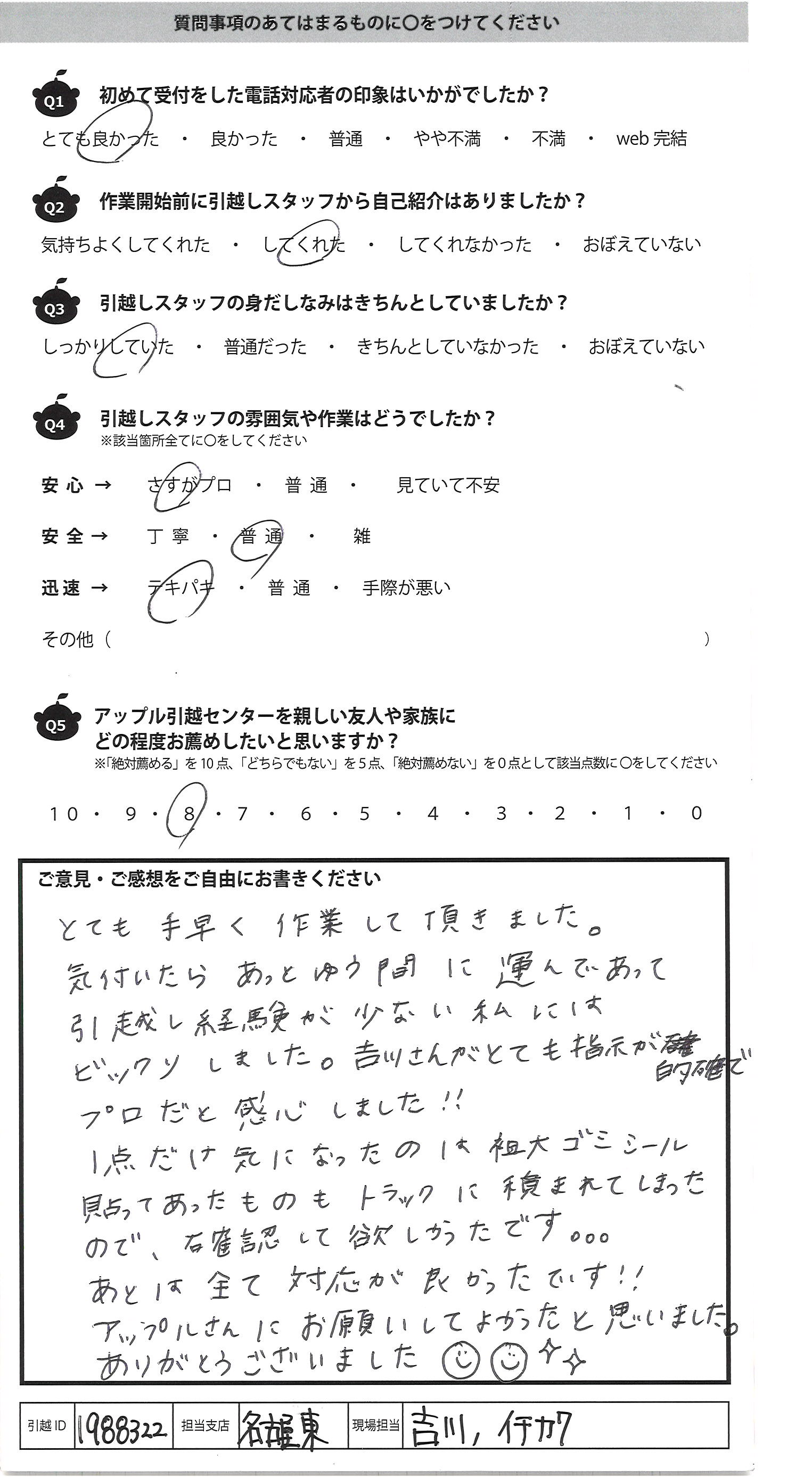 A.とても手早く作業して頂きました 気付いたらあっとゆう間に運んであって 引越し経験が少ない私には ビックリしました。吉川さんがとても指示が的確え プロだと感心しました!! 1点だけ気になったのは粗大ゴミシール 貼ってあったものもトラックに積まれてしまったので 、確認して欲しかったです・・・ あとは全て対応が良かったです!! アップルさんにお願いしてよかったと思いました ありがとうございました