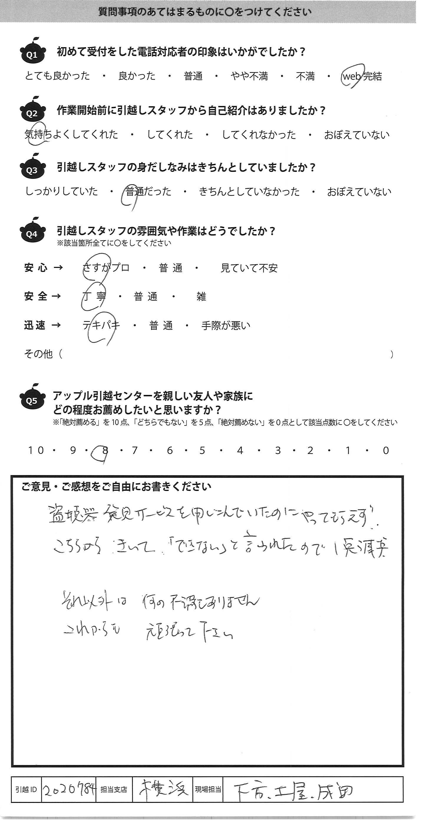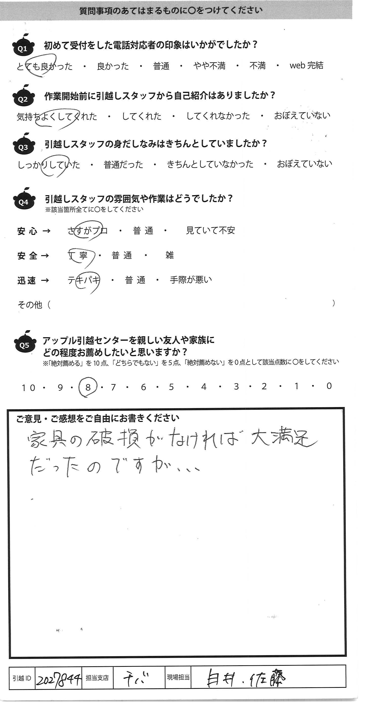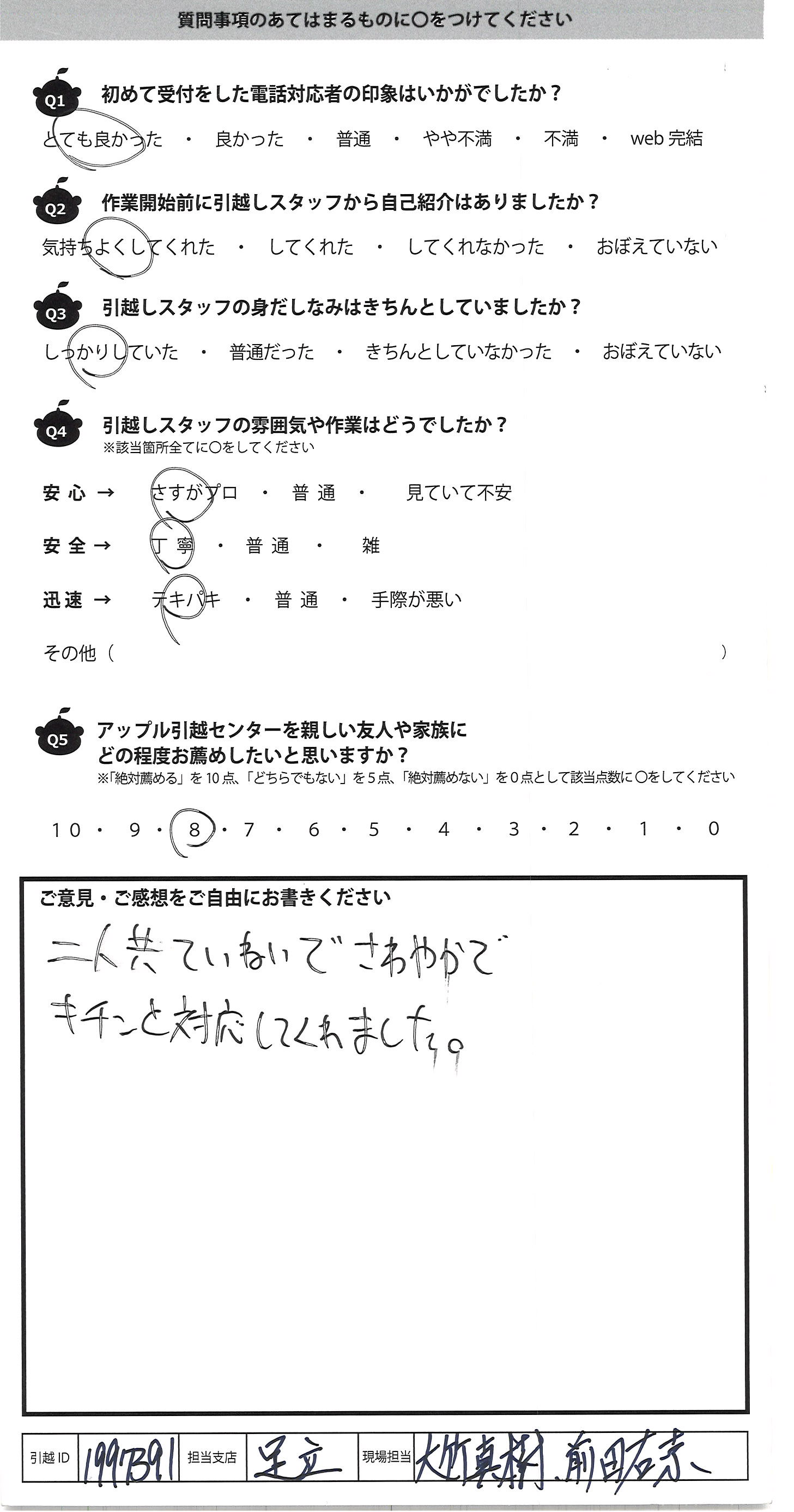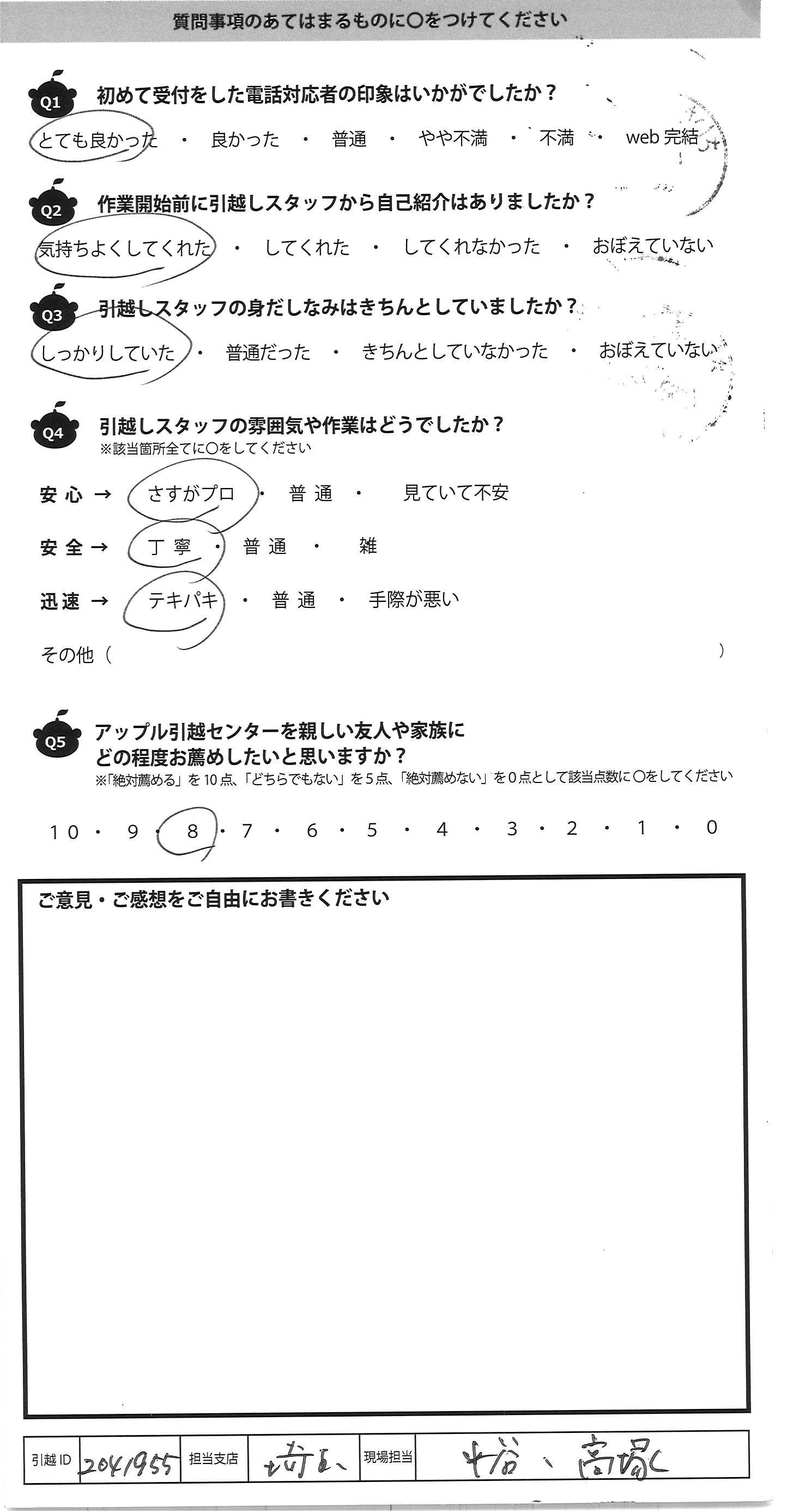A.とても手早く作業して頂きました 気付いたらあっとゆう間に運んであって 引越し経験が少ない私には ビックリしました。吉川さんがとても指示が的確え プロだと感心しました!! 1点だけ気になったのは粗大ゴミシール 貼ってあったものもトラックに積まれてしまったので 、確認して欲しかったです・・・ あとは全て対応が良かったです!! アップルさんにお願いしてよかったと思いました ありがとうございました